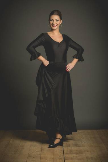 Long-sleeved leotard with gathered on the chest and ruffle on the sleeve, ideal for flamenco rehearsal