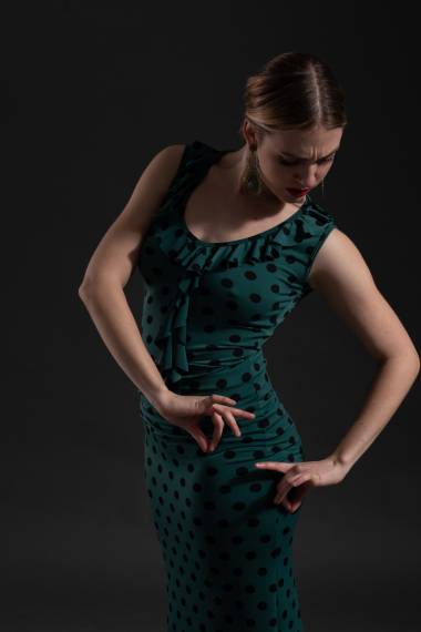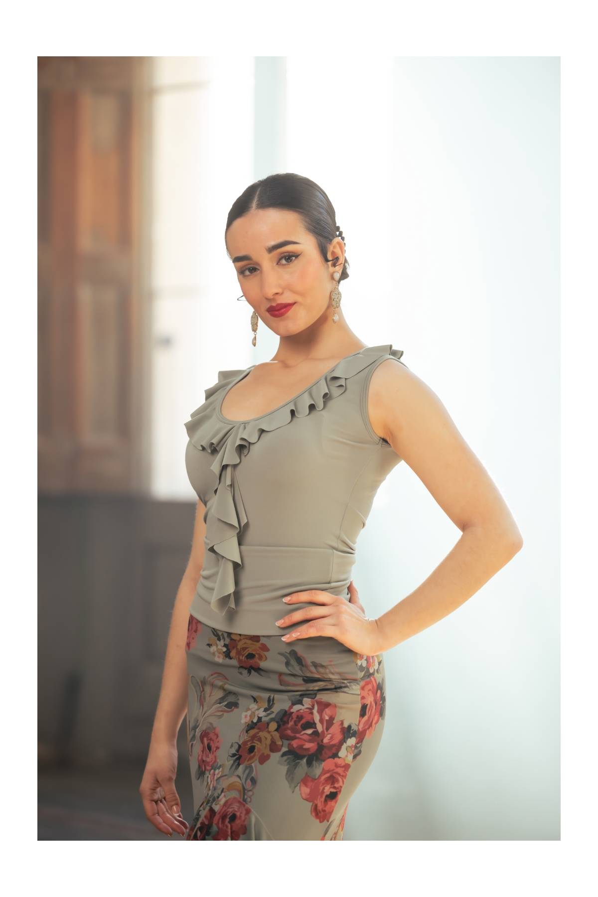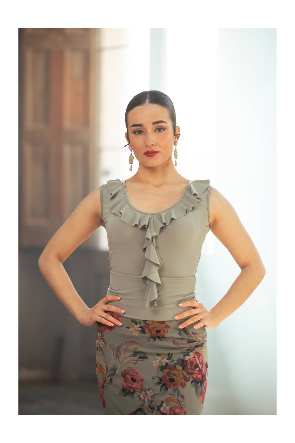 Short strappy top up to the hips with a U-neckline and frills plus frills at the center front. Neckline and armholes polished with piping.