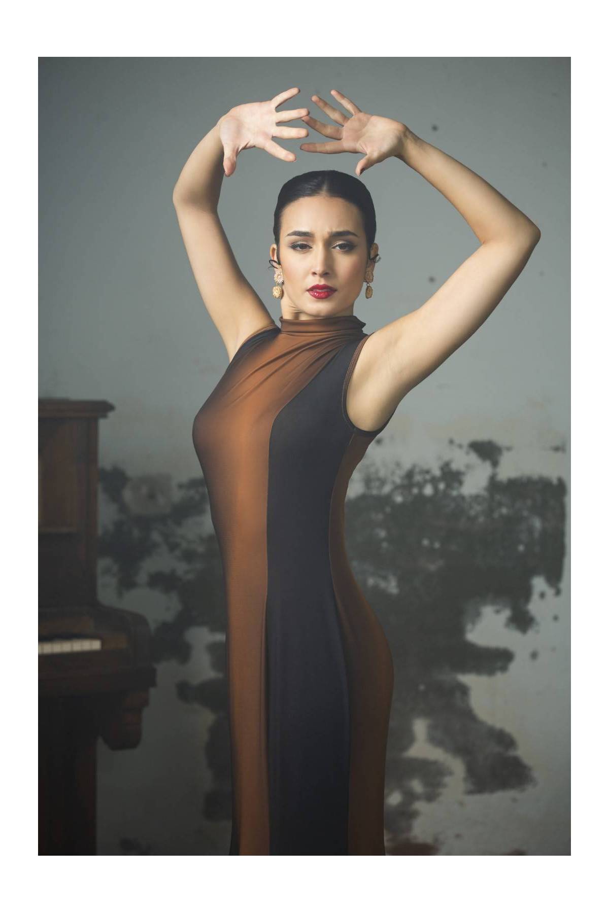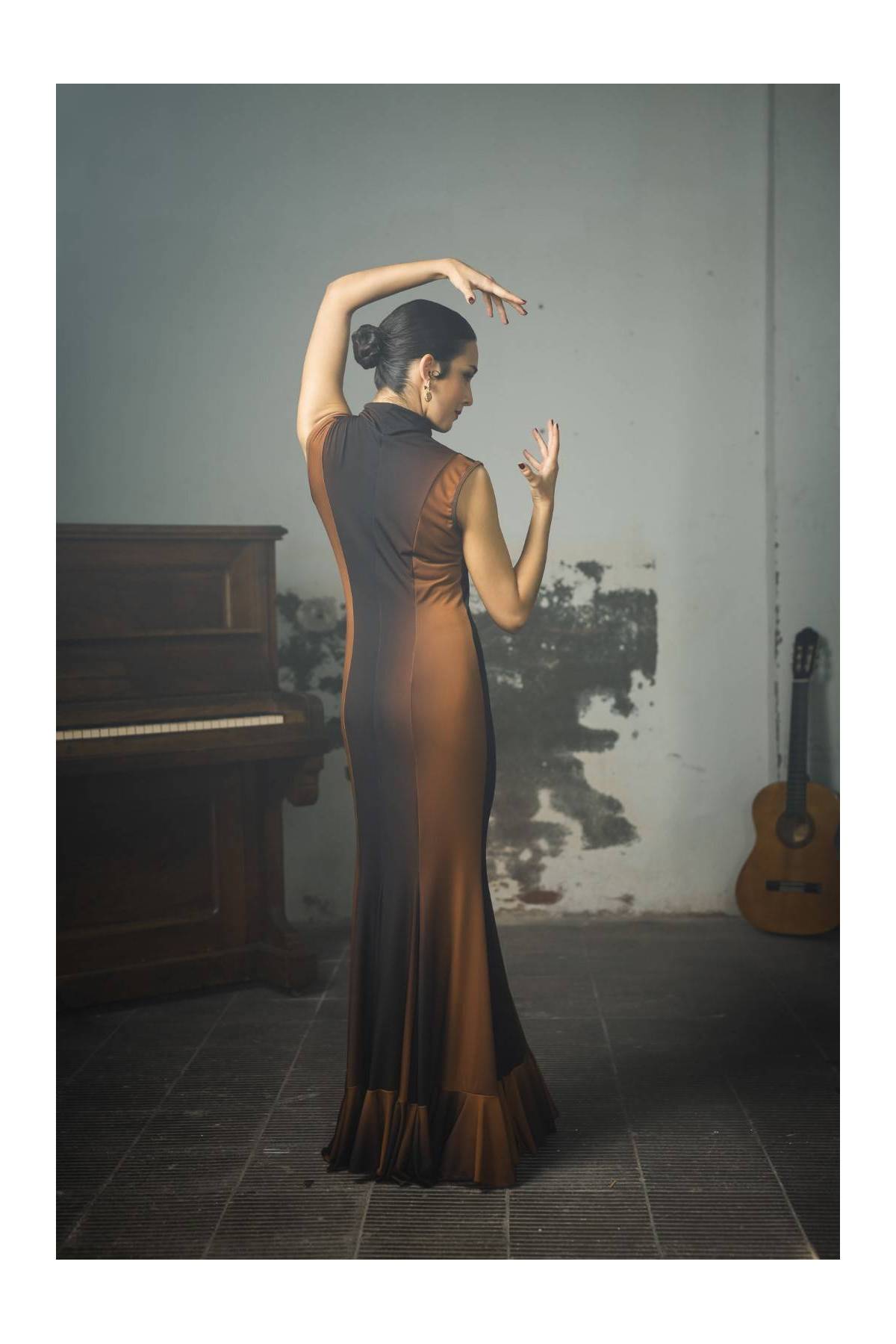 Long fitted dress with straps and selvedges. Long neck. Application of frills all around the hem.