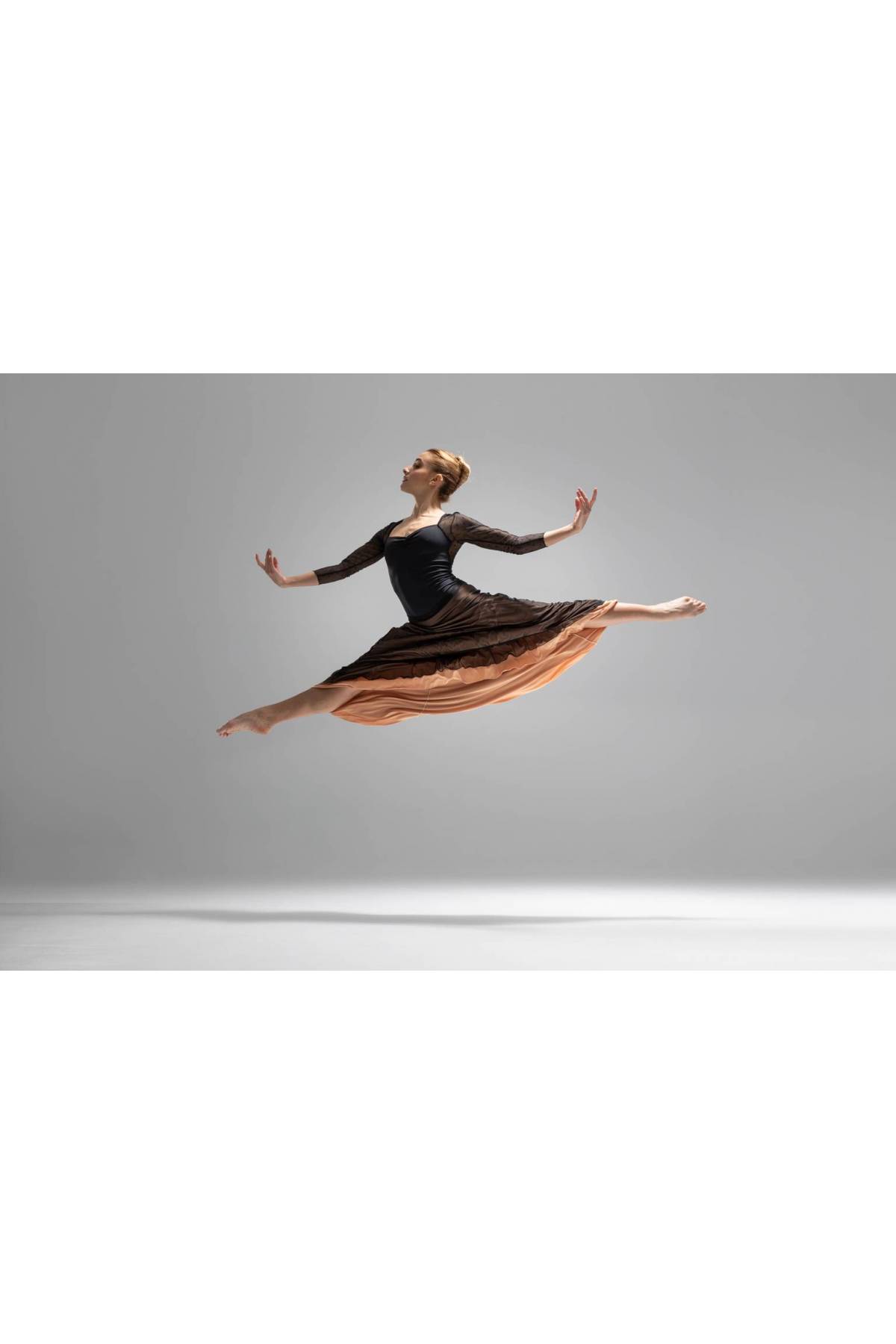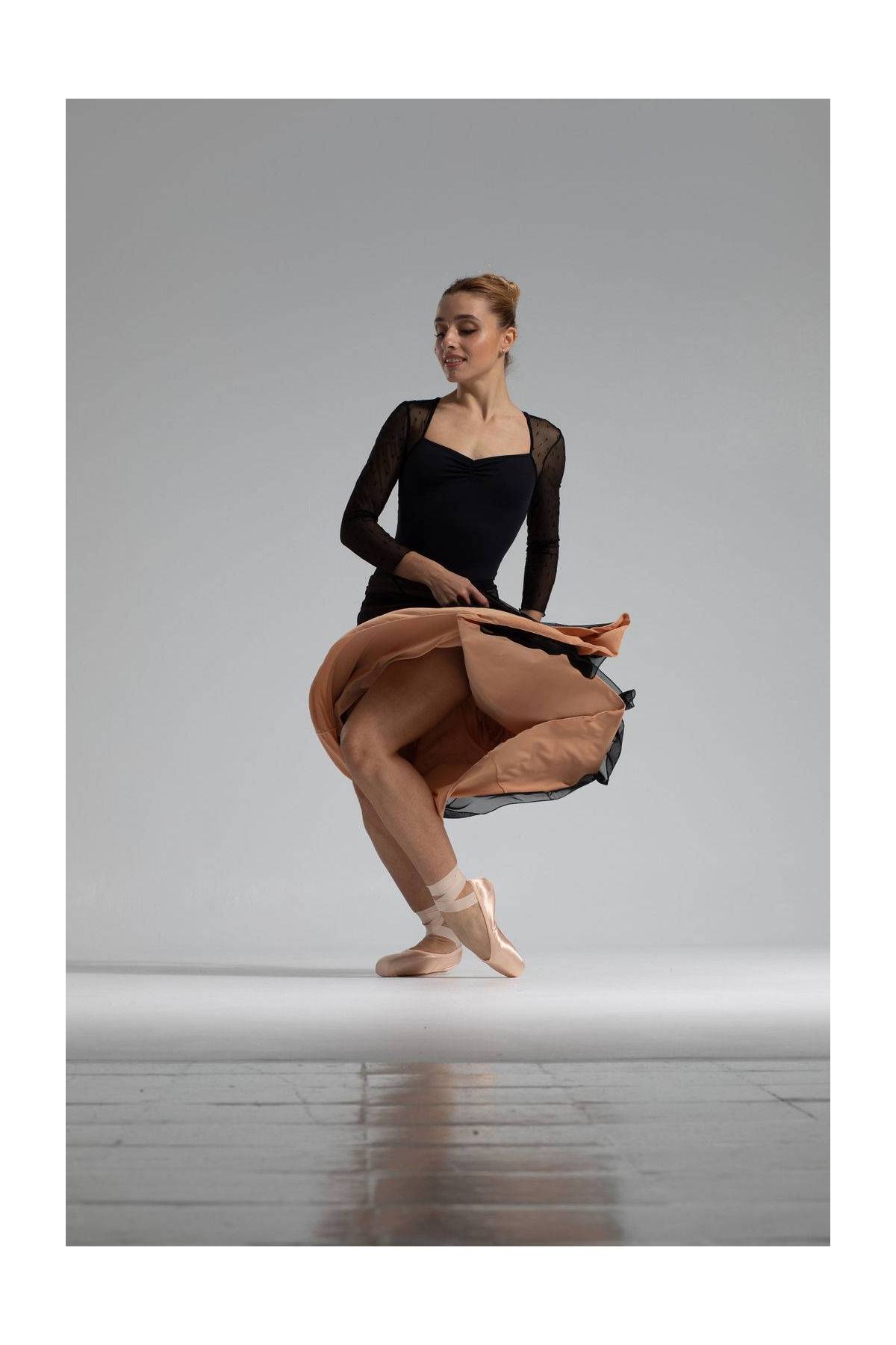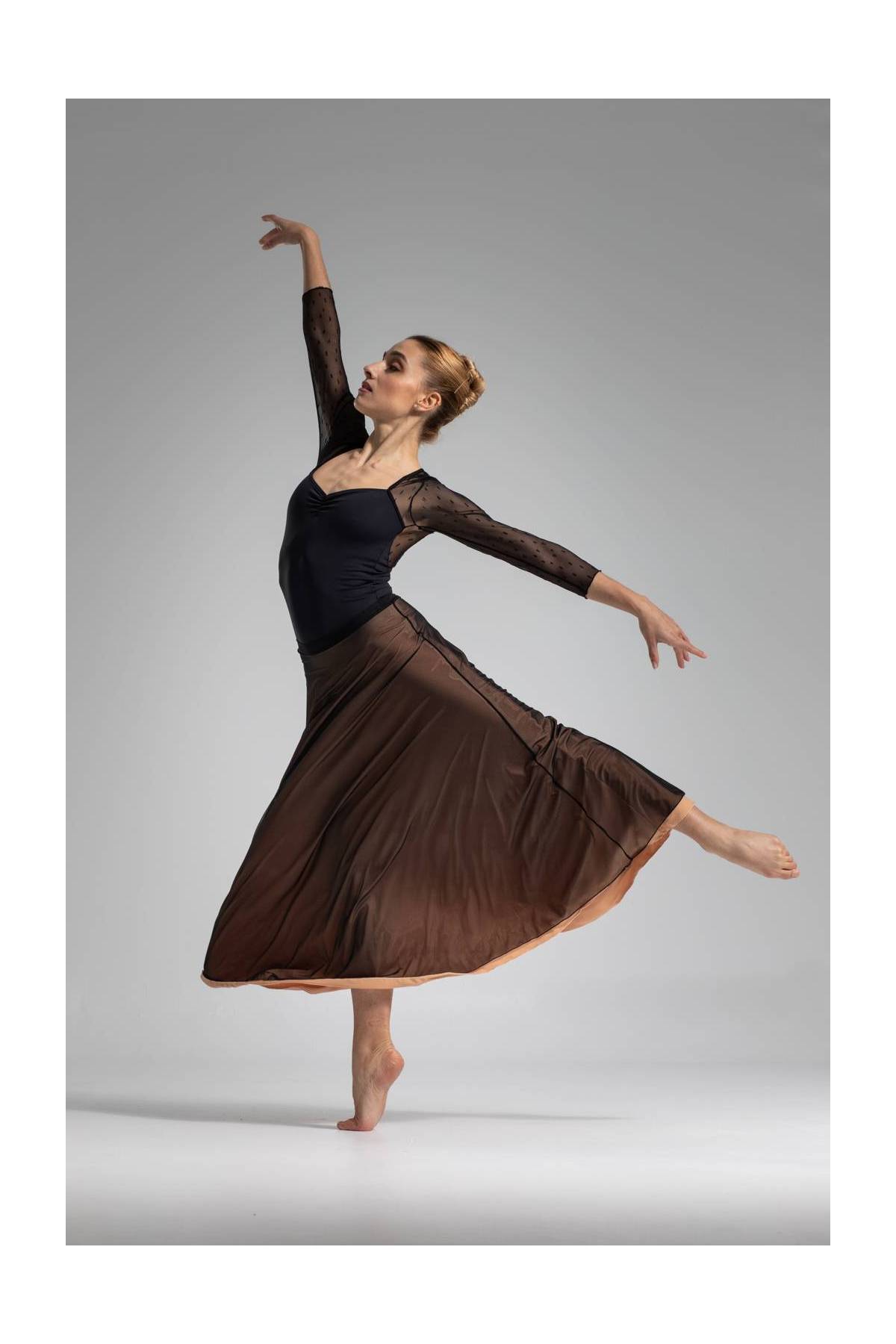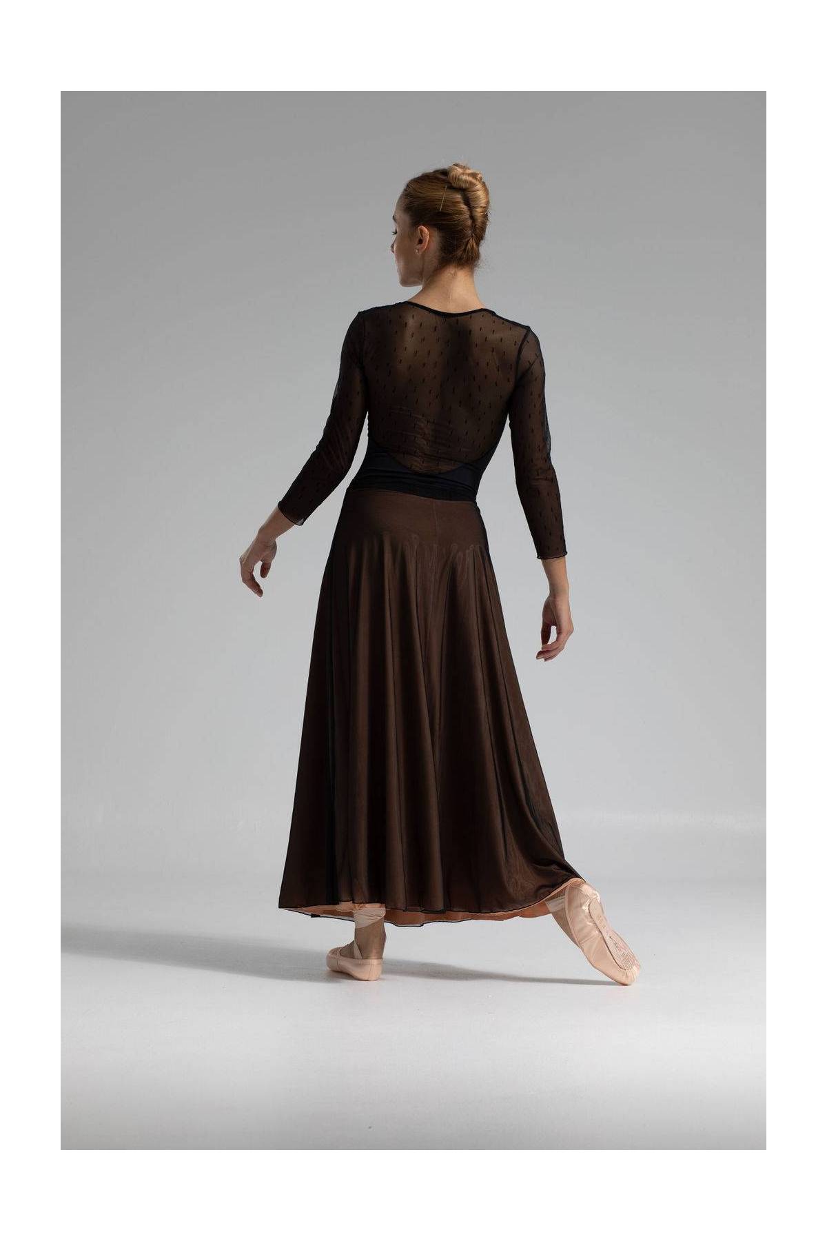 Long half-layer skirt to the ankles in tulle and alternative fabric. 2.5 cm wide waistband. Polished basses.