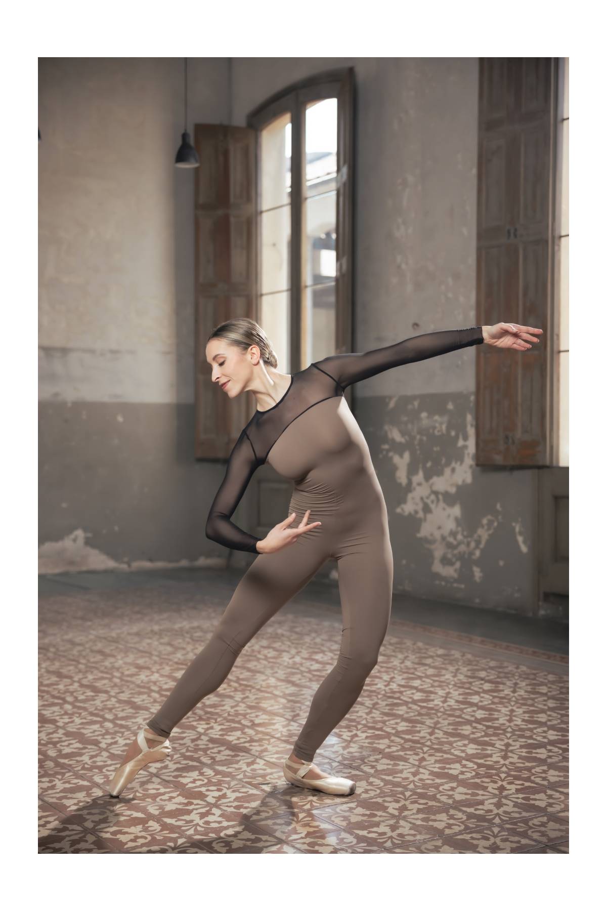 Long-sleeved jumpsuit with a straight neckline. Tulle round neck. Teardrop back fastened with a snap button.