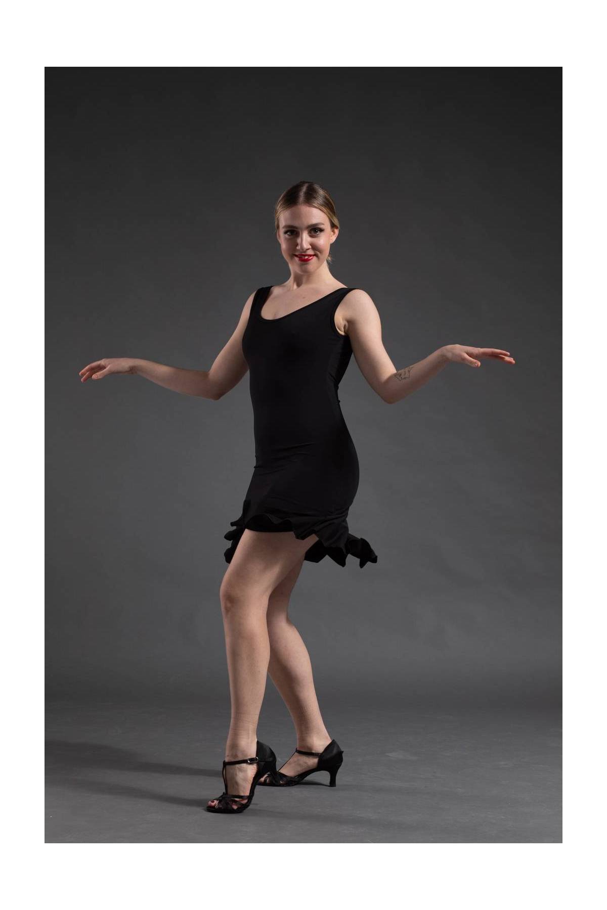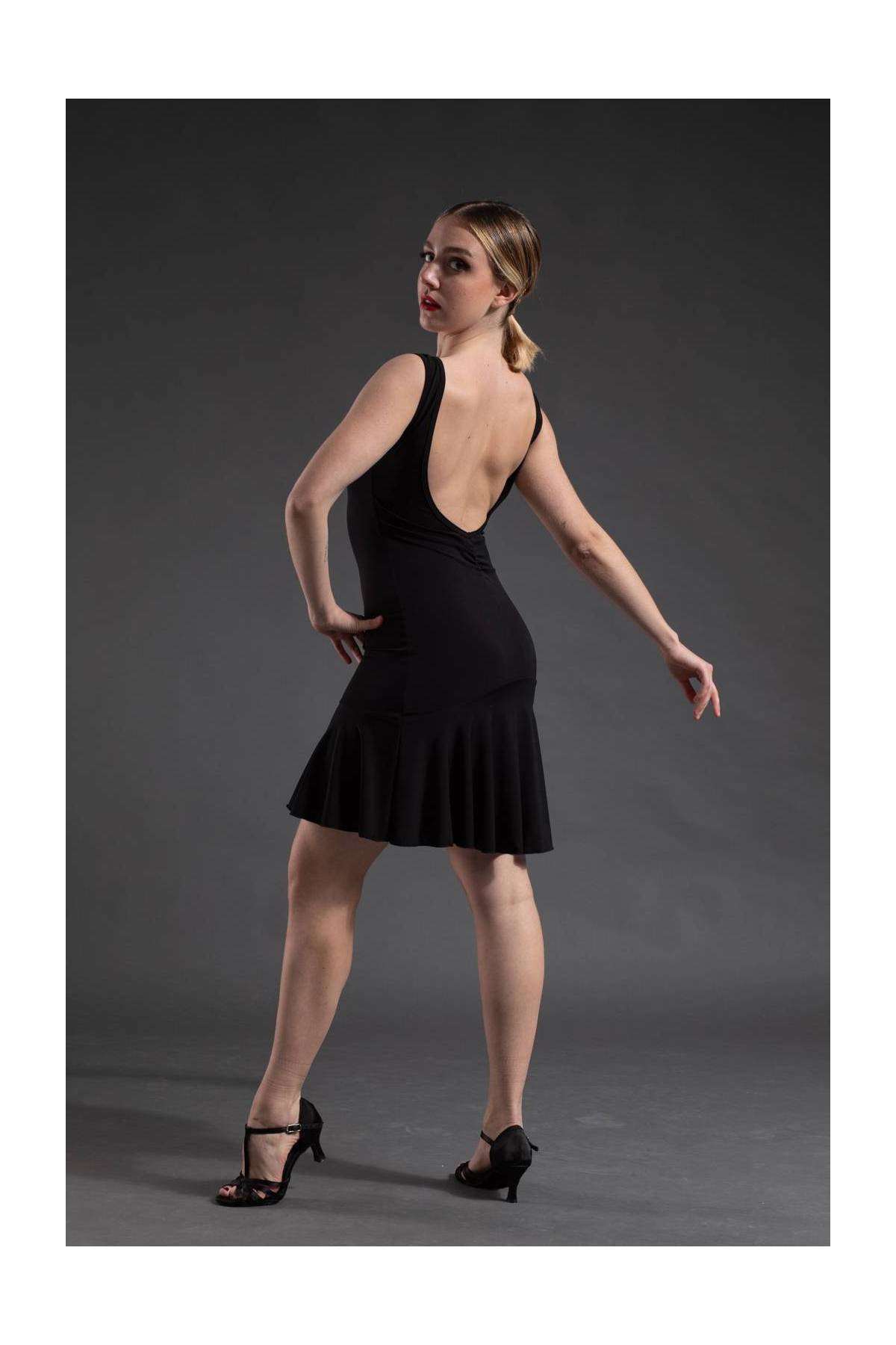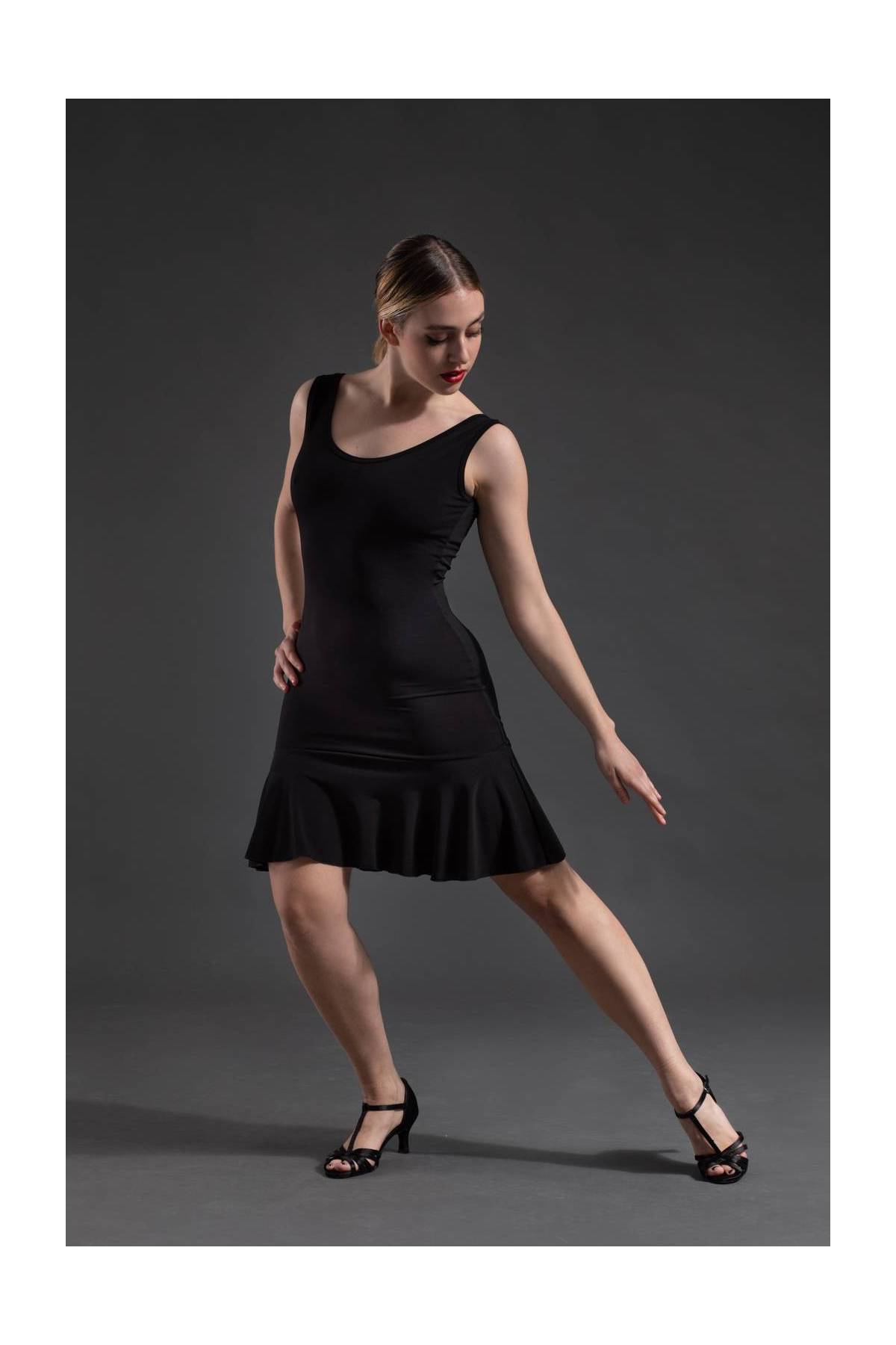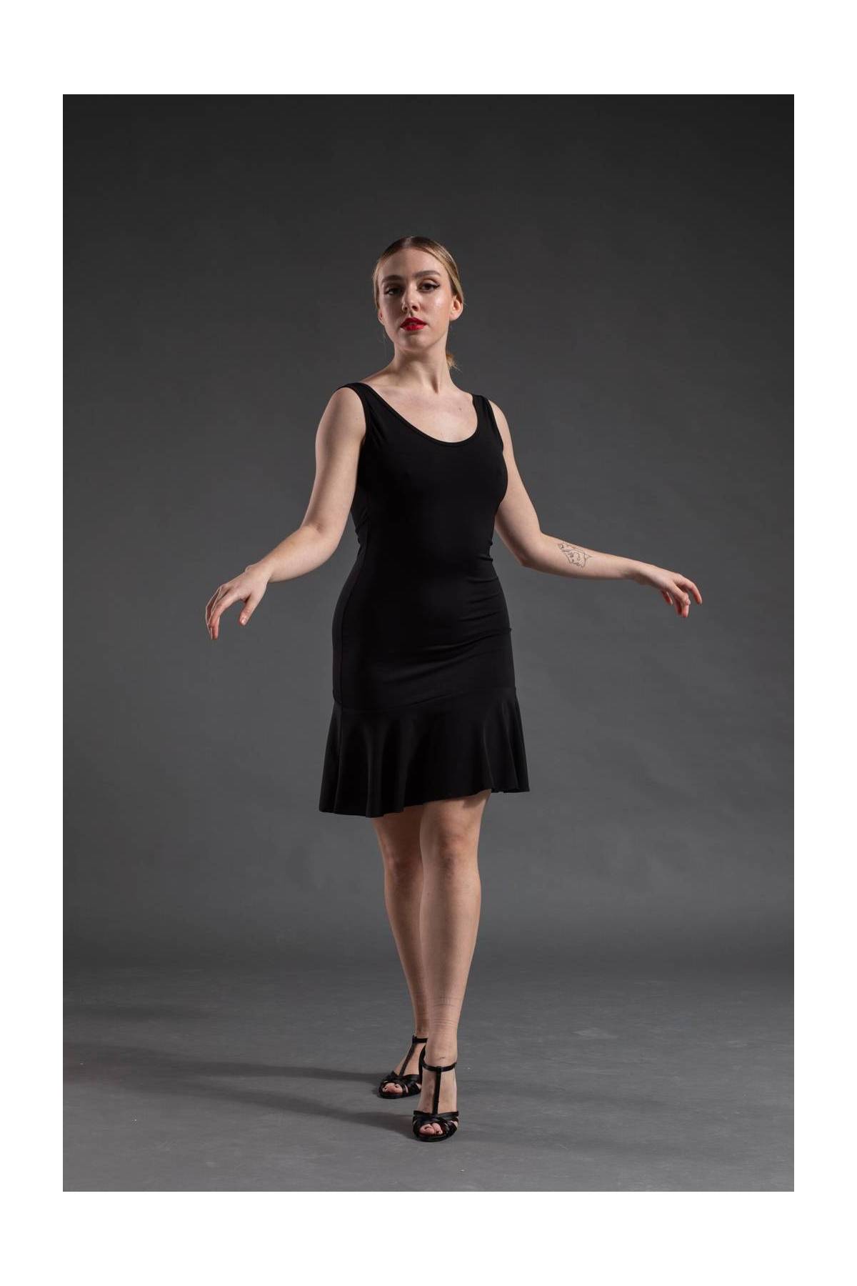 Short dress with straps above the knees. Ruffle at the bottom from 1/2 hip. Round neckline more pronounced at the back.