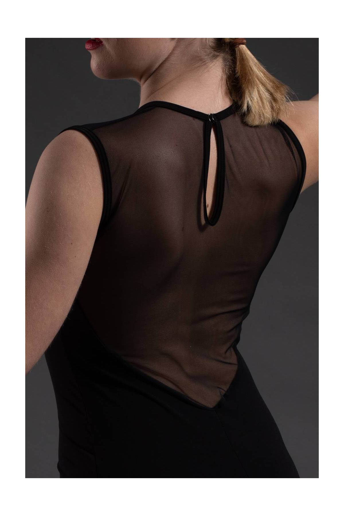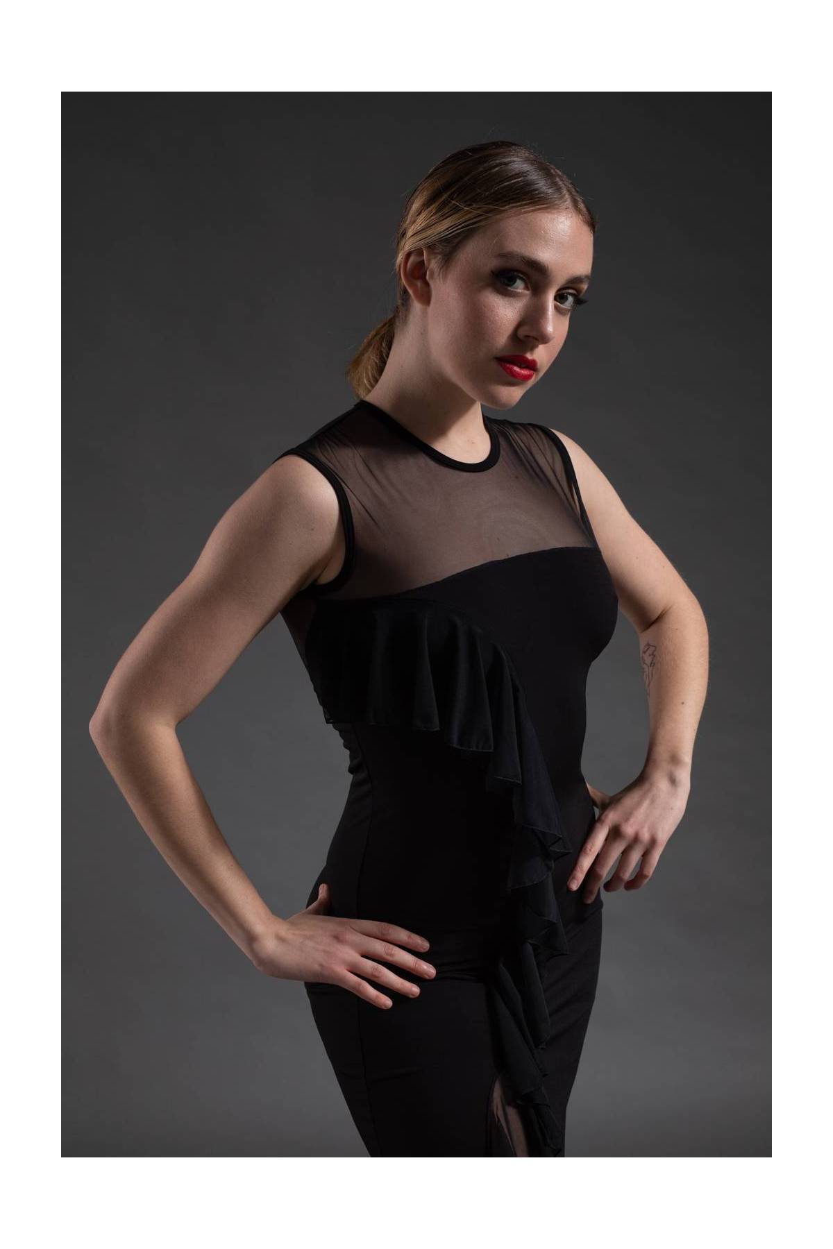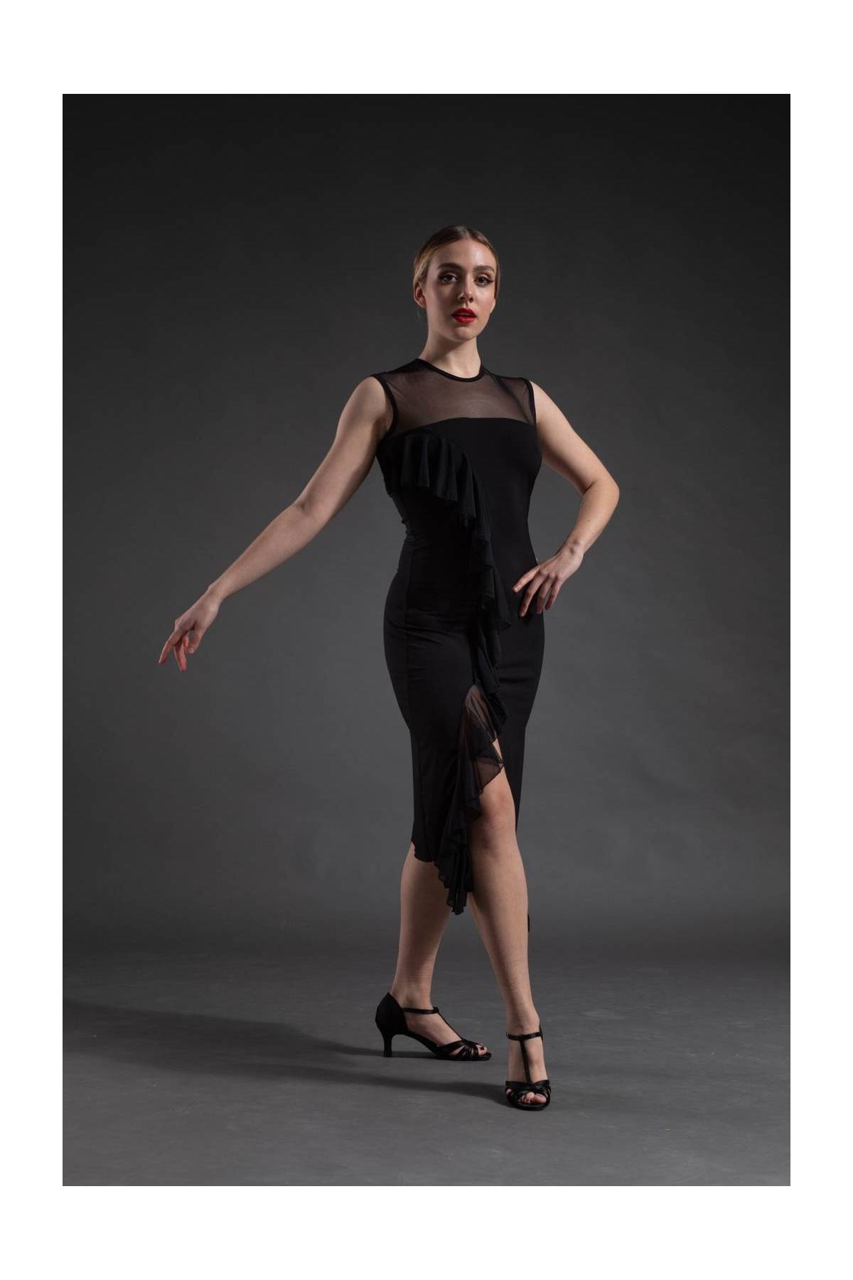 Asymmetric strappy dress. Round neckline. Ruffles on the front and opening on the right