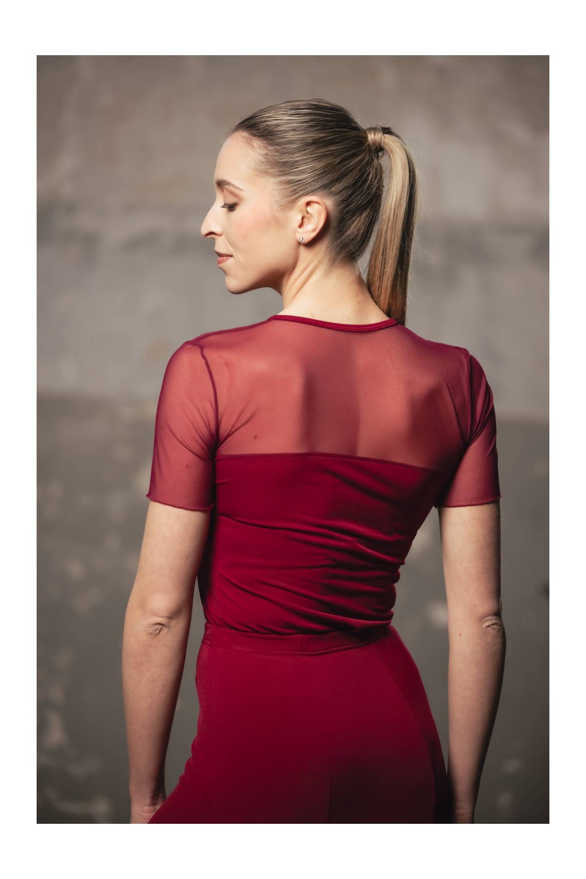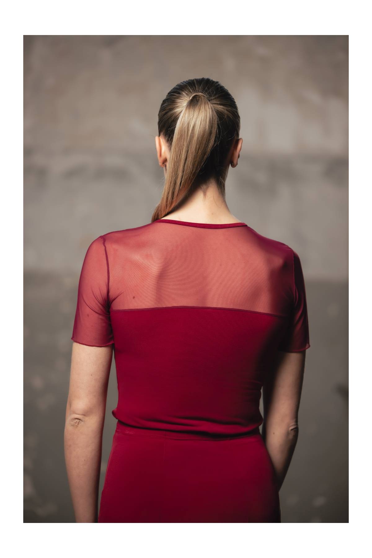 Crop top with illusion neckline in tulle stretch. Short sleeve.