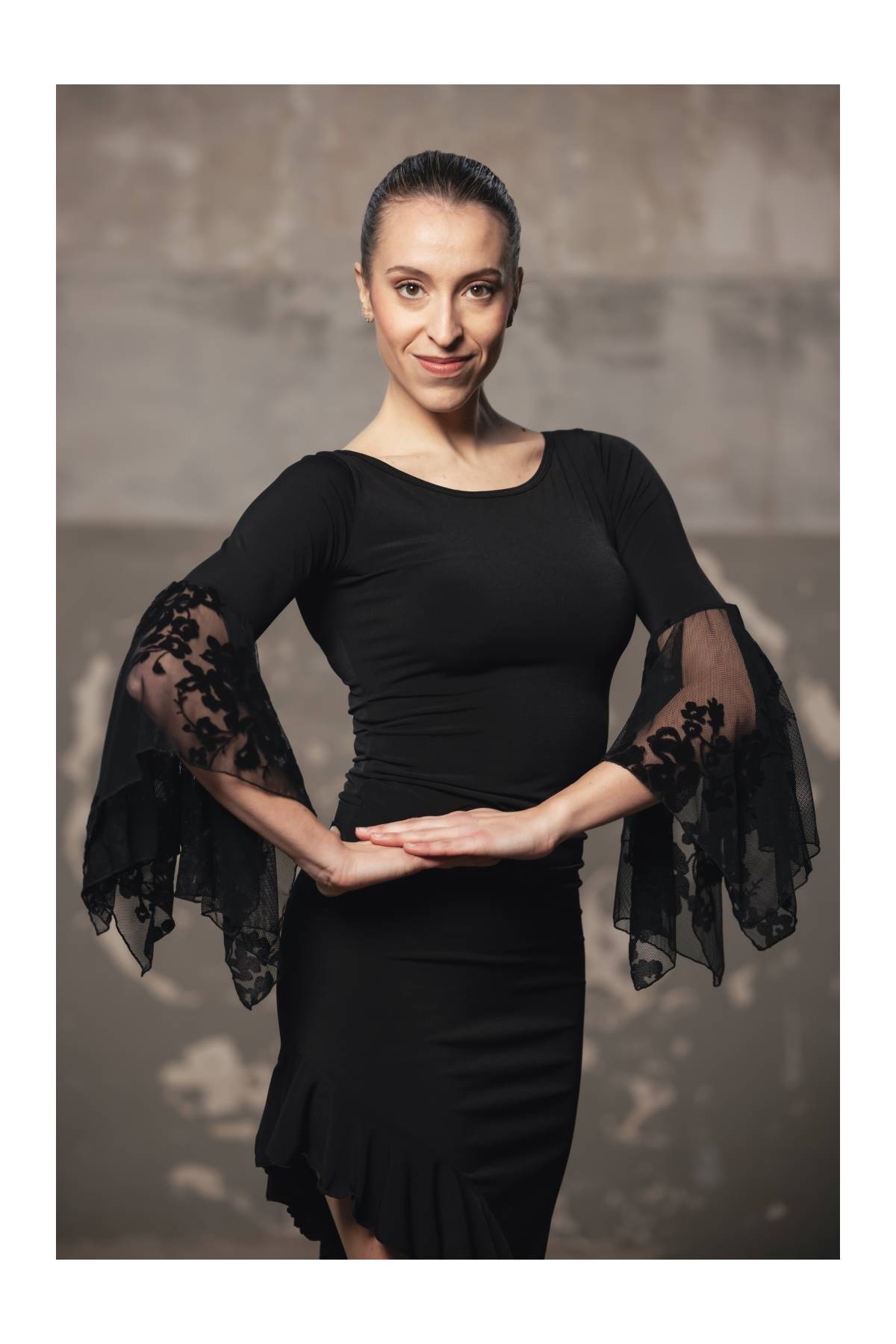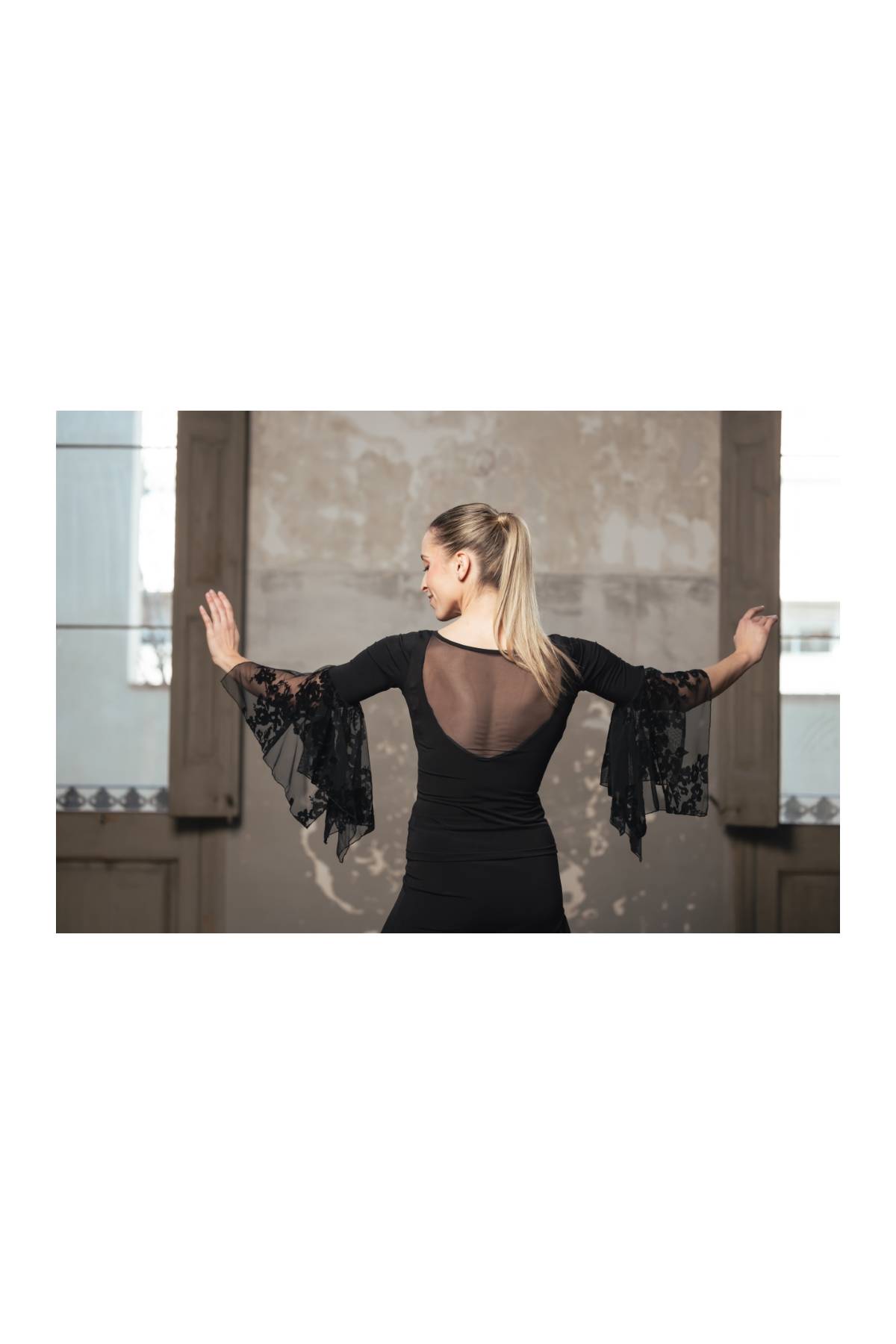 Top with printed tulle stretch ruffles on the sleeve and tulle stretch application on the back.