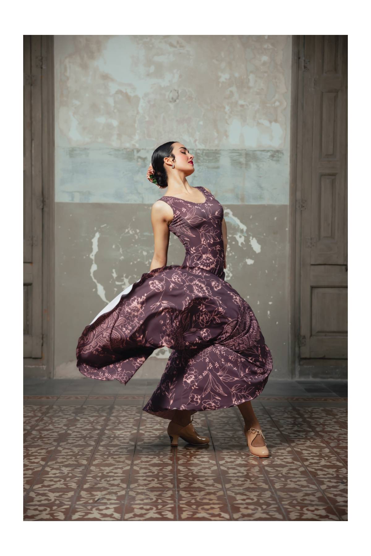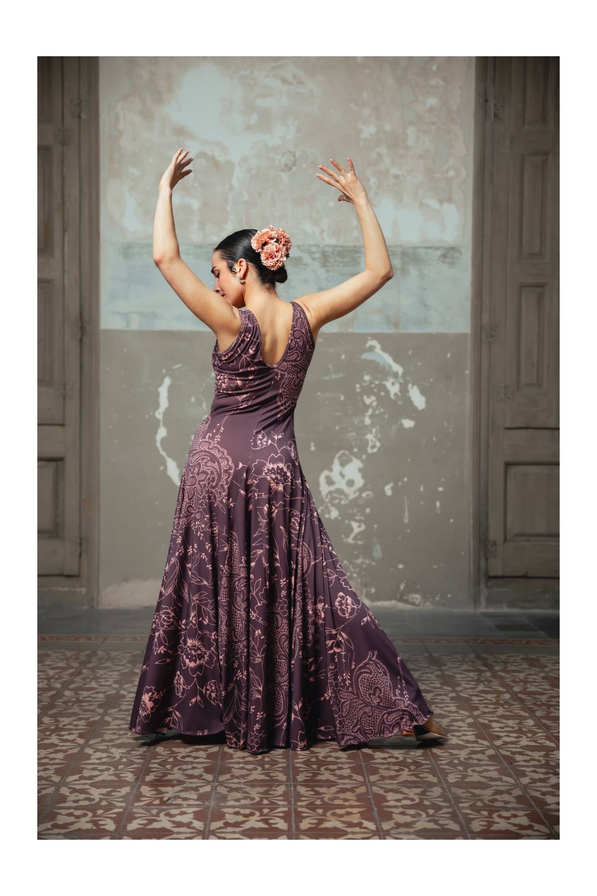 Strapless dress, floor-length. Two godets on the sides and one at the center of the back. Round neckline at the front and back.