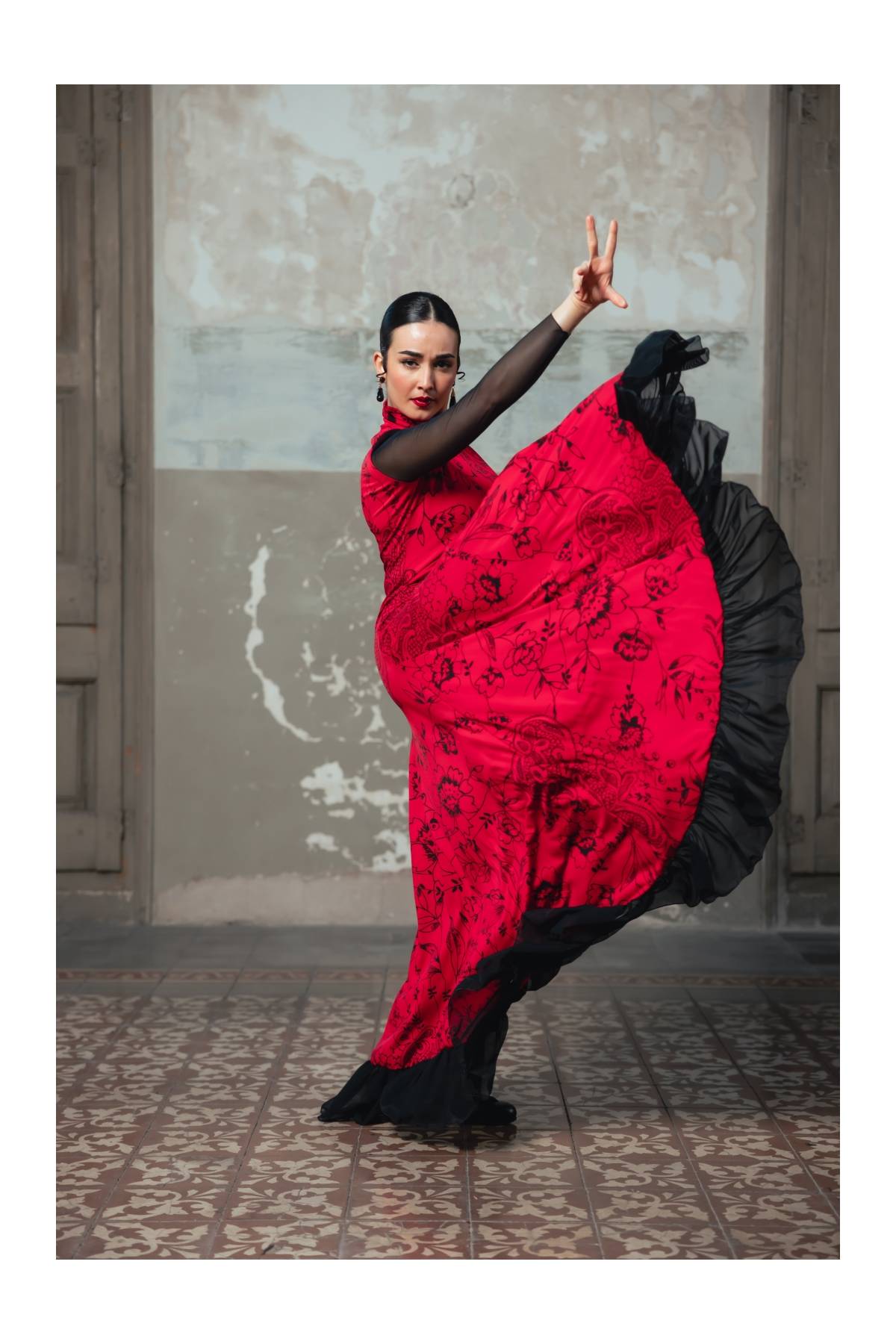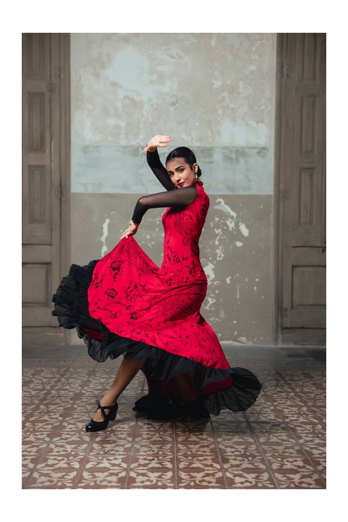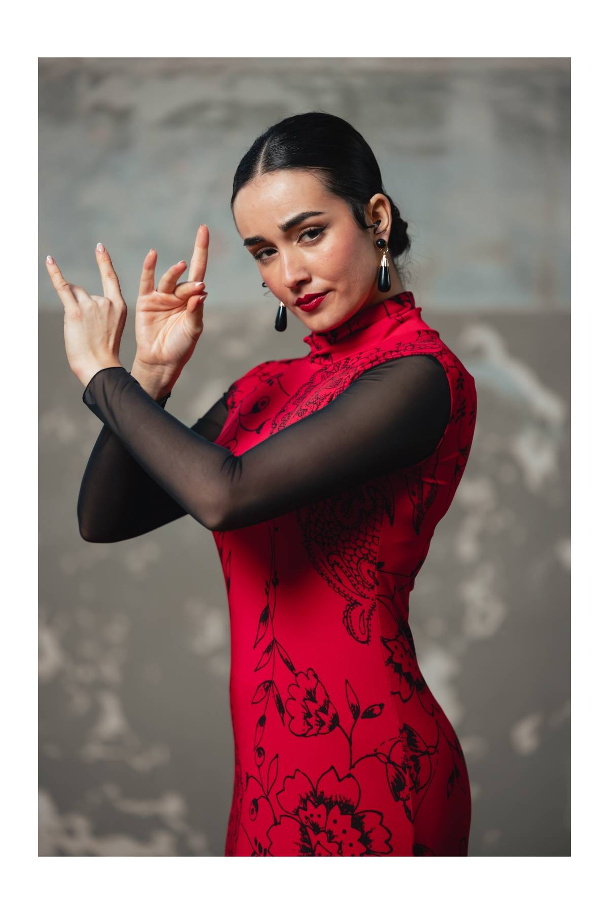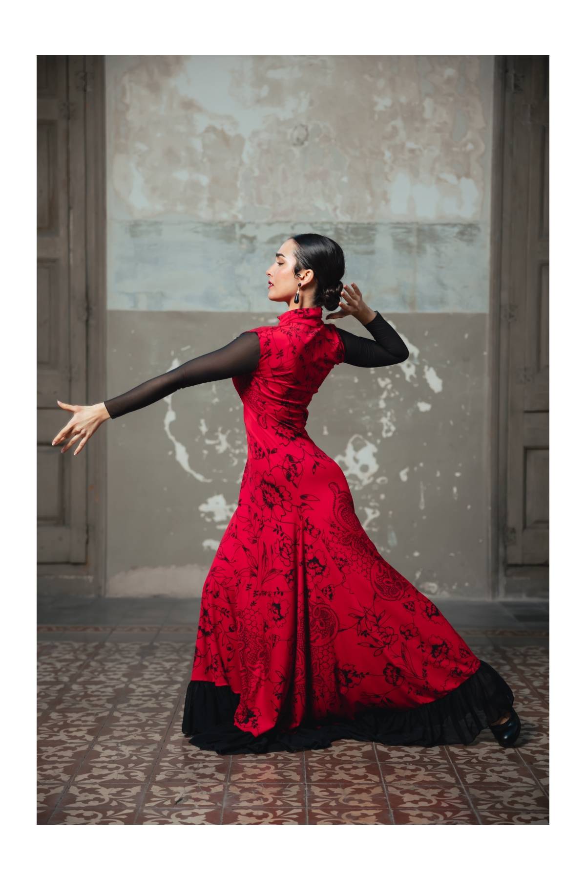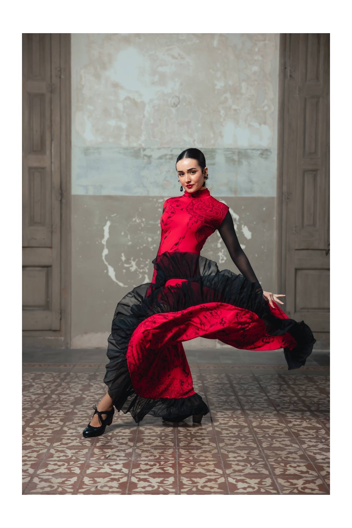 Long dress to the floor with a high neckline. Long tulle sleeves. Entire hem with tulle ruffles. Two godets on the sides and one at the center of the back.