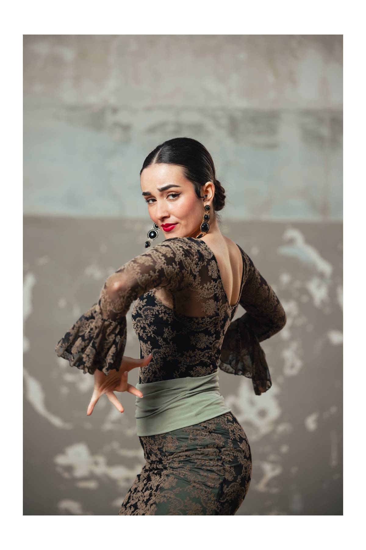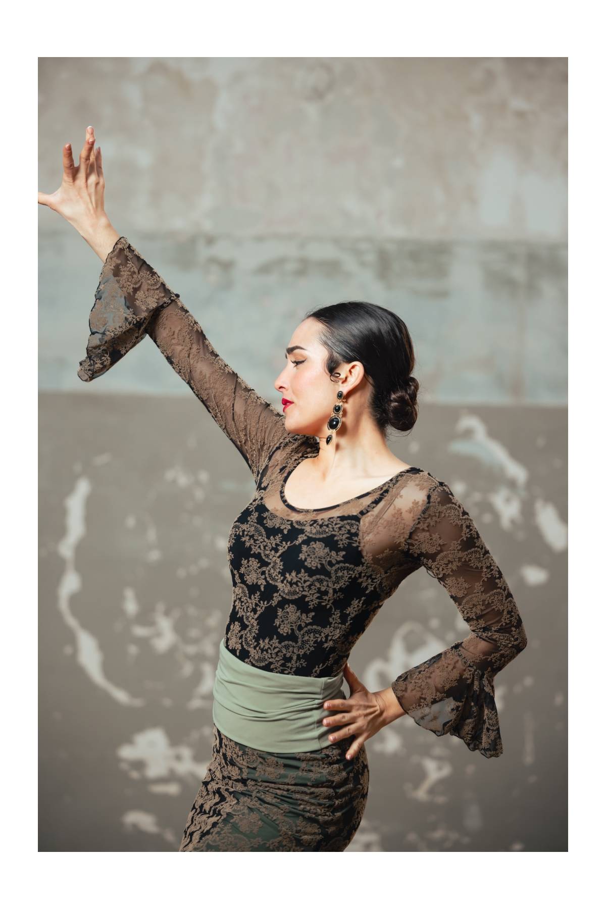 Long-sleeved body with 3/4 sleeves and ruffles at the hem. Round neckline, deeper at the front and back.