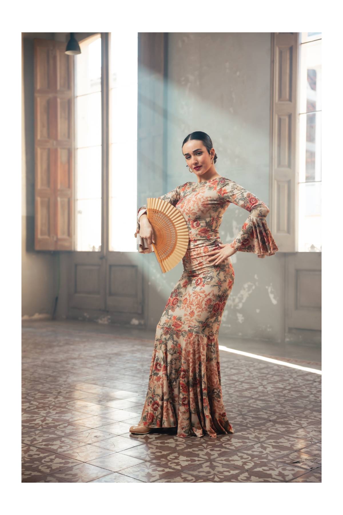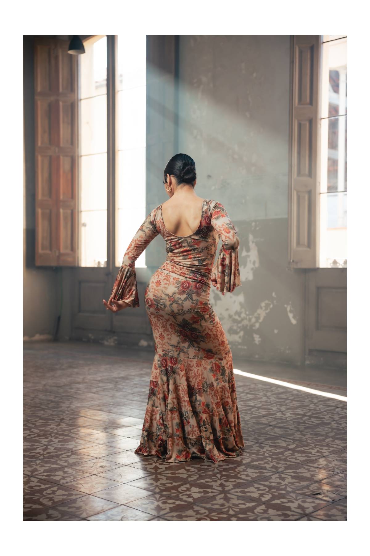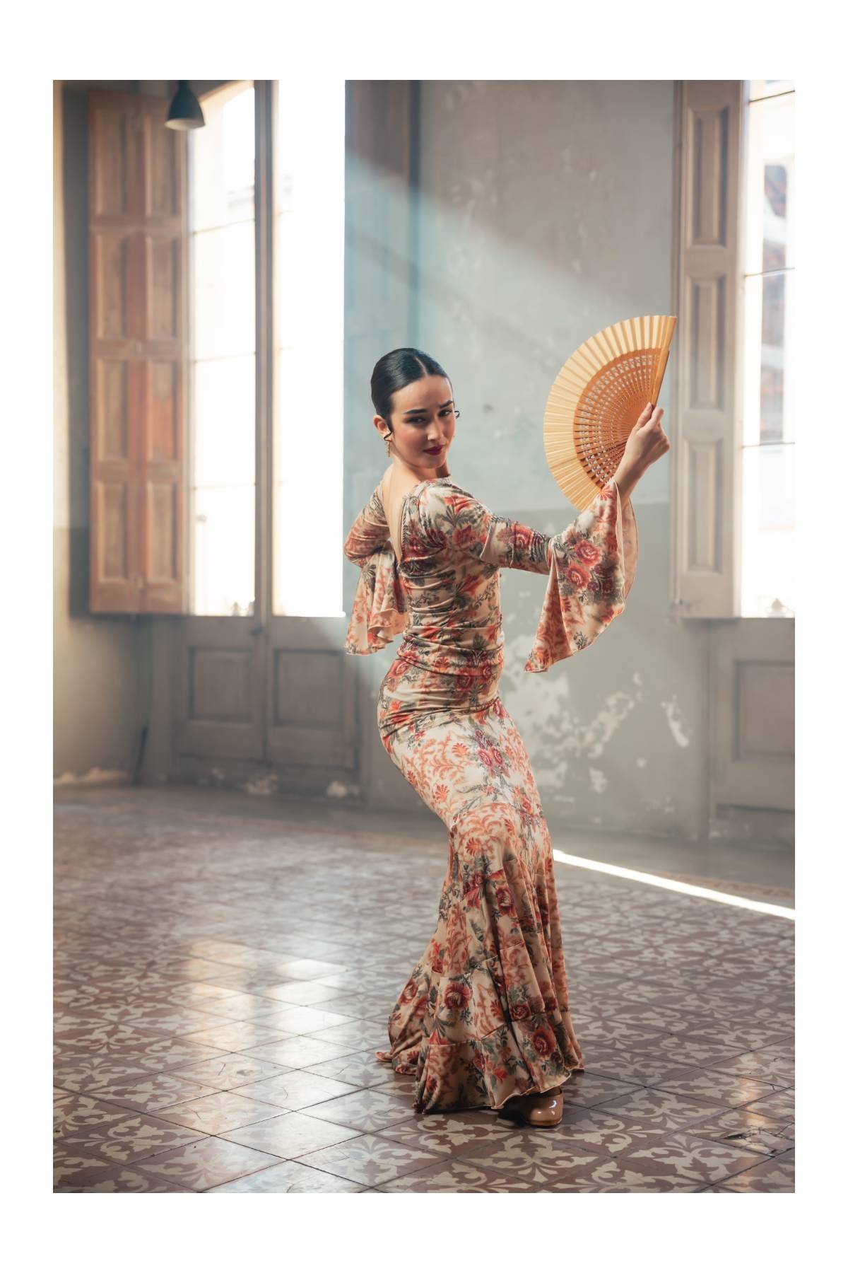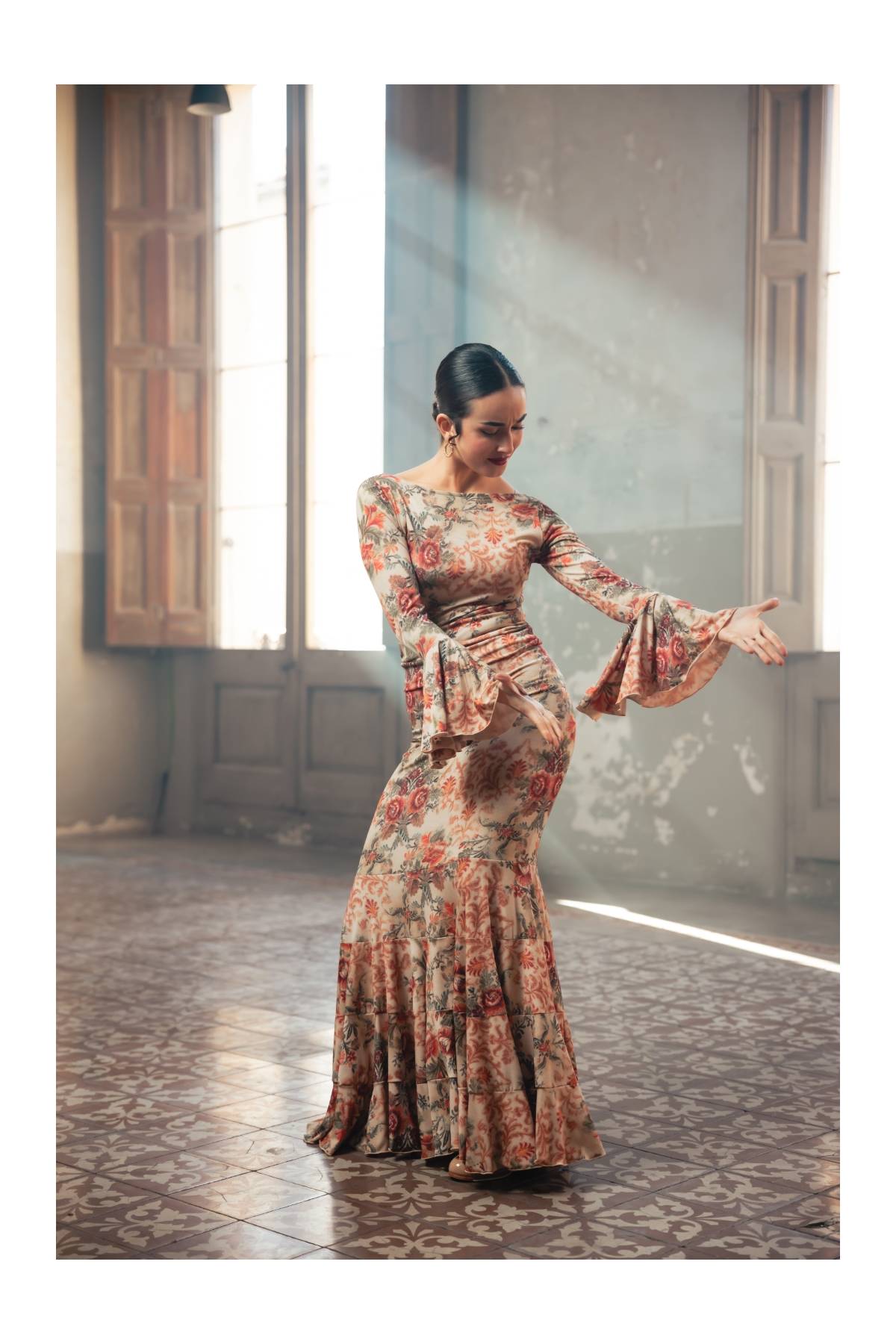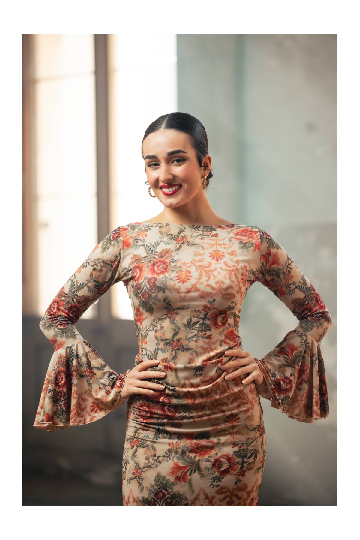 Long top to the hips. Long sleeves with ruffles at the hem. Boat neckline, closed at the front and more open at the back.