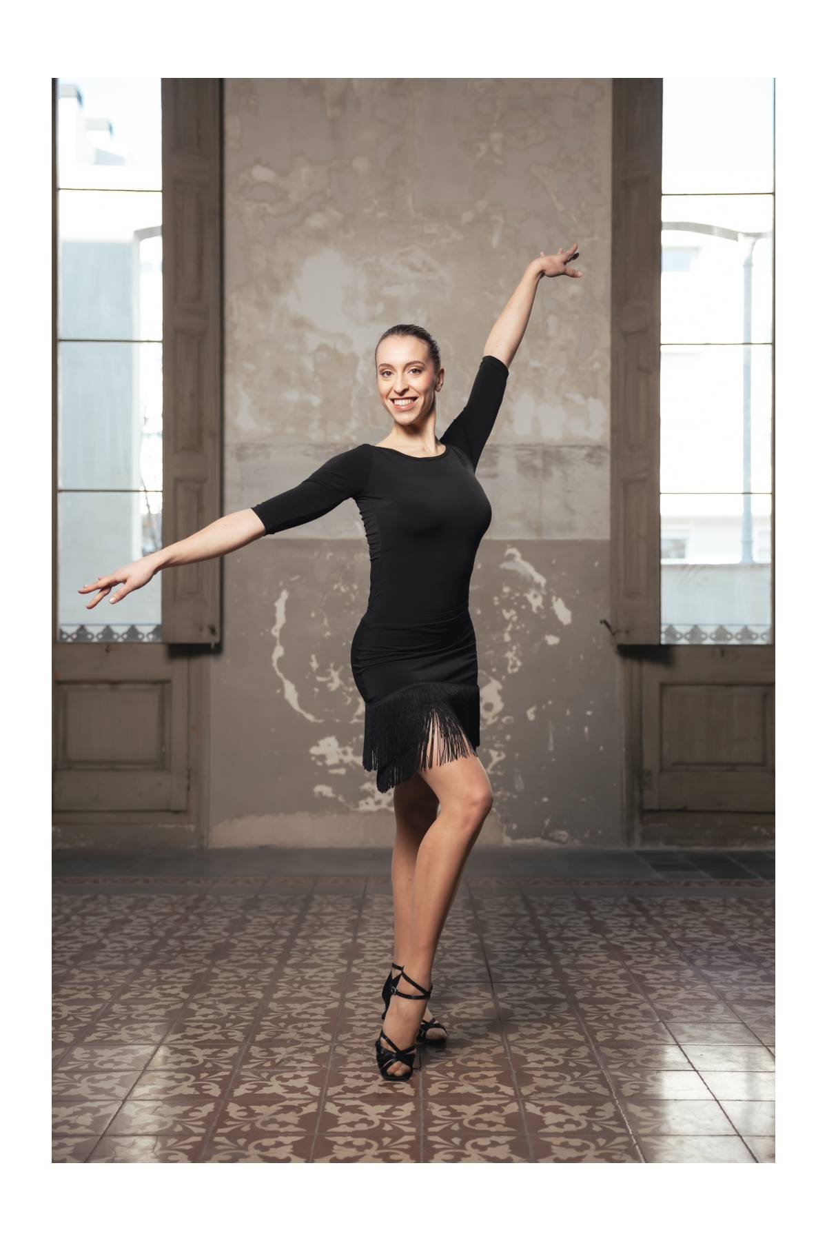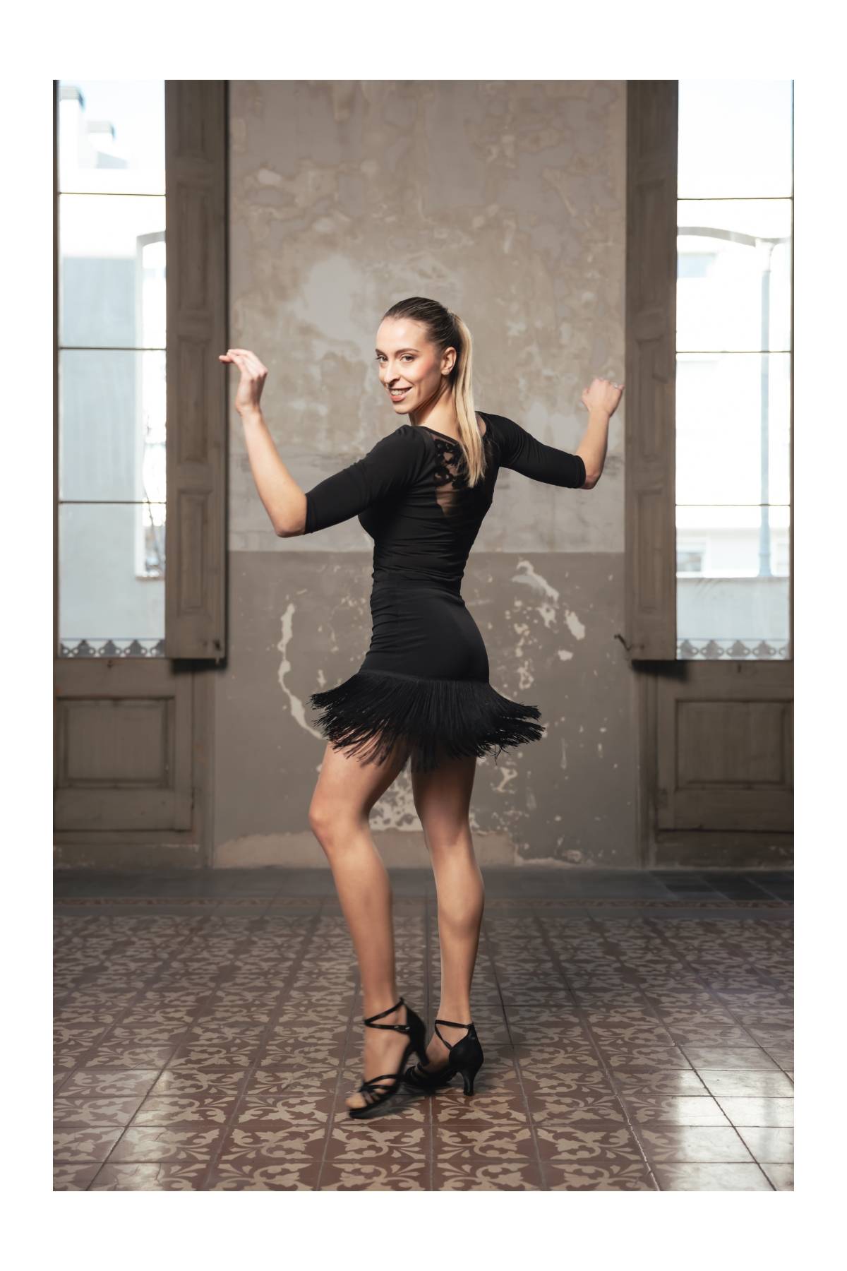 Skirt with two 15cm overlapping fringes, elastic waistband.