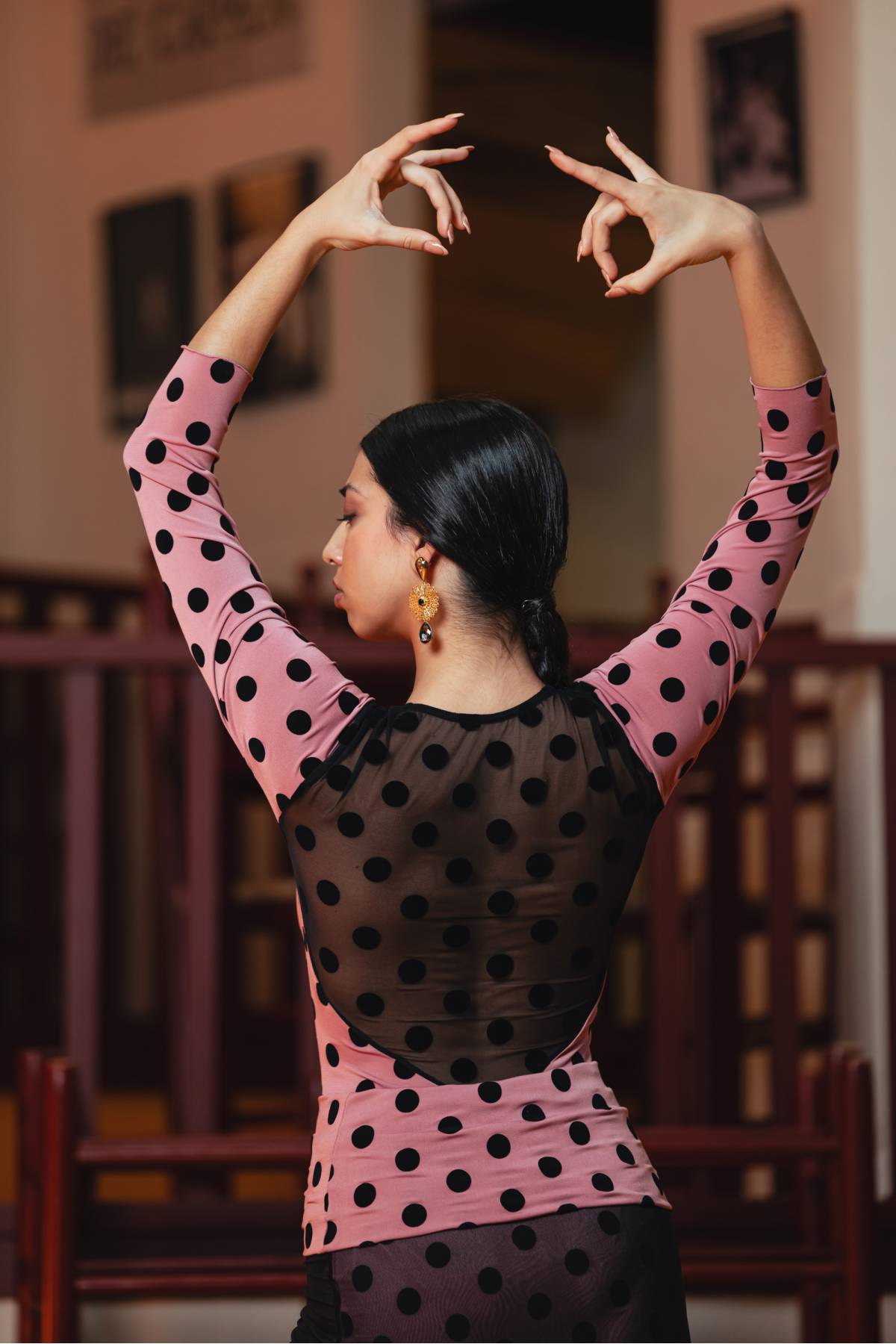 Long-sleeve bodysuit in flocked polka dot stretch knit. Upper front panels and back in tulle with polka dots.