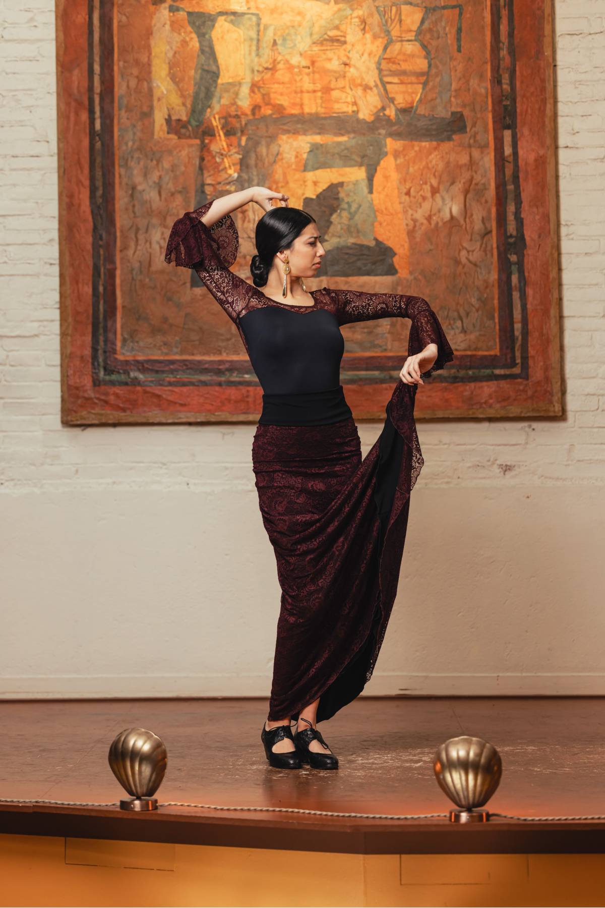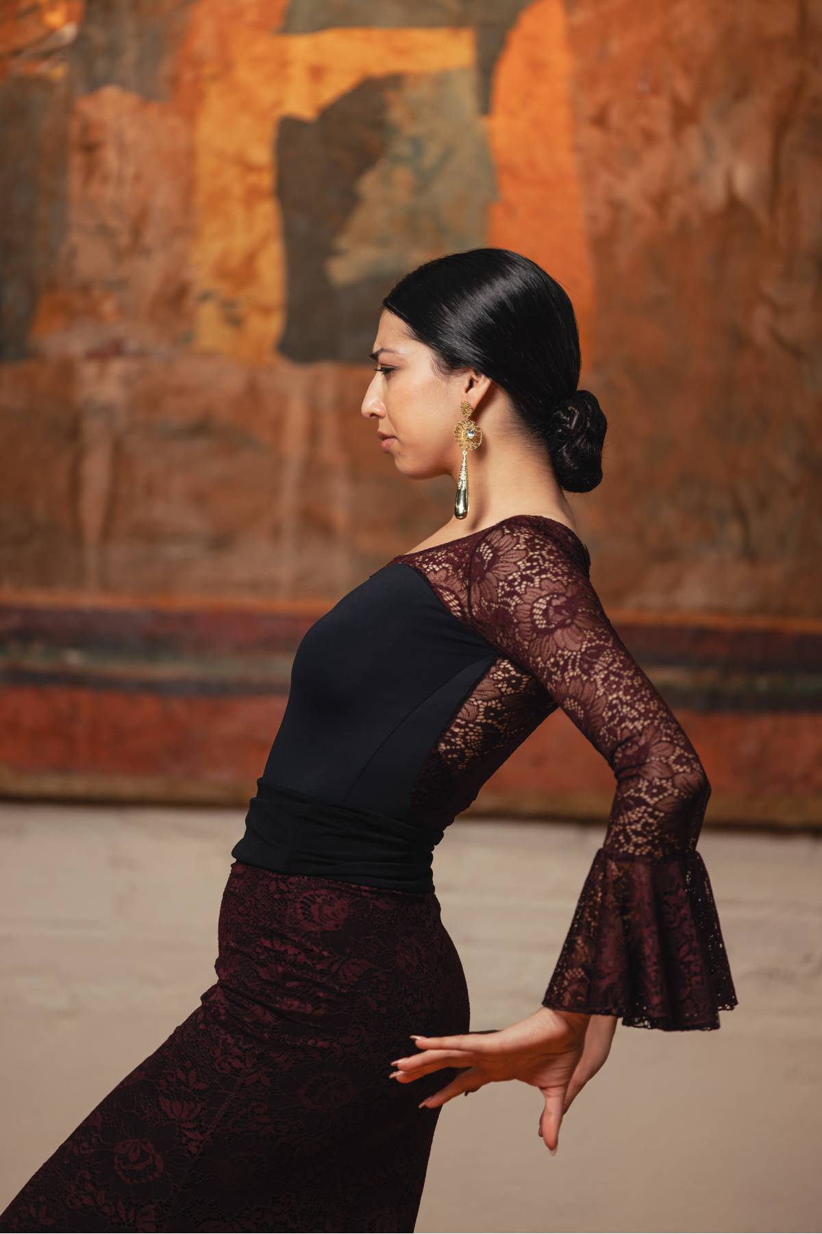 Bodysuit with a lace fantasy neckline, three-quarter sleeves, and flounces.