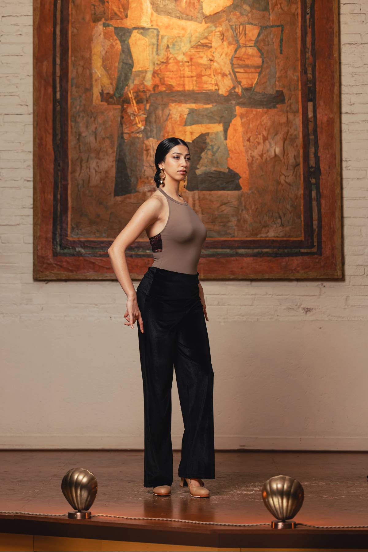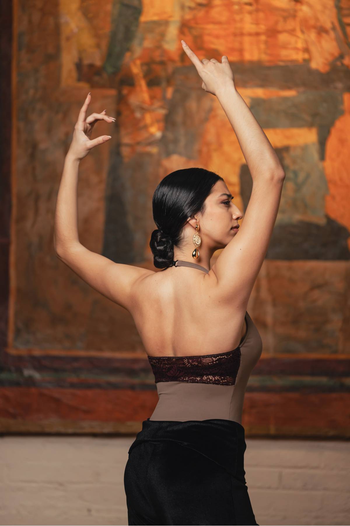 Halter-neck leotard with lace at the back.
