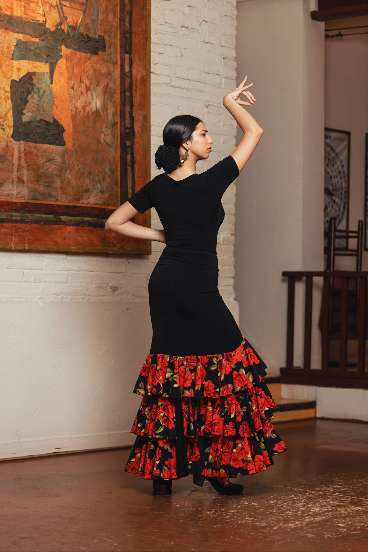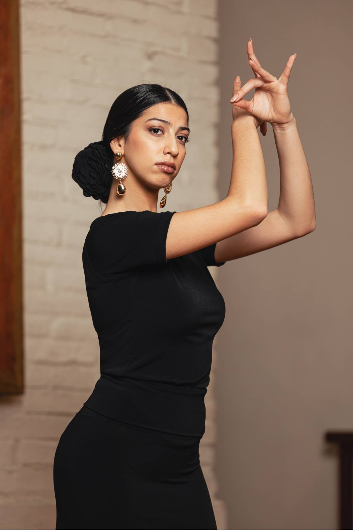 Fitted short-sleeve top with a deeper front neckline. Neckline finished with piping.