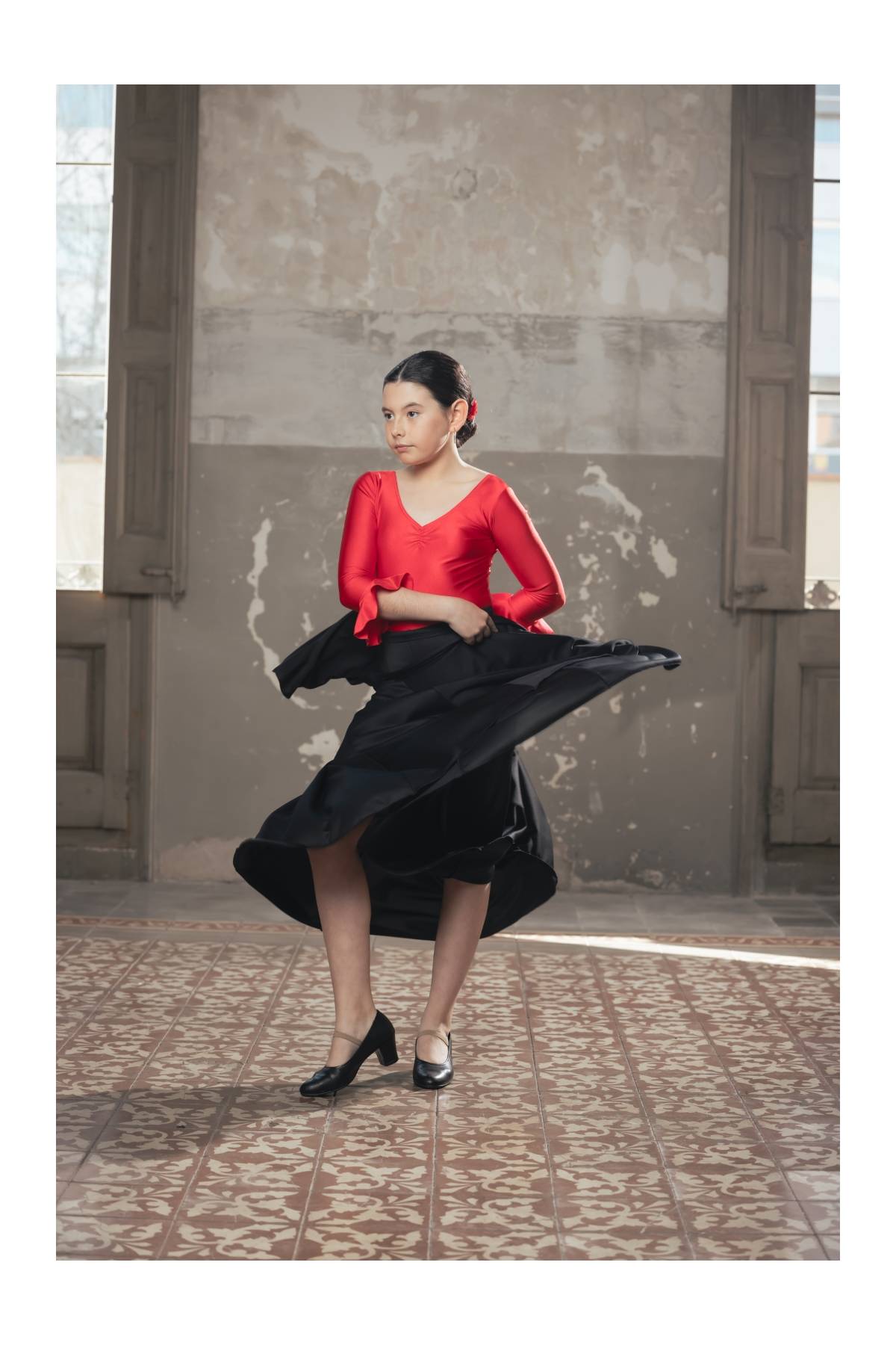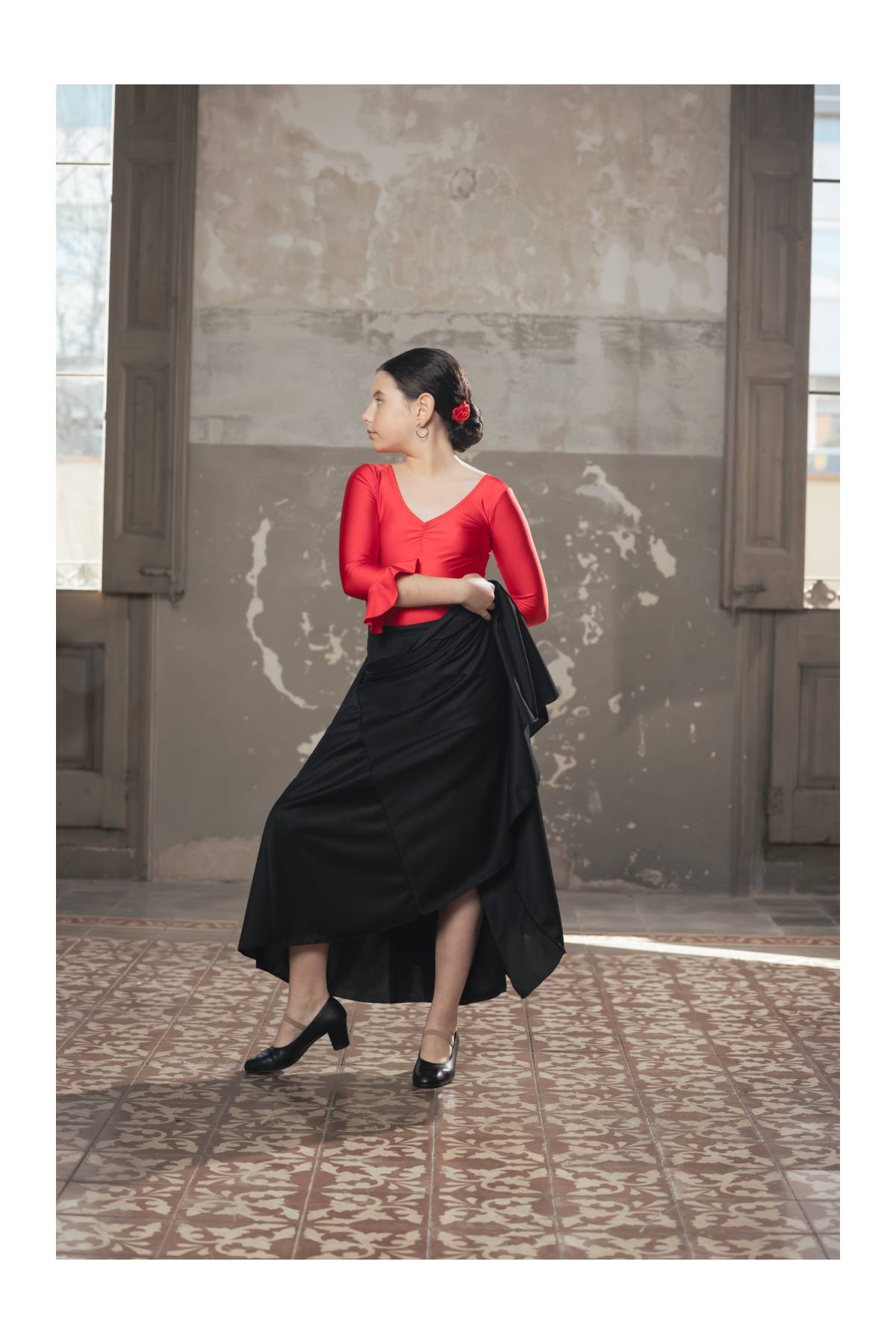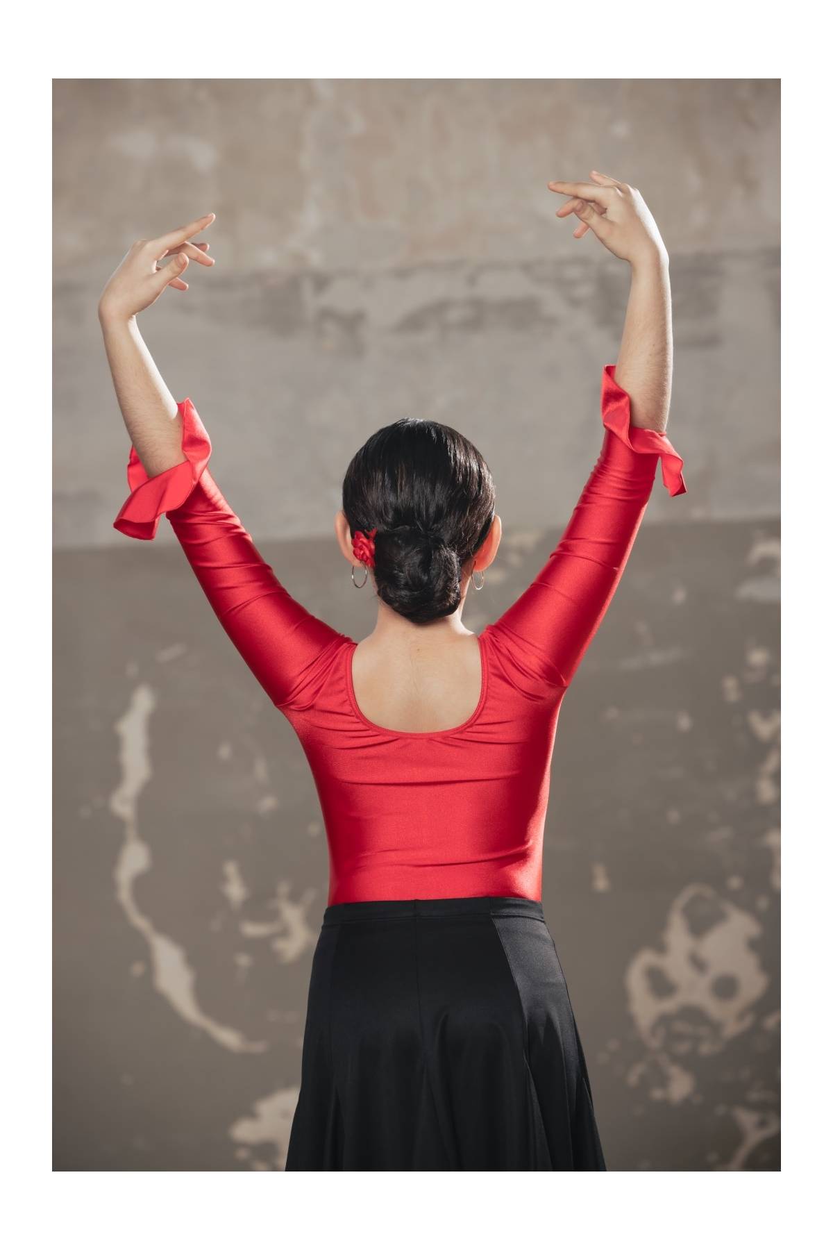 Maillot manga larga con fruncido en pecho y volante en manga, ideal flamenco ensayo