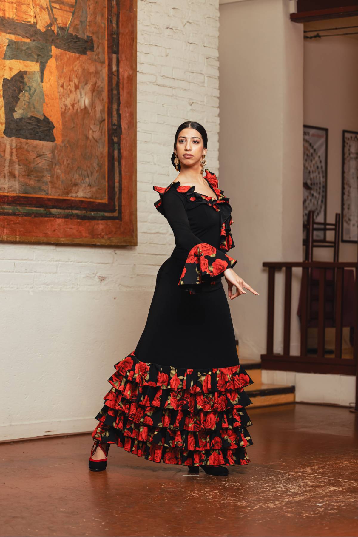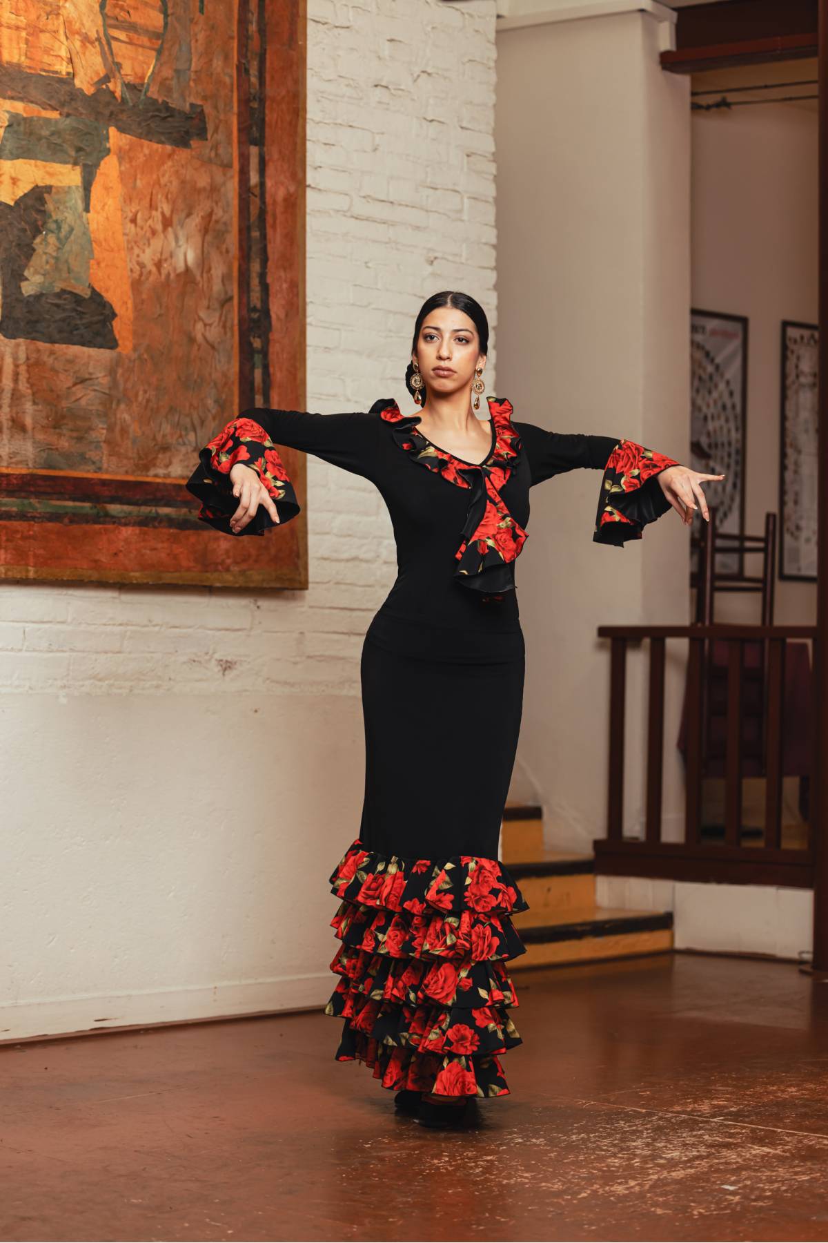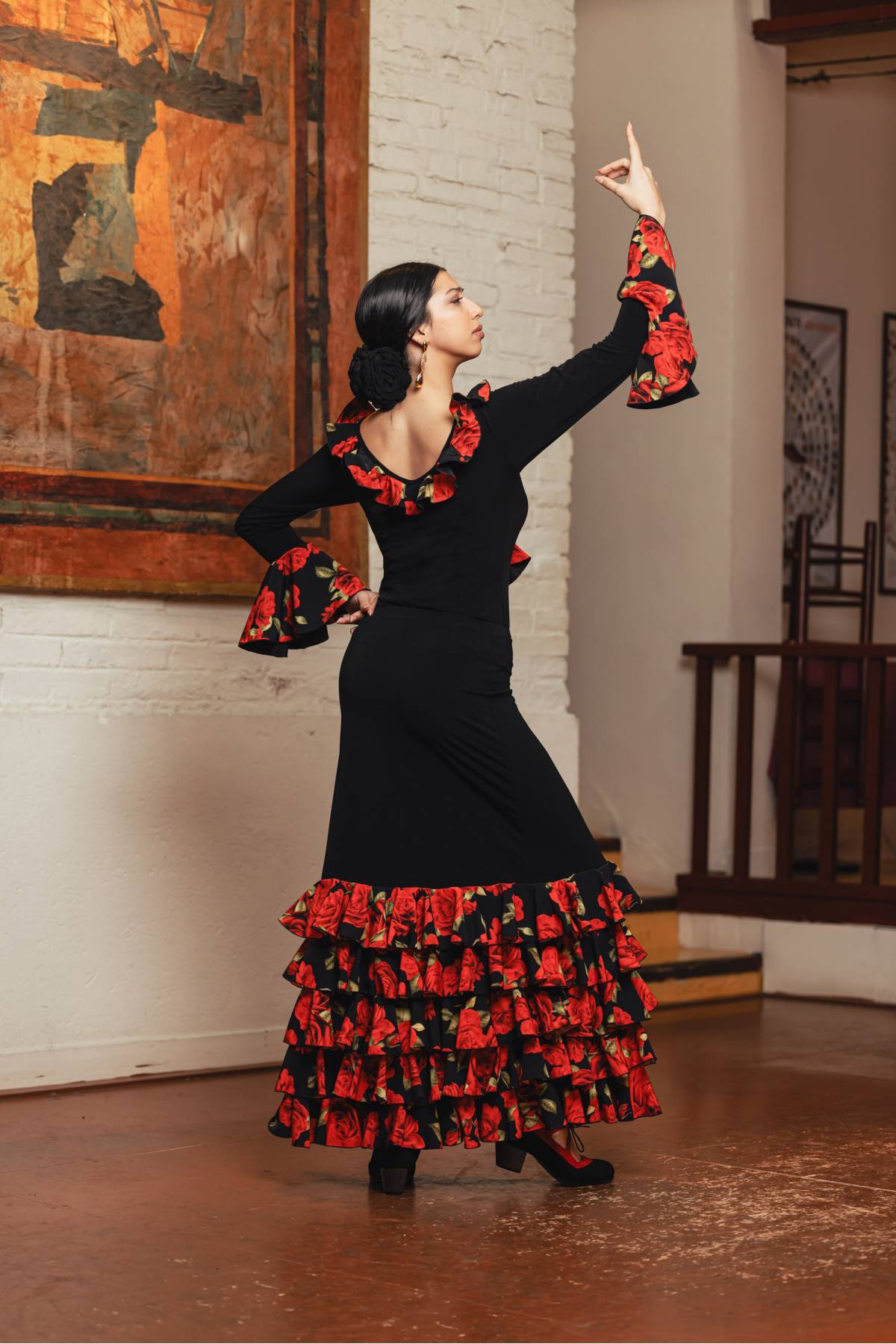 Falda larga con cinturilla de 2,5 cm de ancho. Aplicación de 5 volantes de la misma medida de crespón en el bajo.