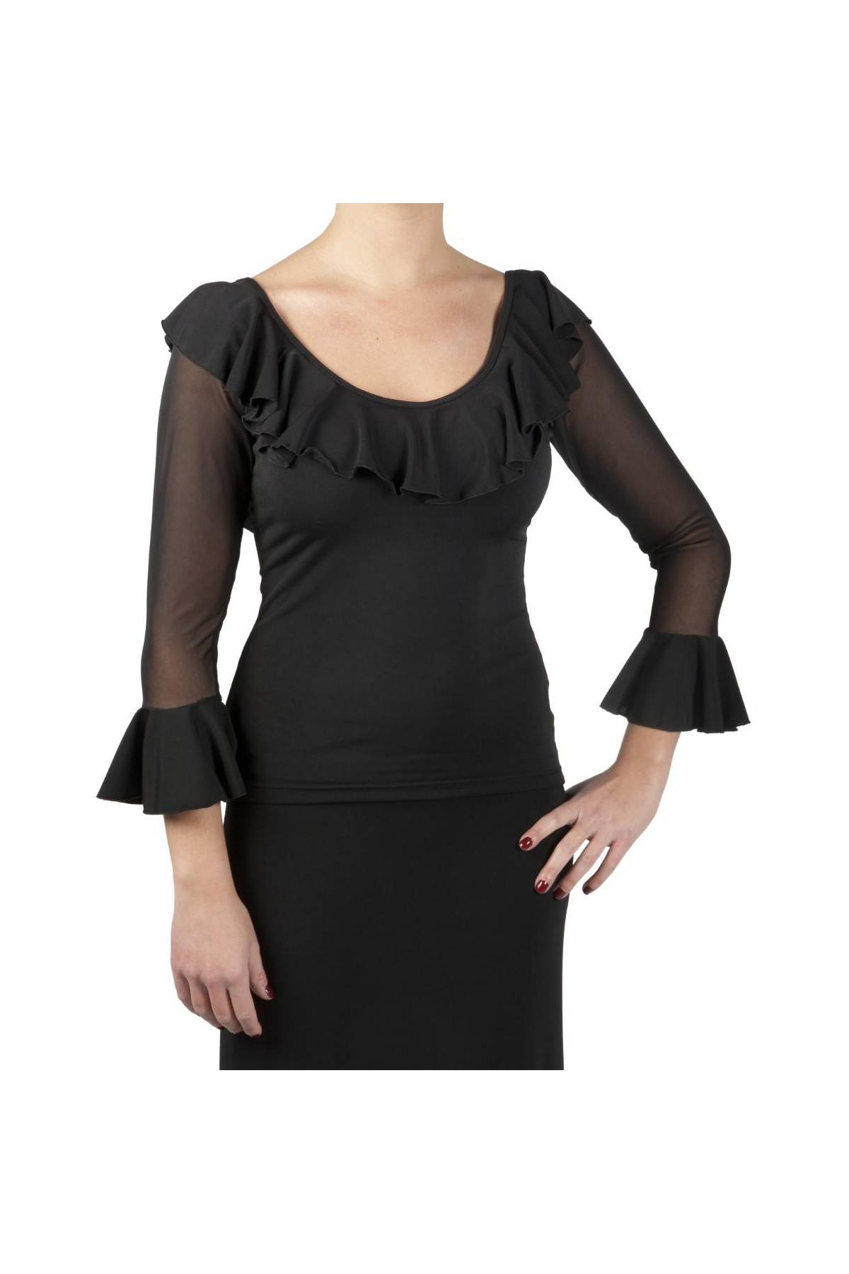 Camiseta de volante en escote, manga larga de tul elástico y volante en manga