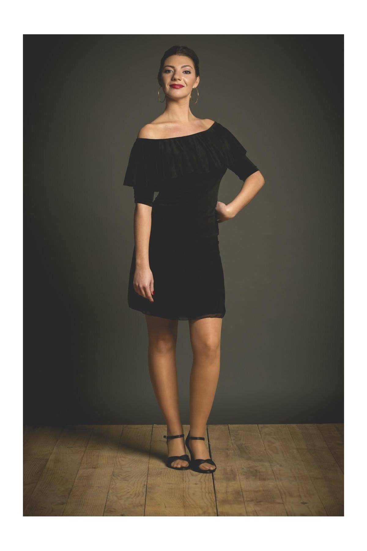Top corto hasta cadera con manga 3/4. Volantes en todo el contorno de sobre-pecho.