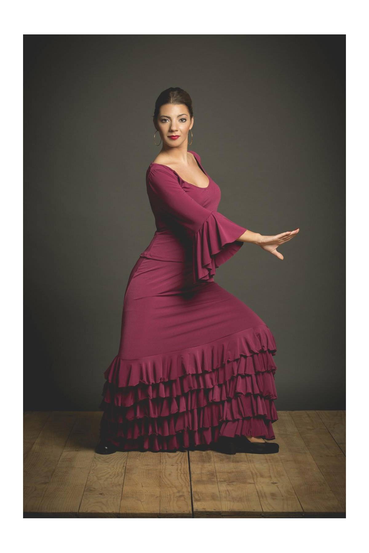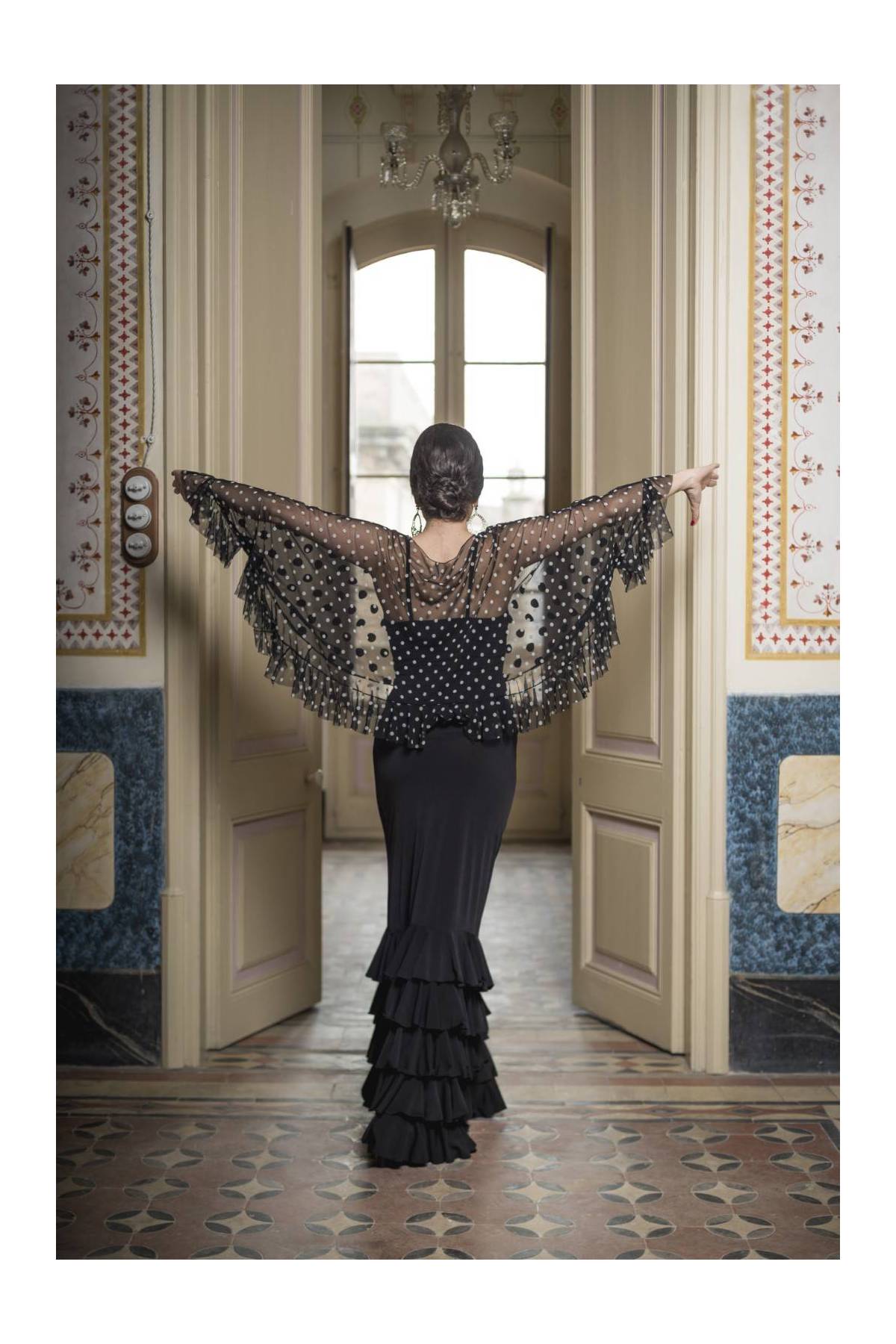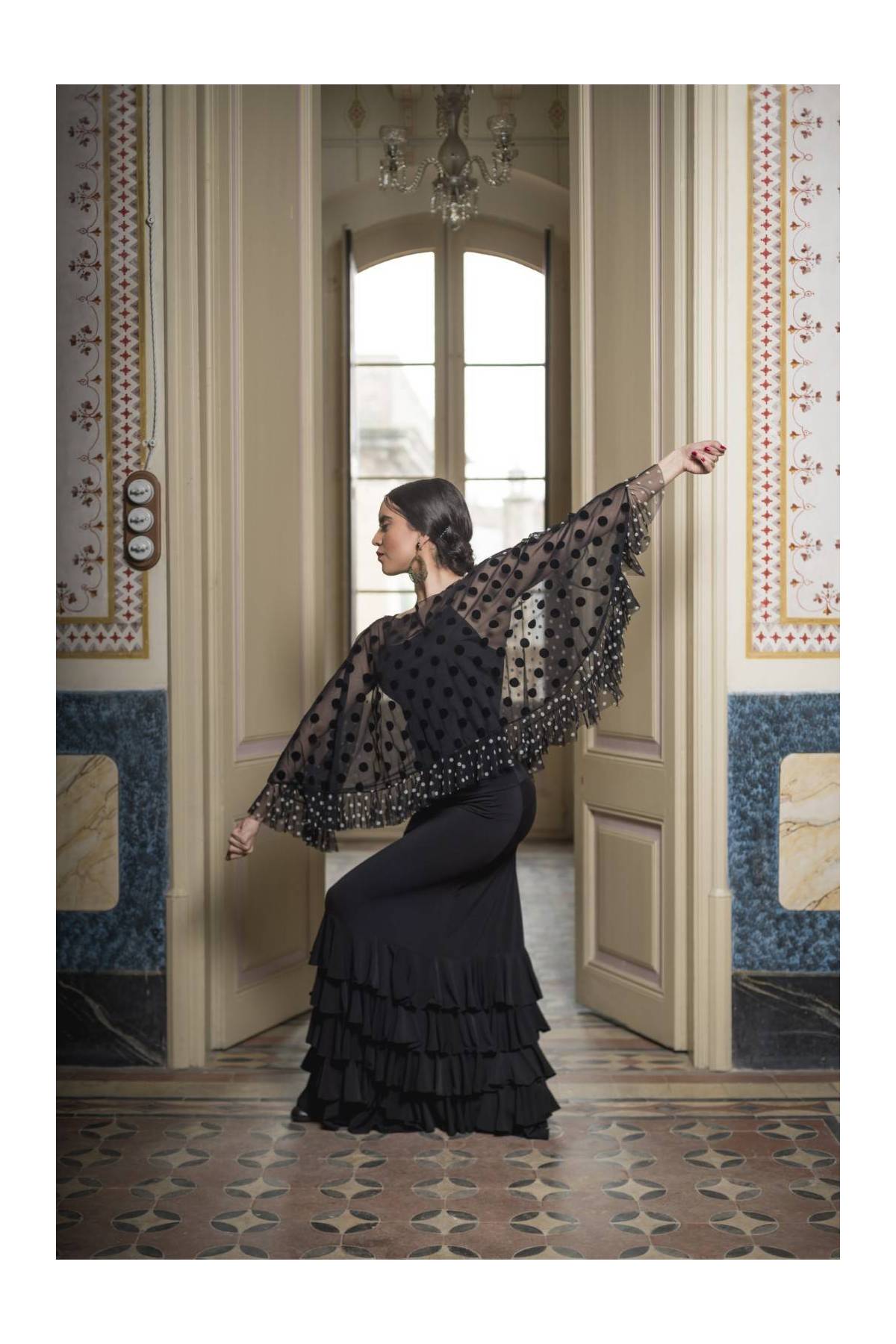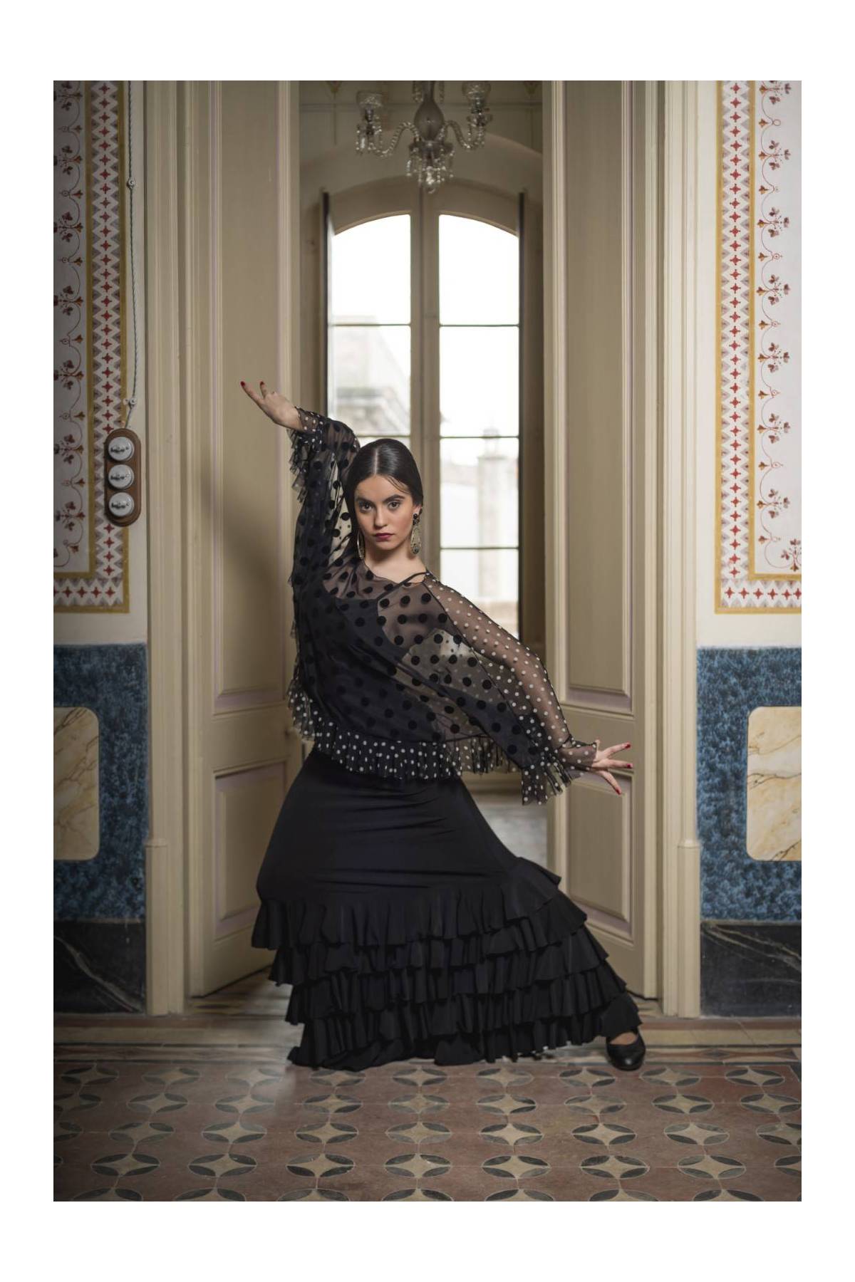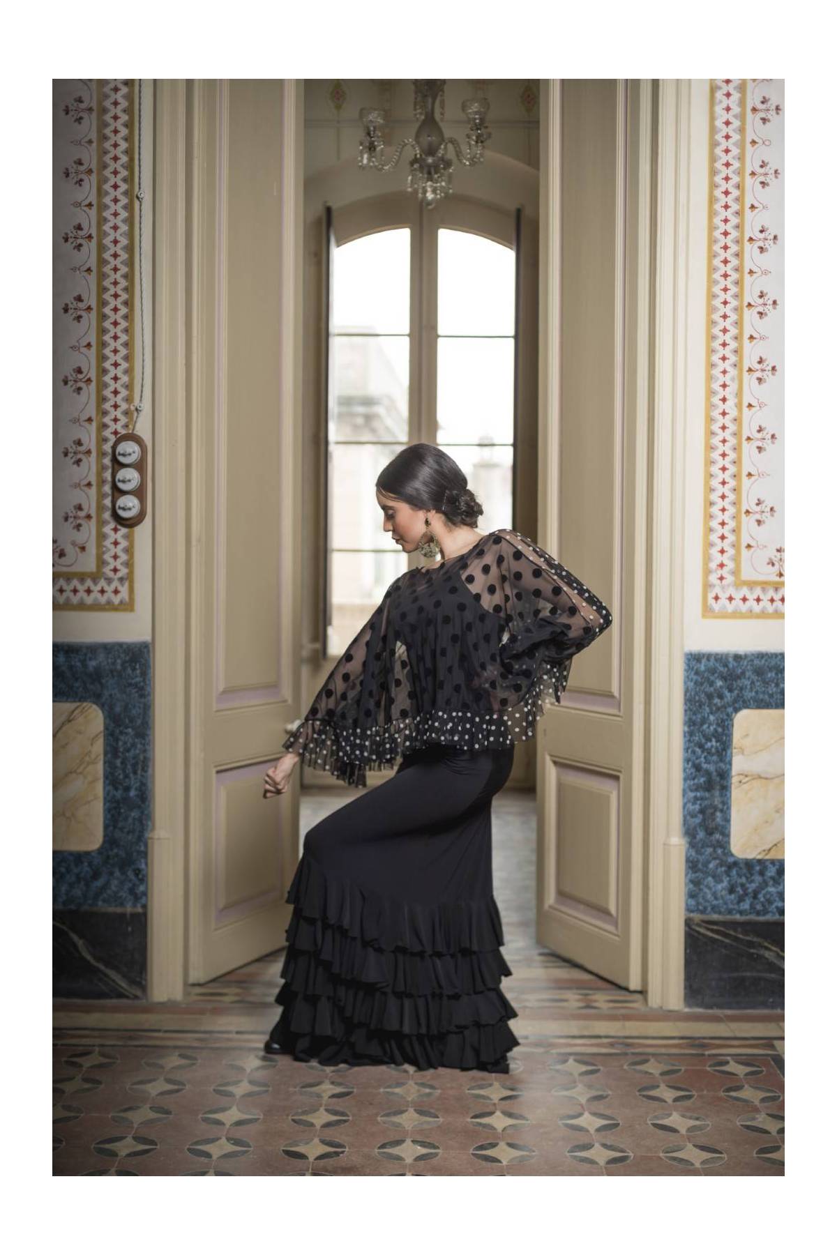 Falda larga con fajín. Aplicación de 5 volantes de la misma medida en el bajo.