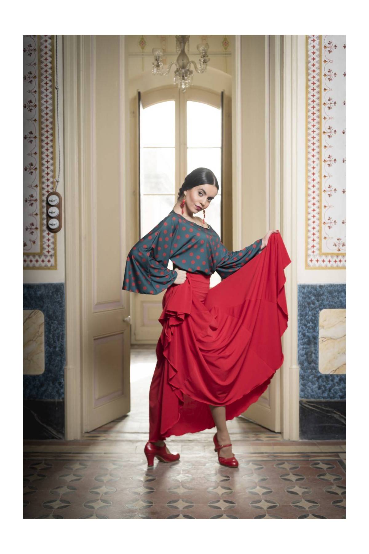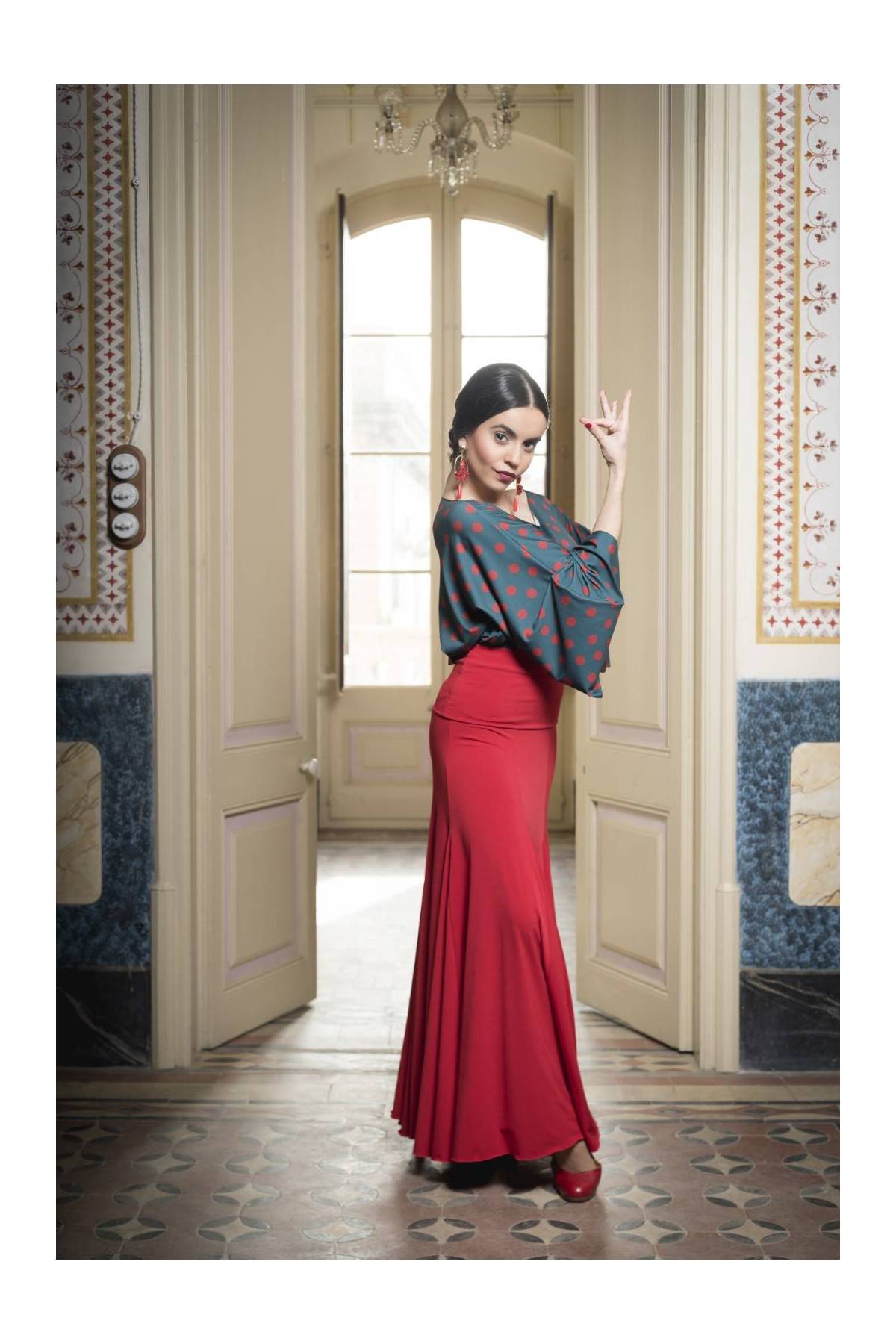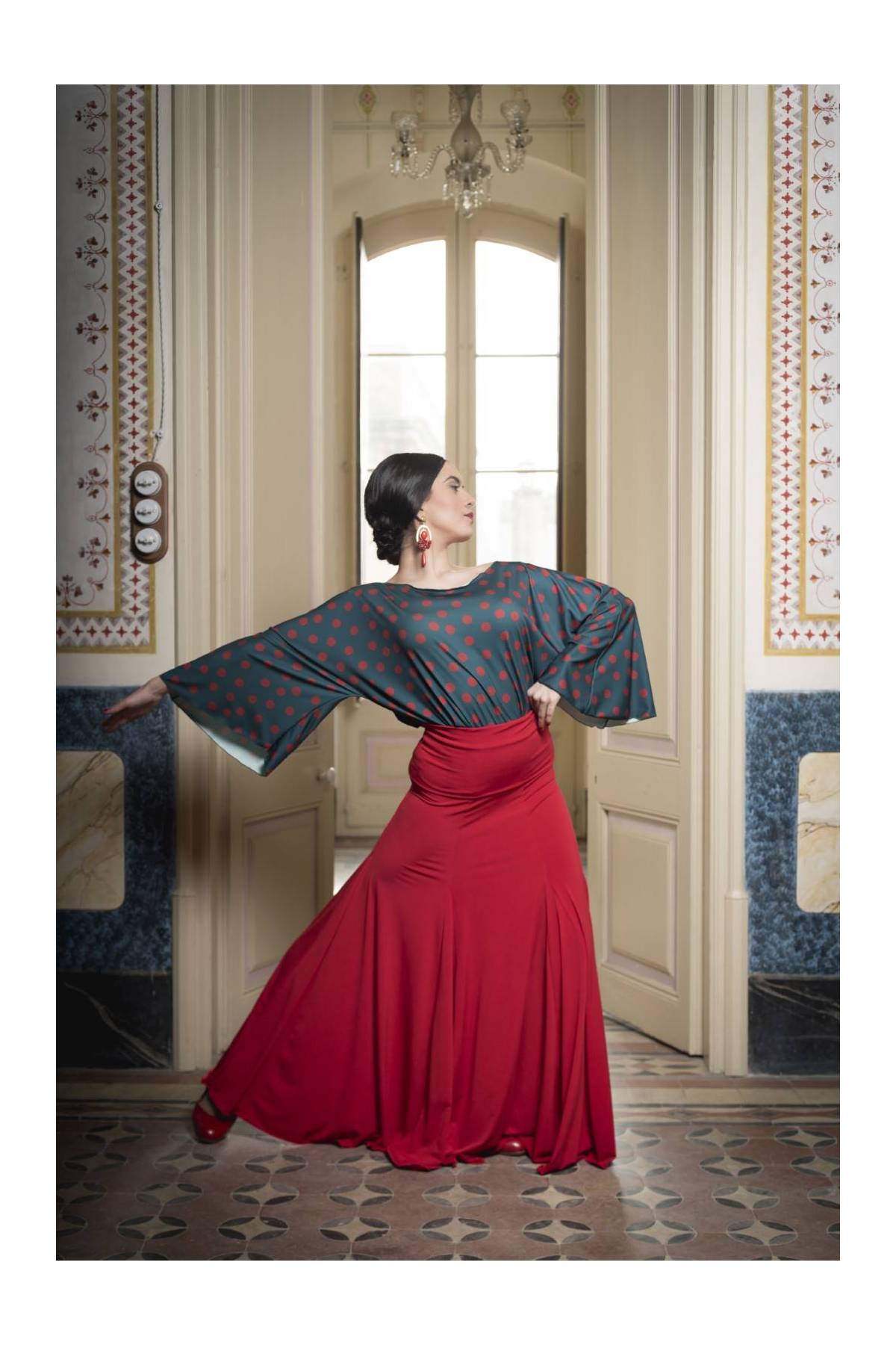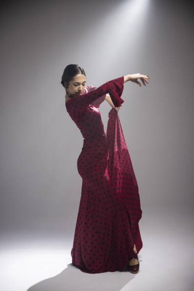 Falda larga con fajín. Costadillos con 6 godets en las costuras, entallada en cadera.
