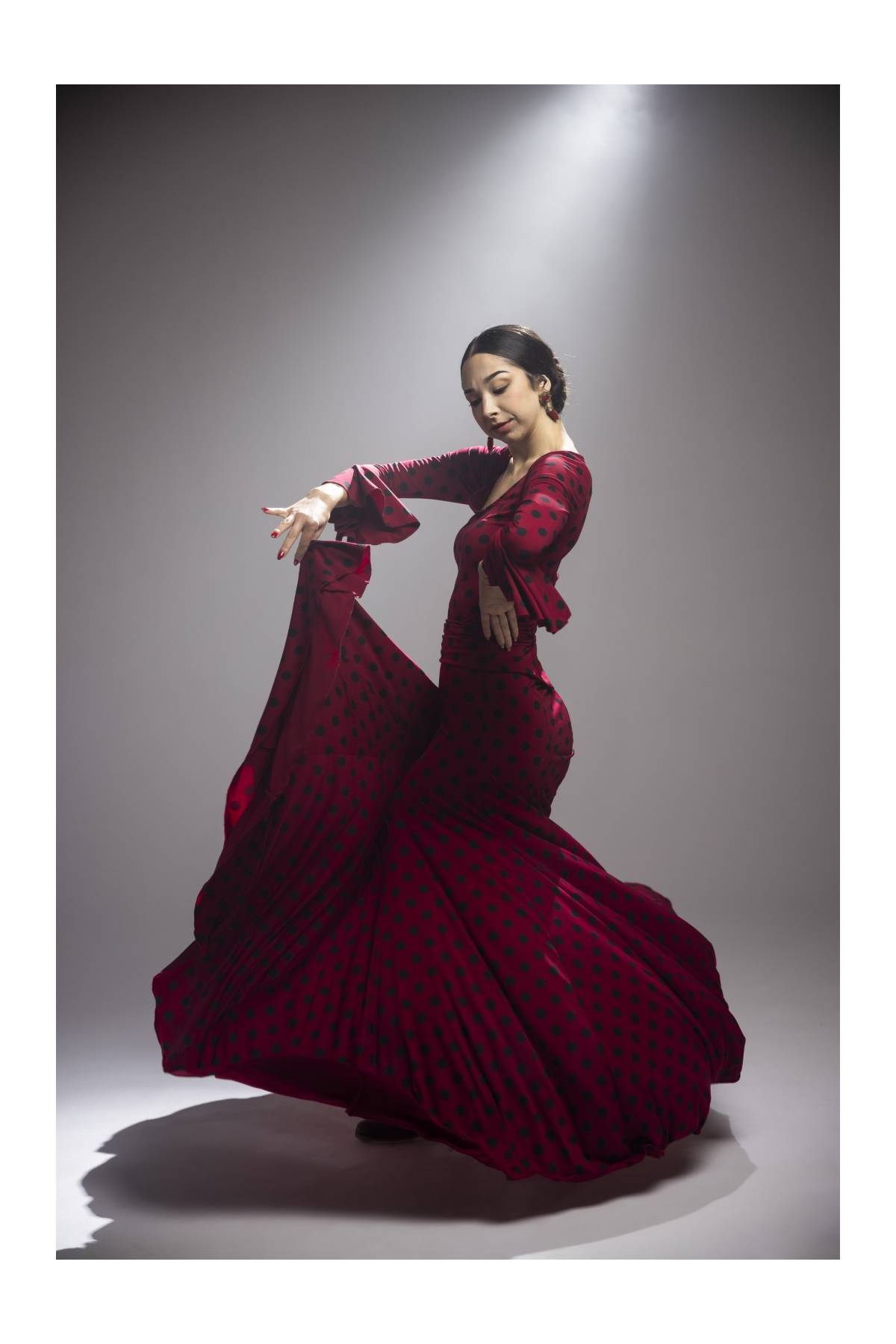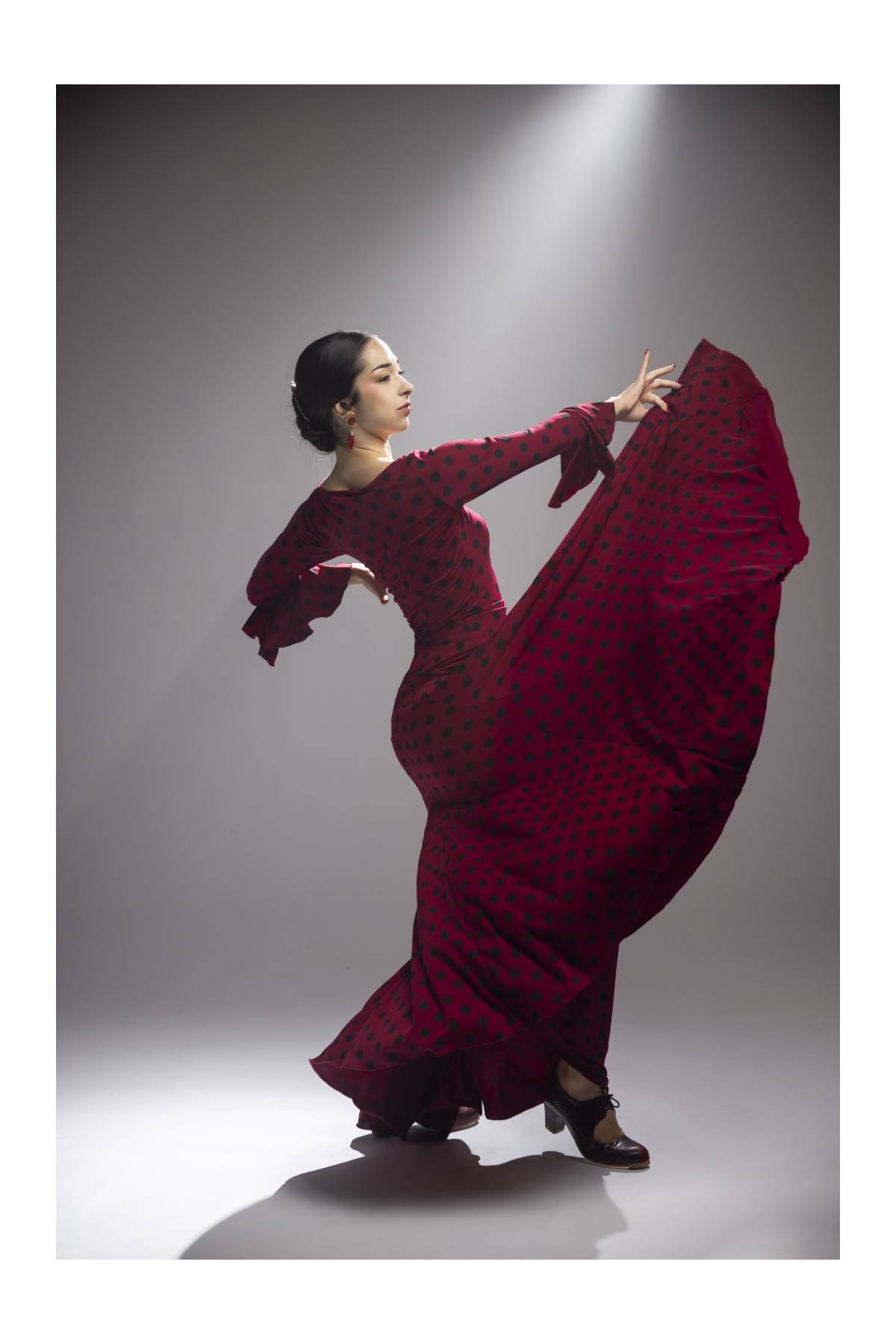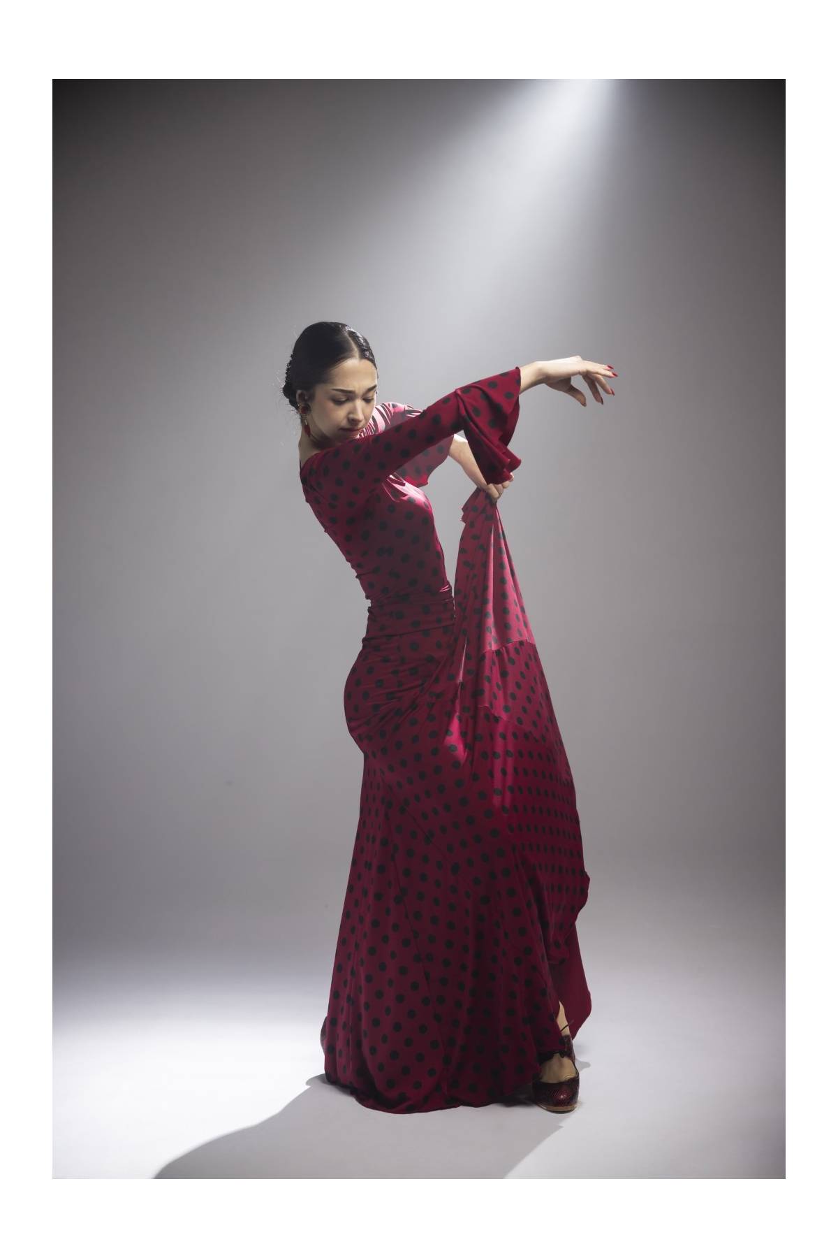 Falda larga con fajín. Costadillos con 6 godets en las costuras, entallada en cadera.
