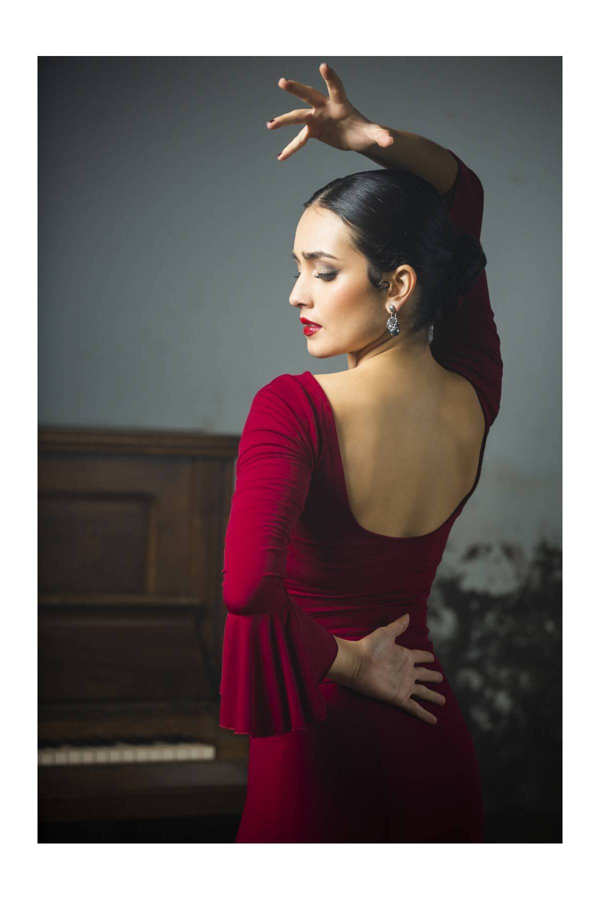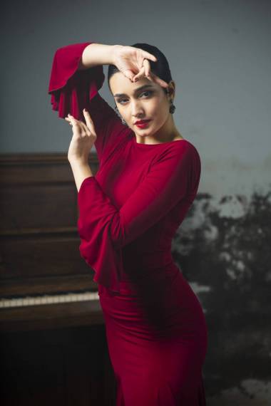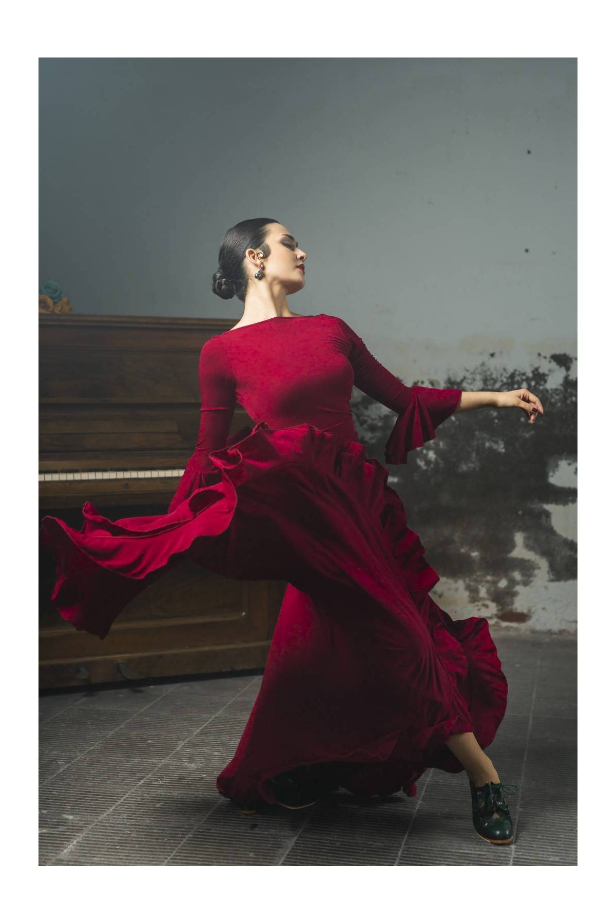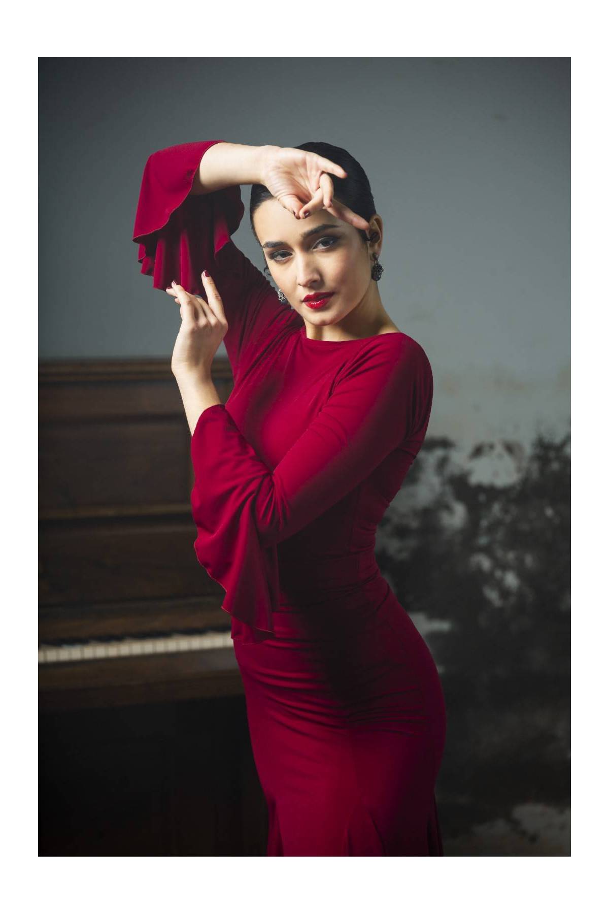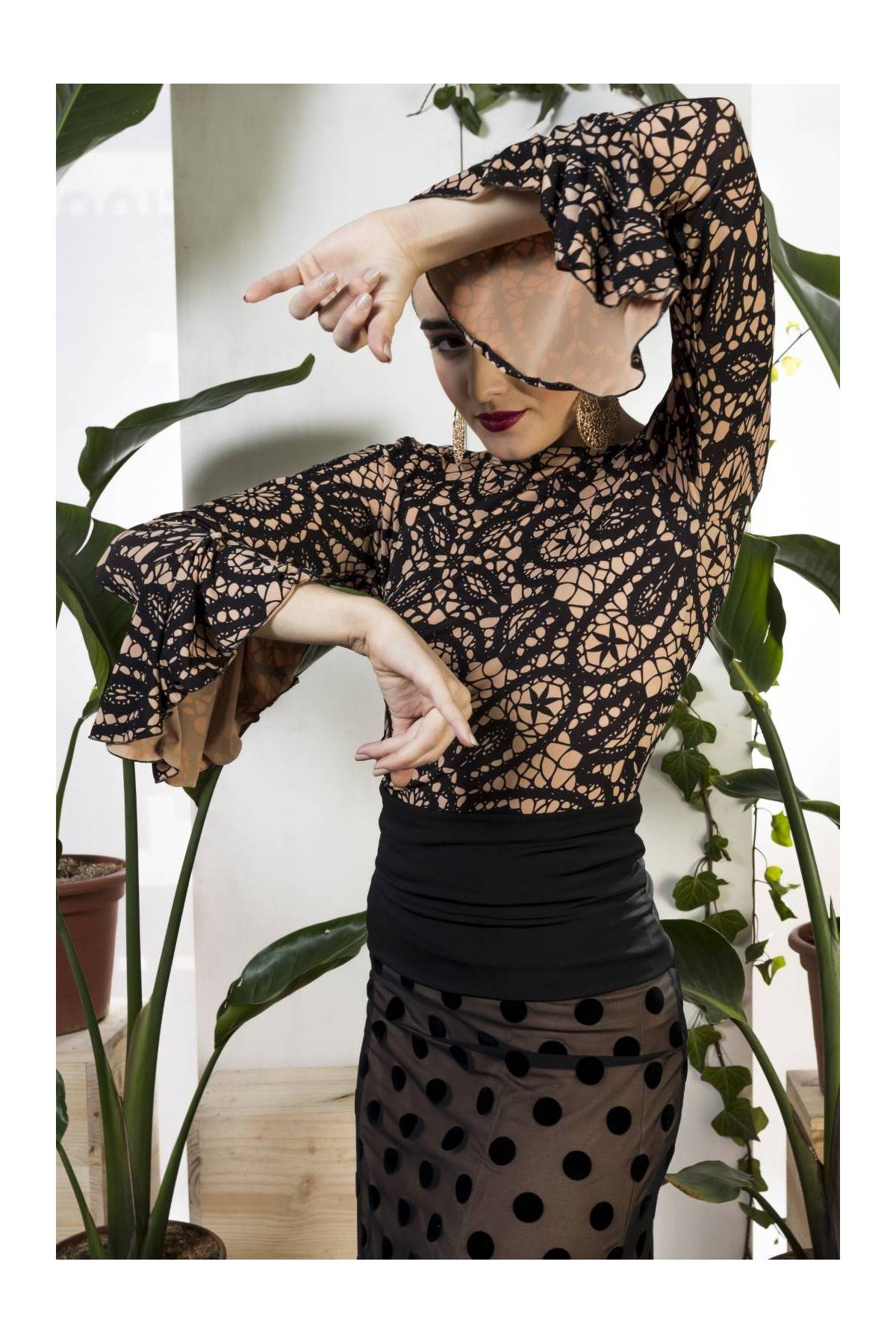 Top corto hasta cadera con escote barca más pronunciado en la espalda. Manga larga con aplicación de volantes en el bajo.