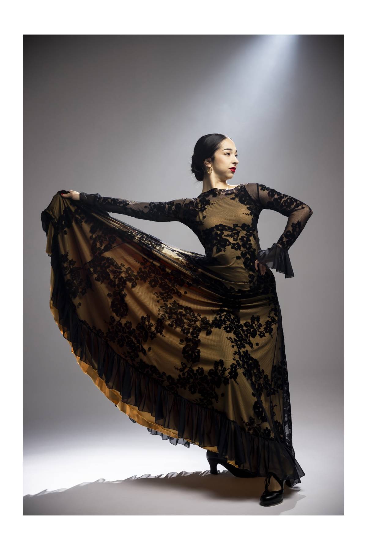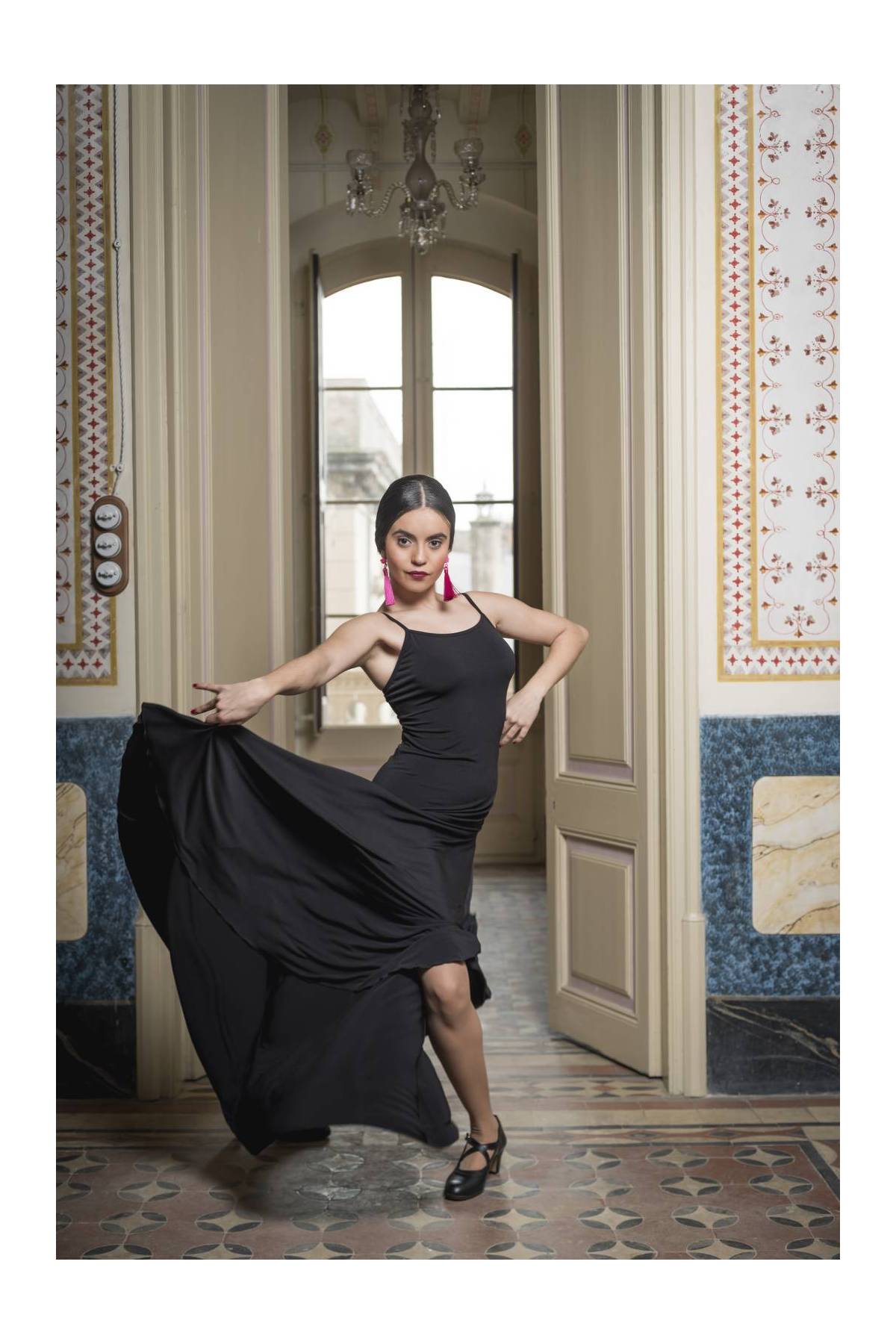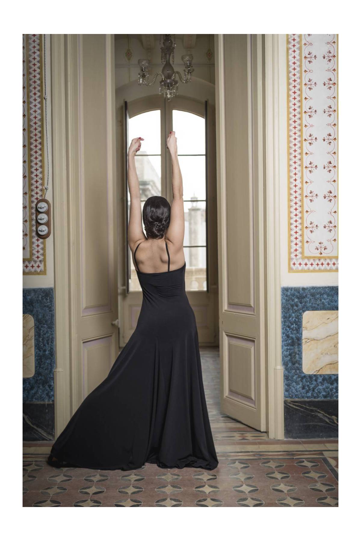 Vestido largo de tirantes de 1 cm de ancho. 2 godets a cada lado y uno en el centro espalda.
