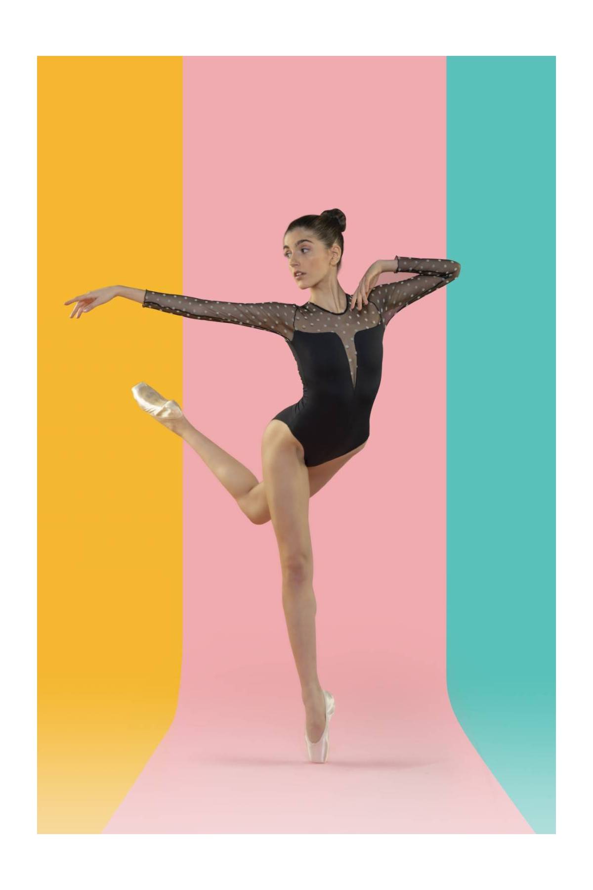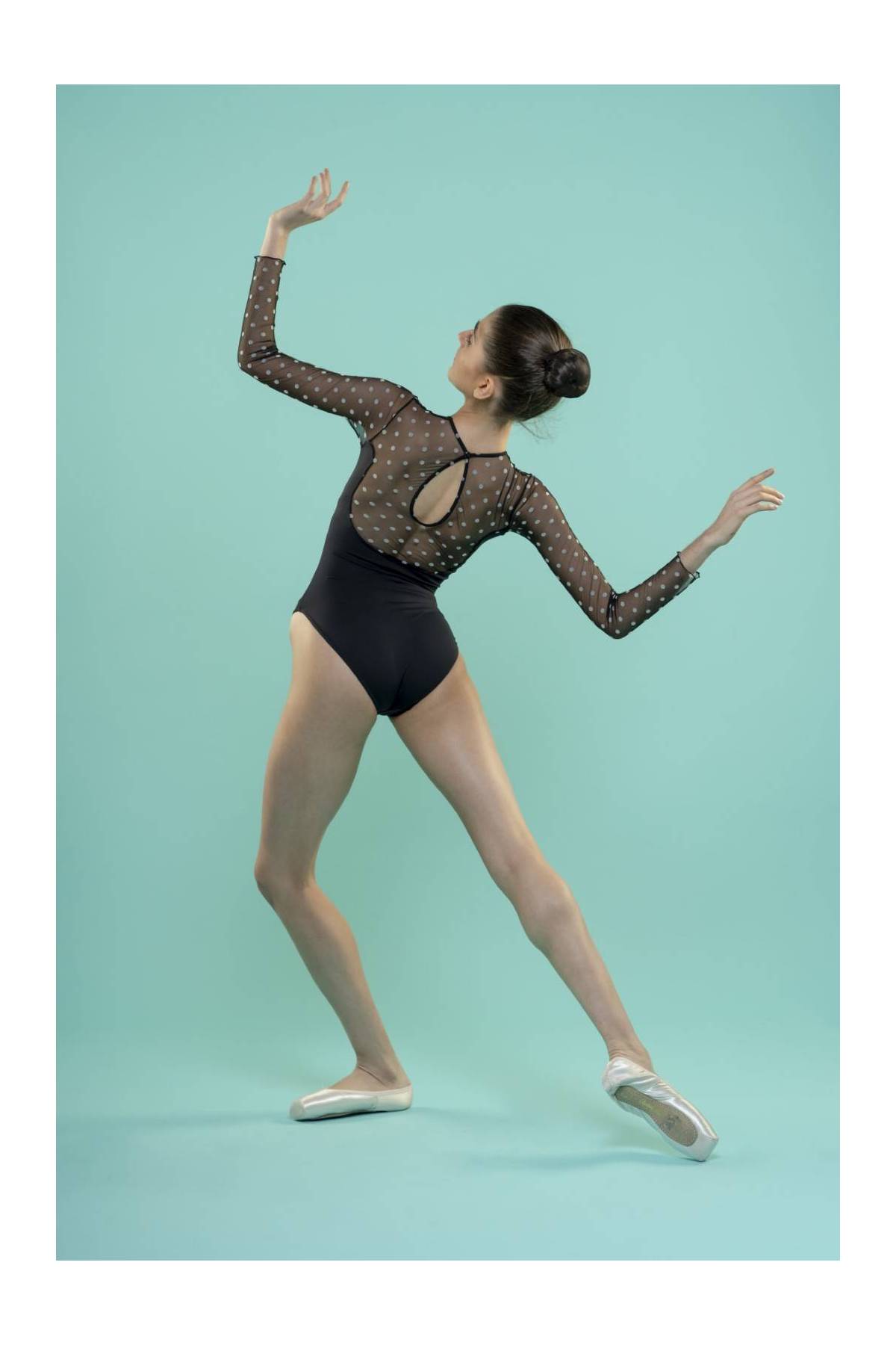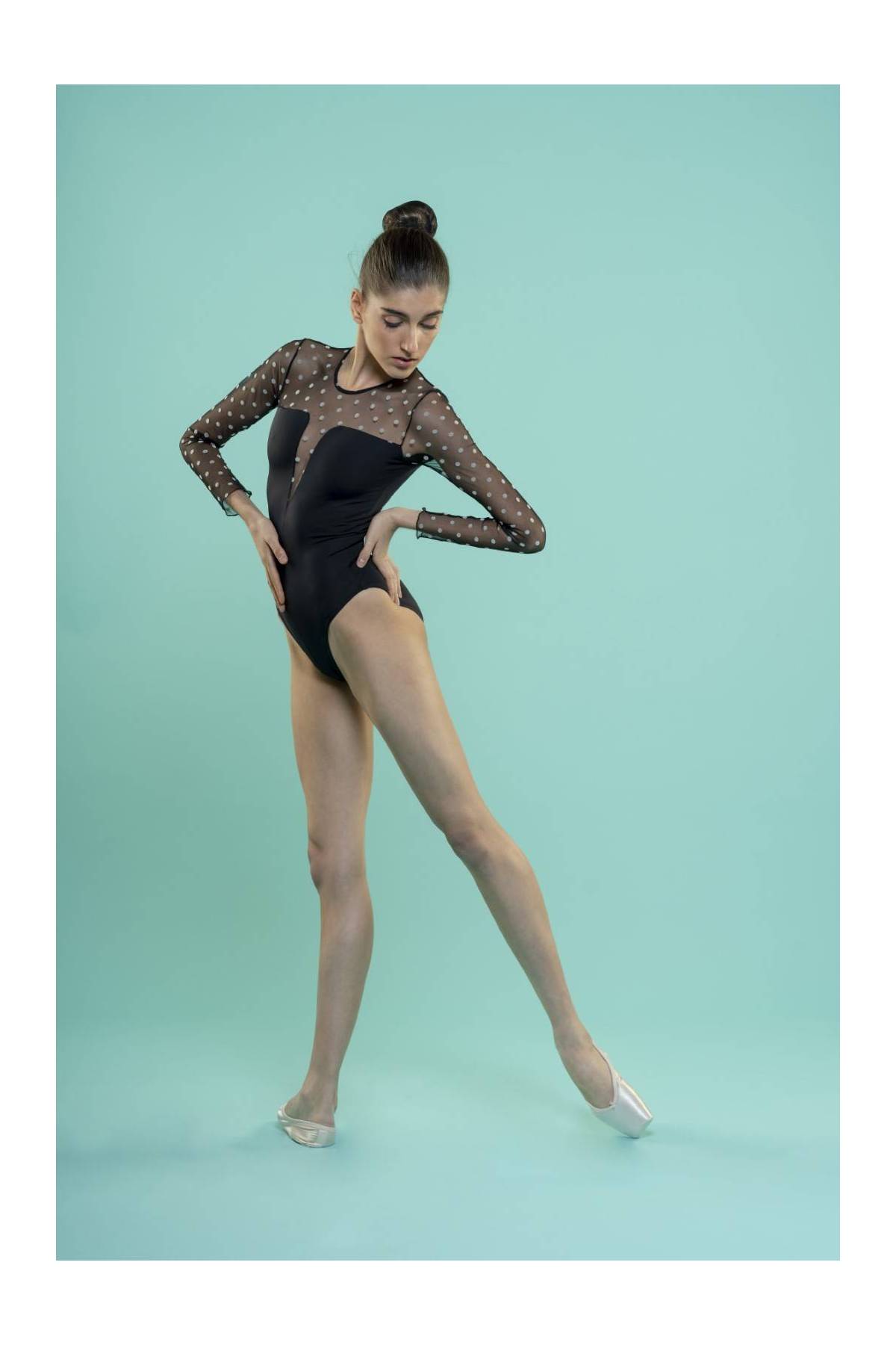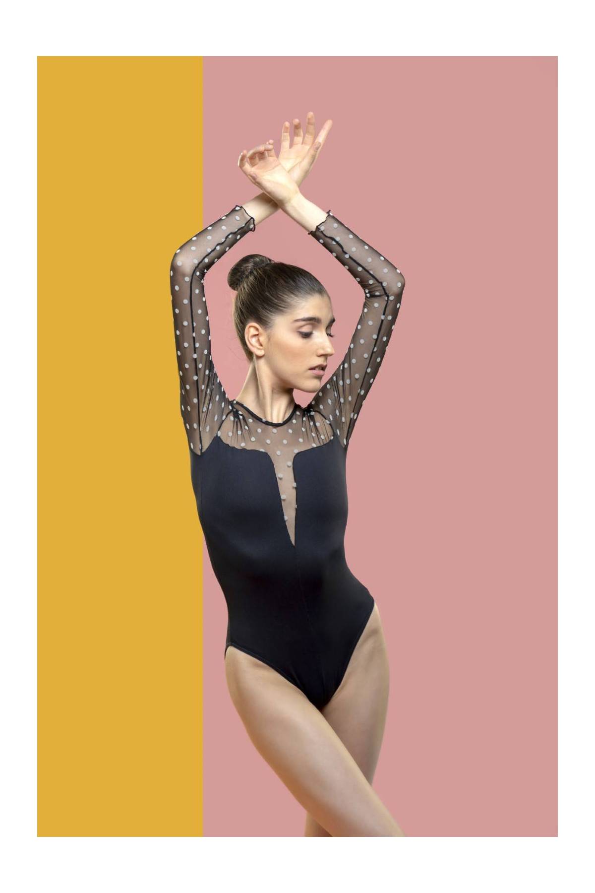 Maillot de manga larga montada con escote fantasía acabado en pico.