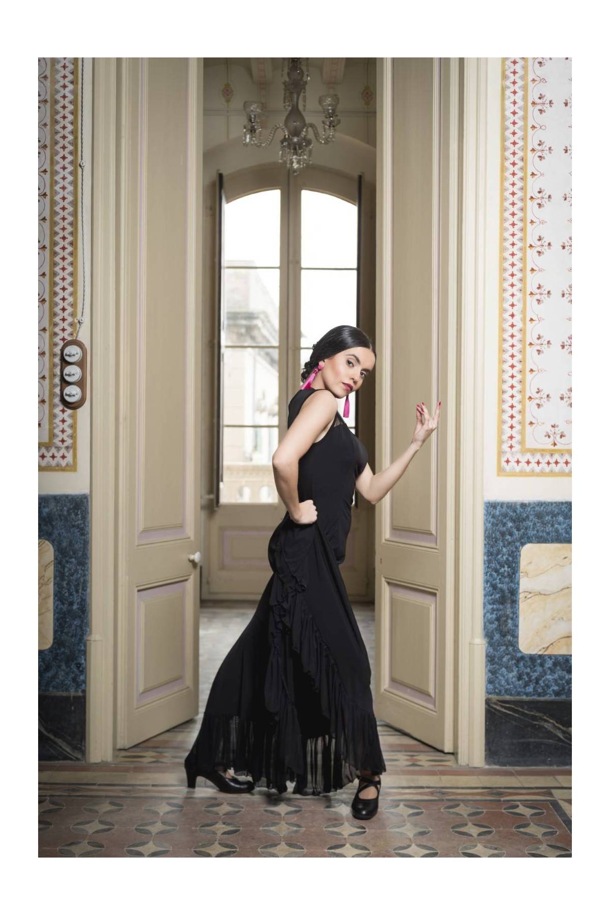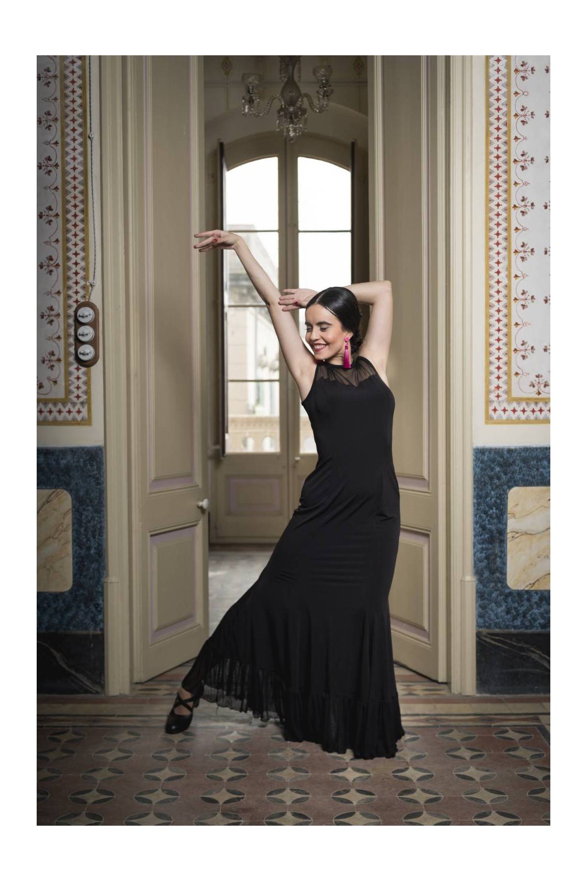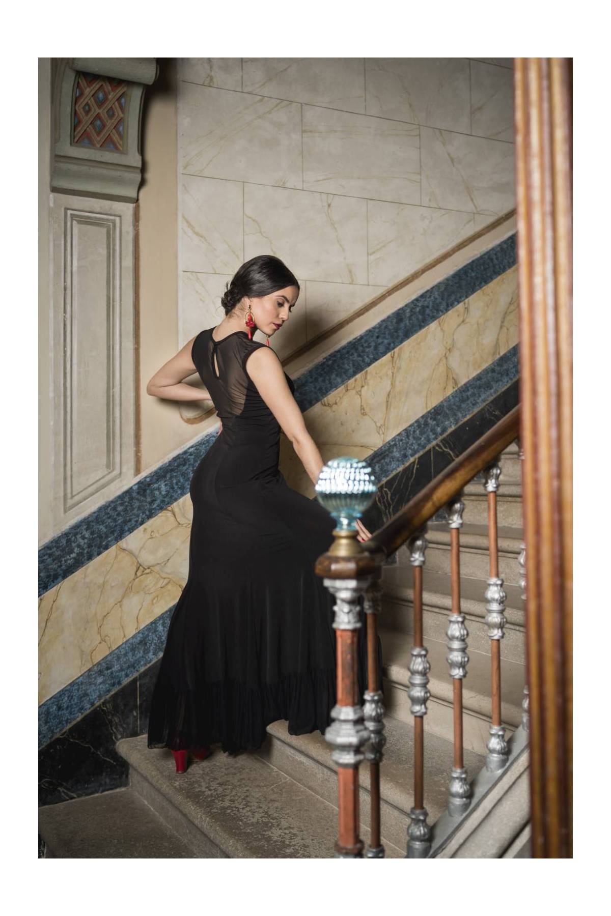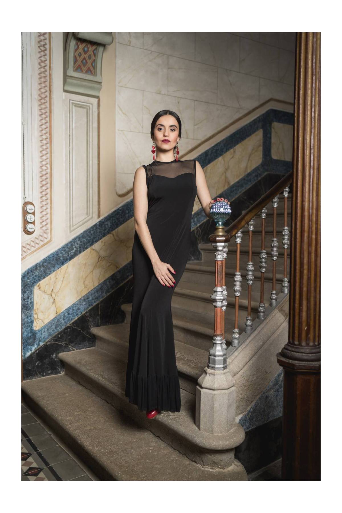 Vestido largo entallado con costadillos en el delantero y en la espalda. Sin mangas pulido con vivo. Escote corazón de fantasía con cuello redondo de tul. Lágrima en el centro espalda. Godets con volantes de tul en todo el bajo.