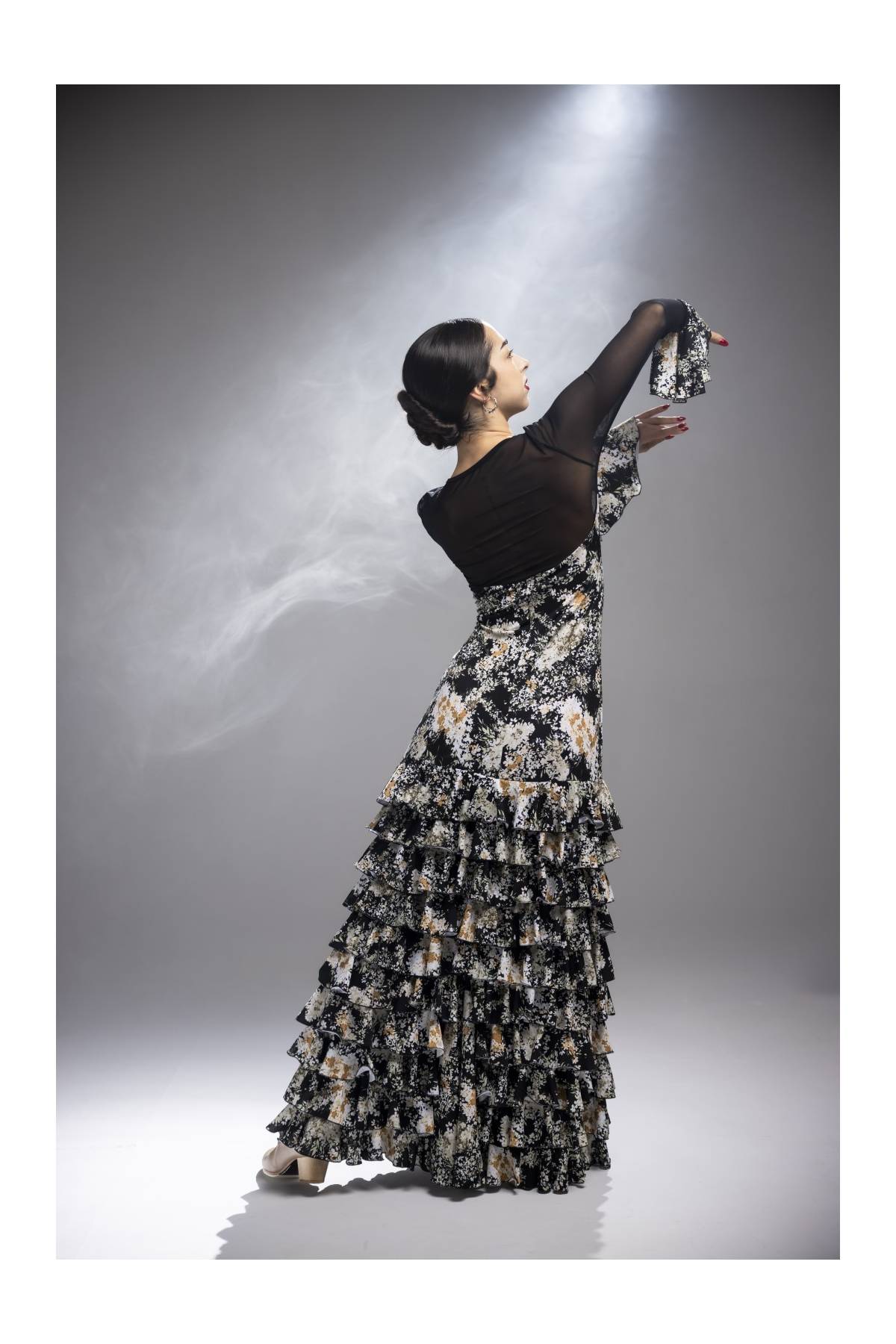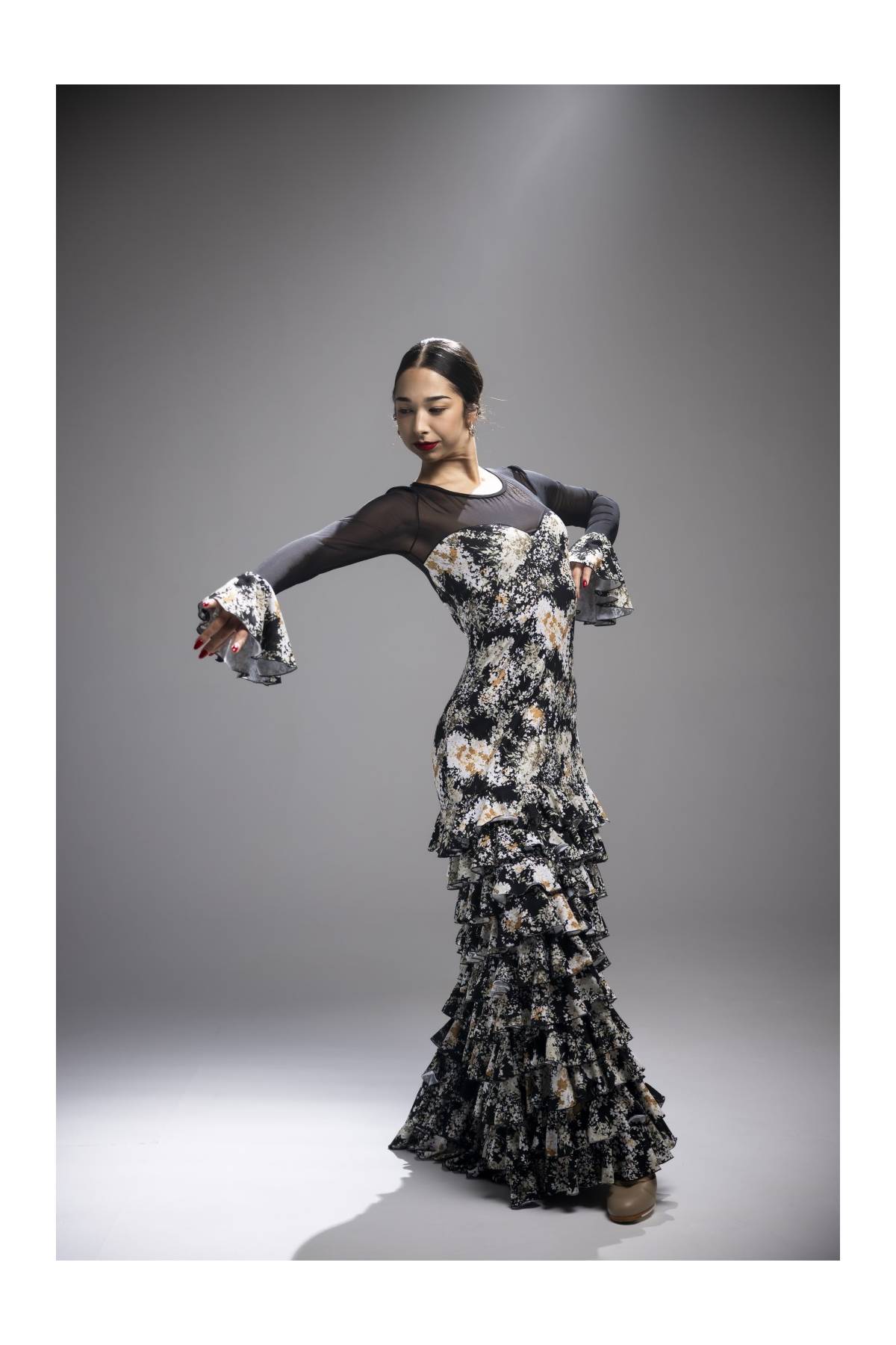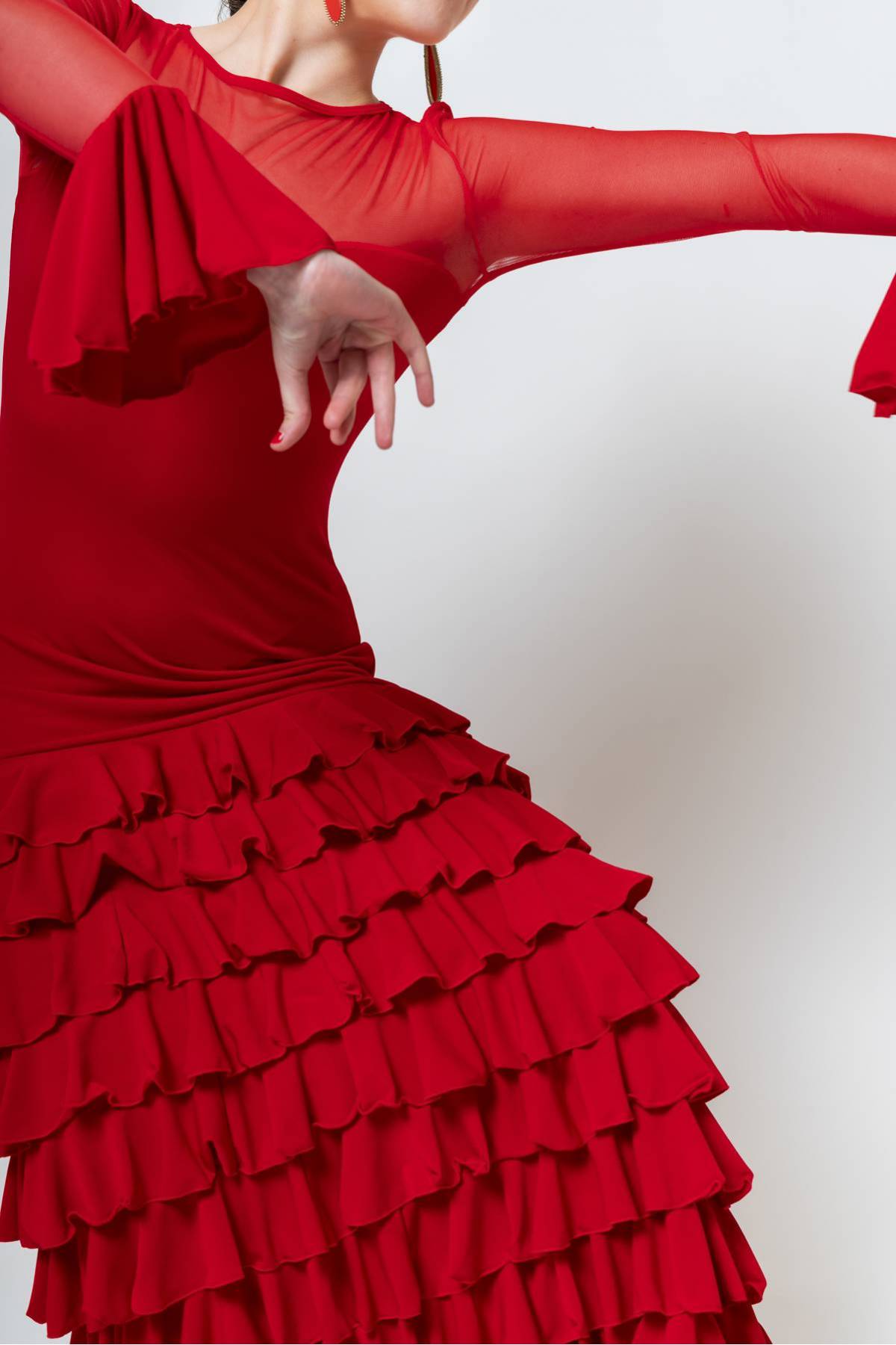 Vestido con 10 volantes de punto elástico, escote corazón con tul elástico y mangas con un volante