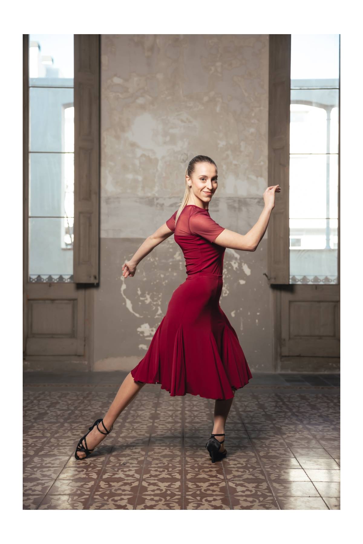 Top corto largo hasta la cadera. Escote ilusión de tul elástico con cuello redondo a la caja. Manga corta montada.