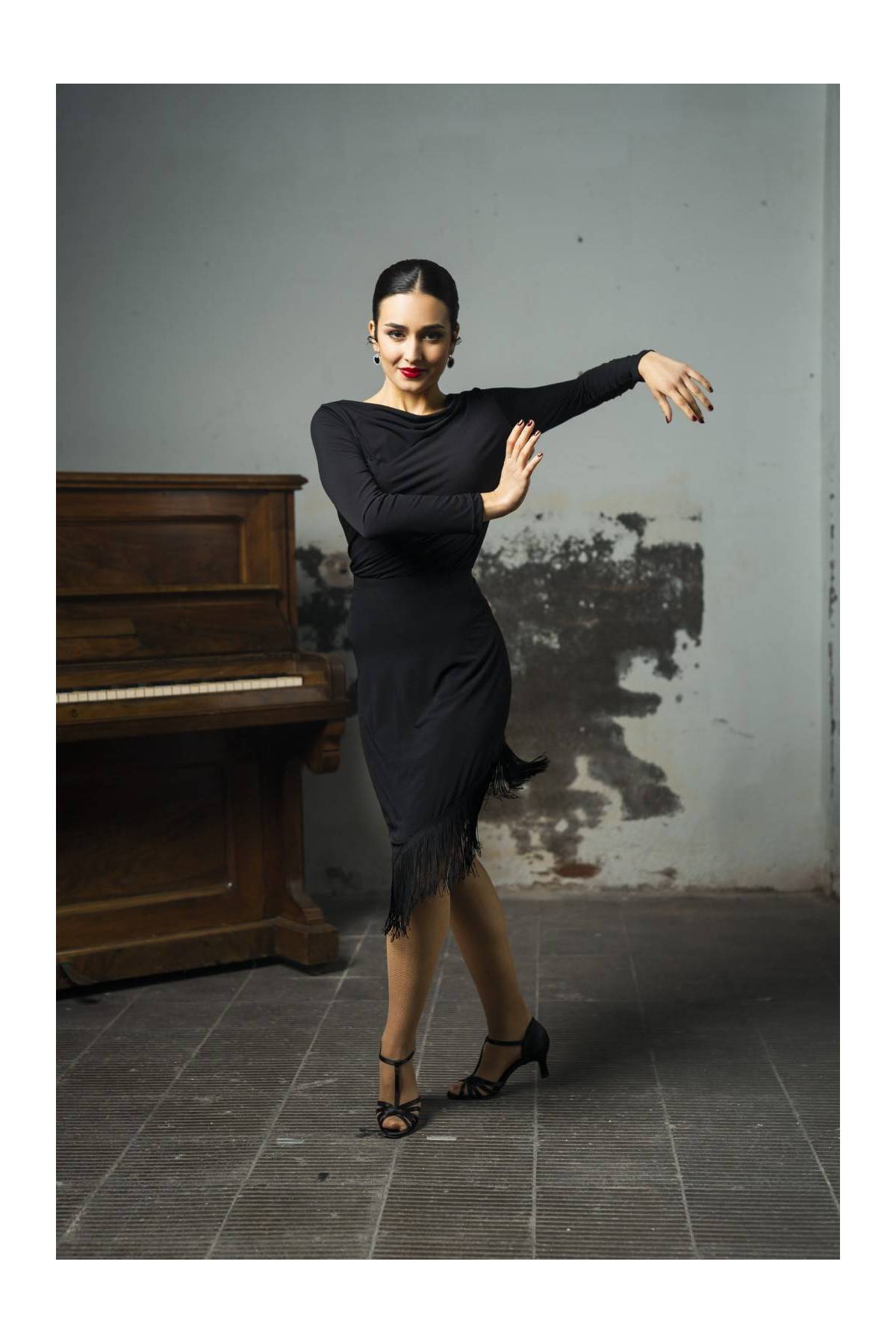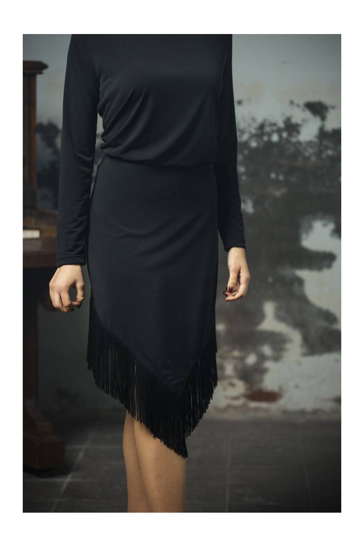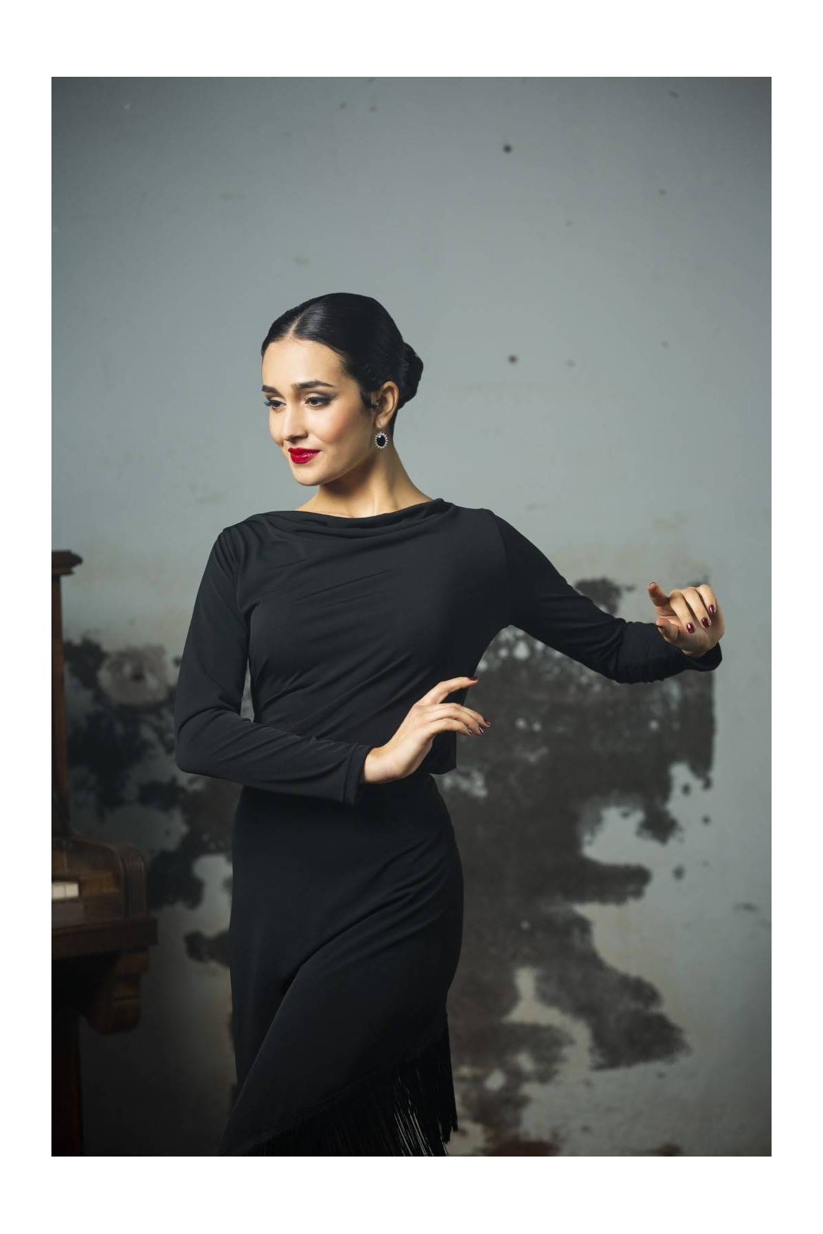 Top recto hasta media cadera de manga larga montada. Escote barca drapeado.