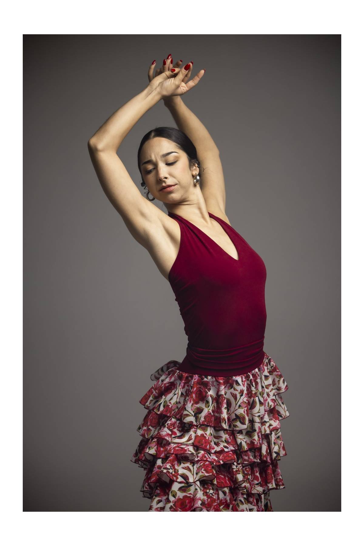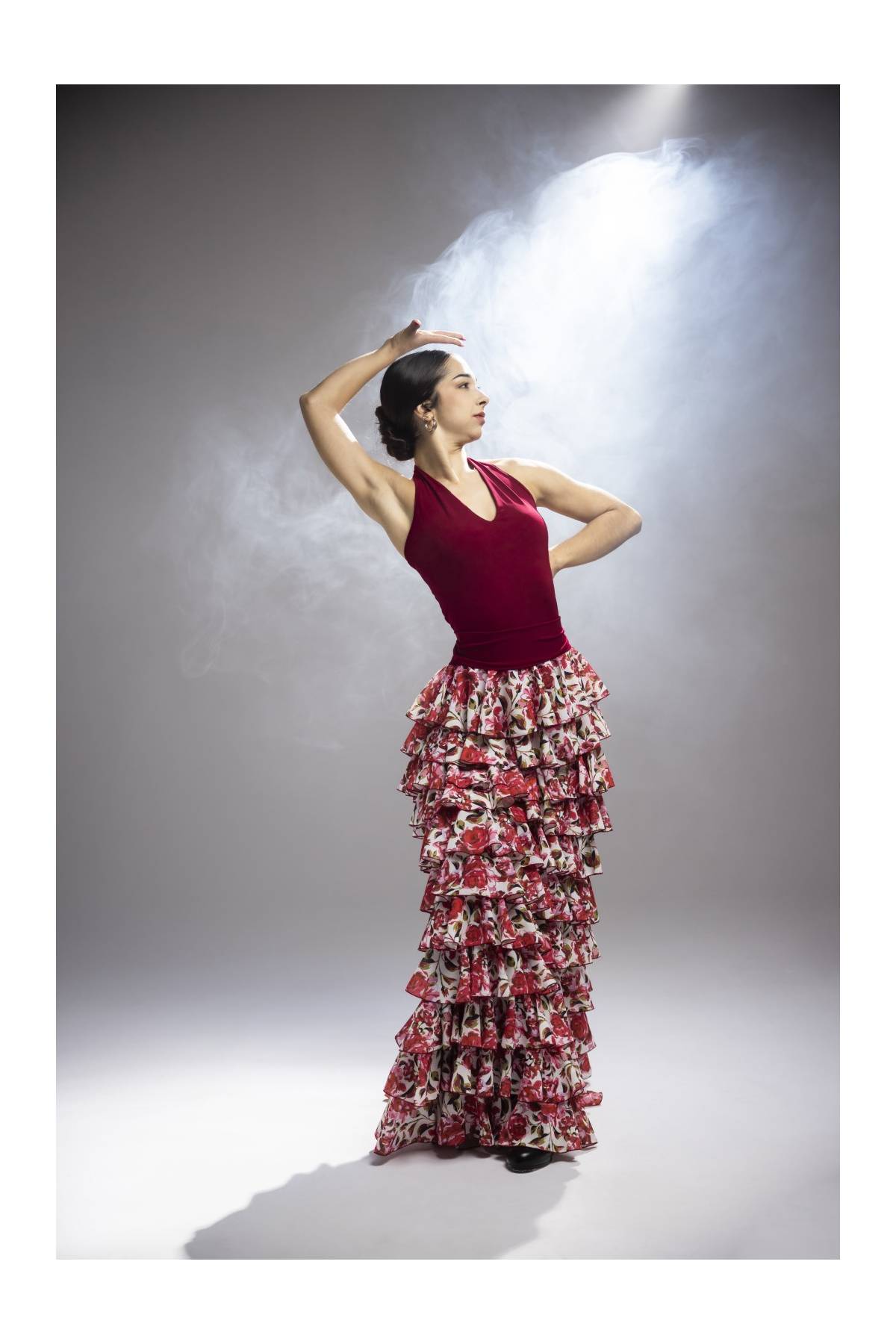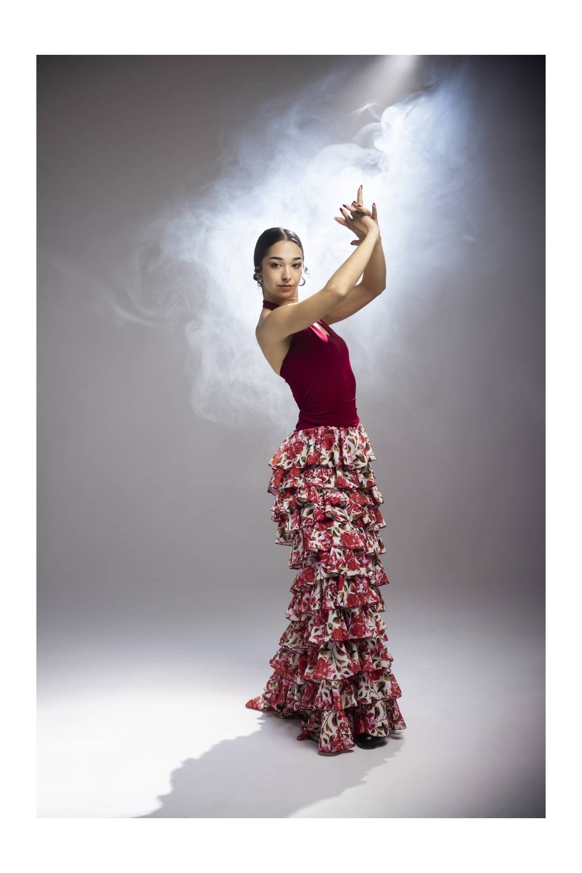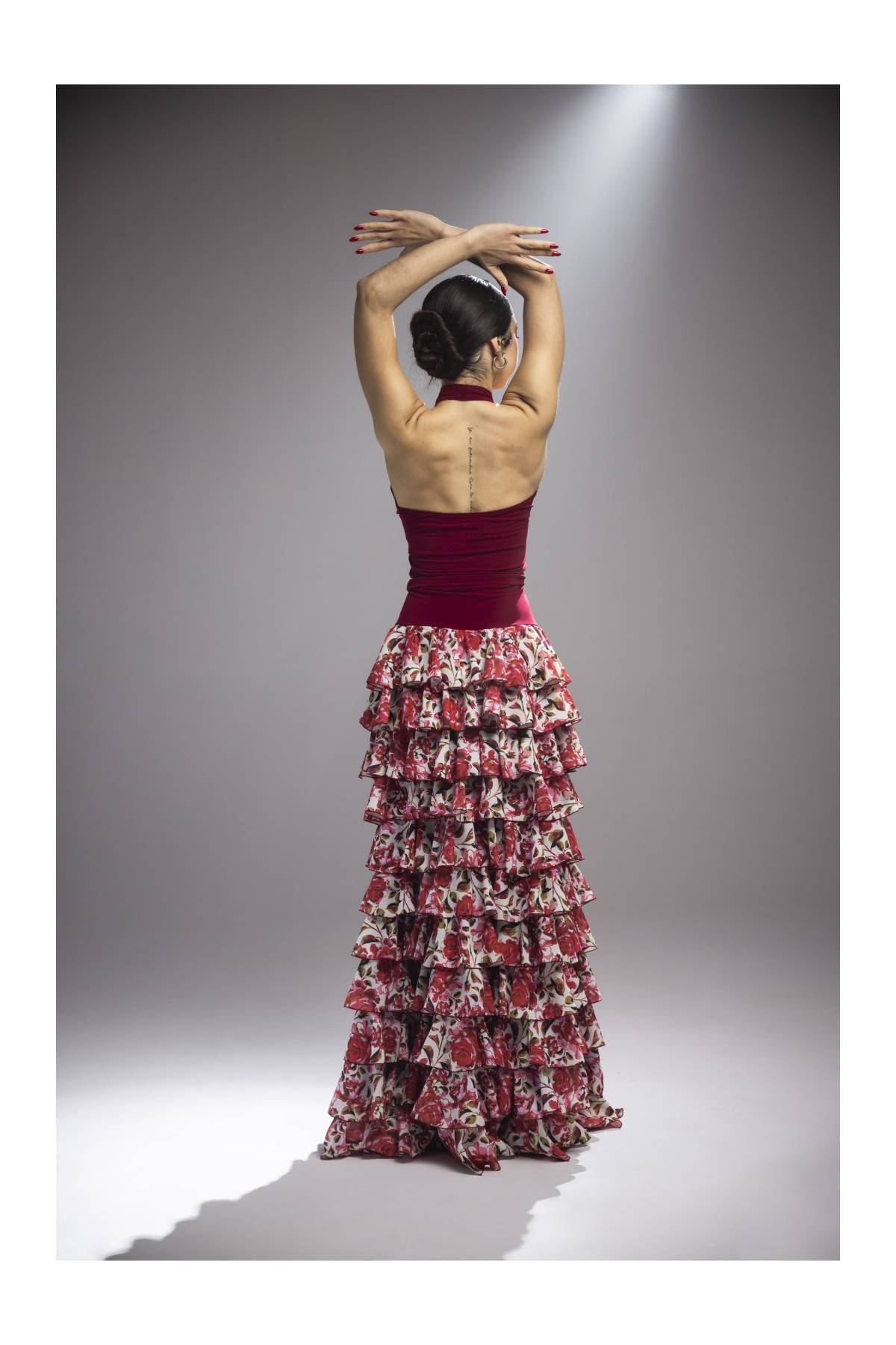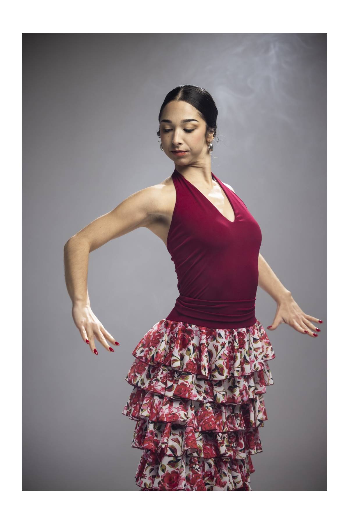 Top corto hasta cadera de tirantes. Entallado con escote halter acabado en V.