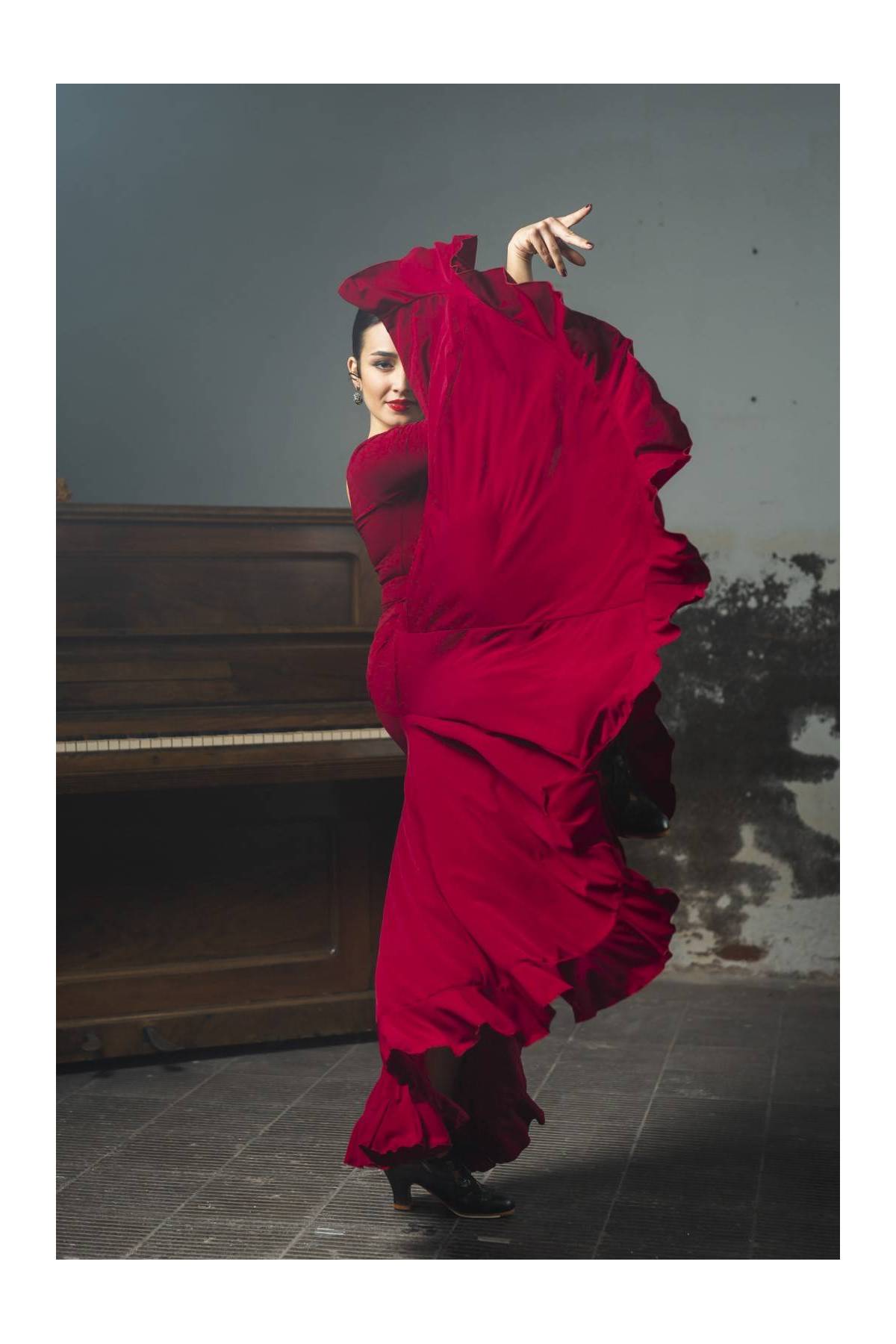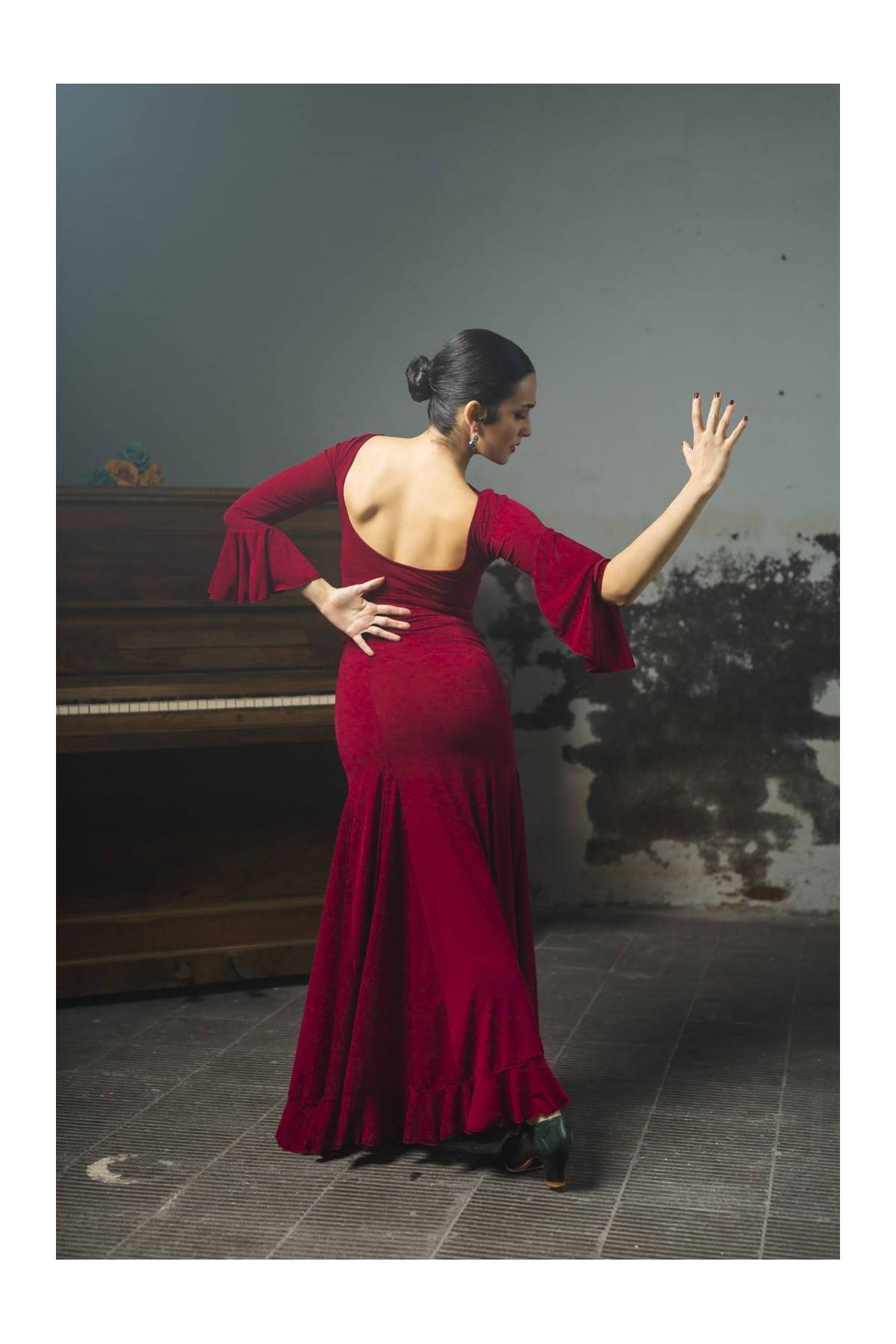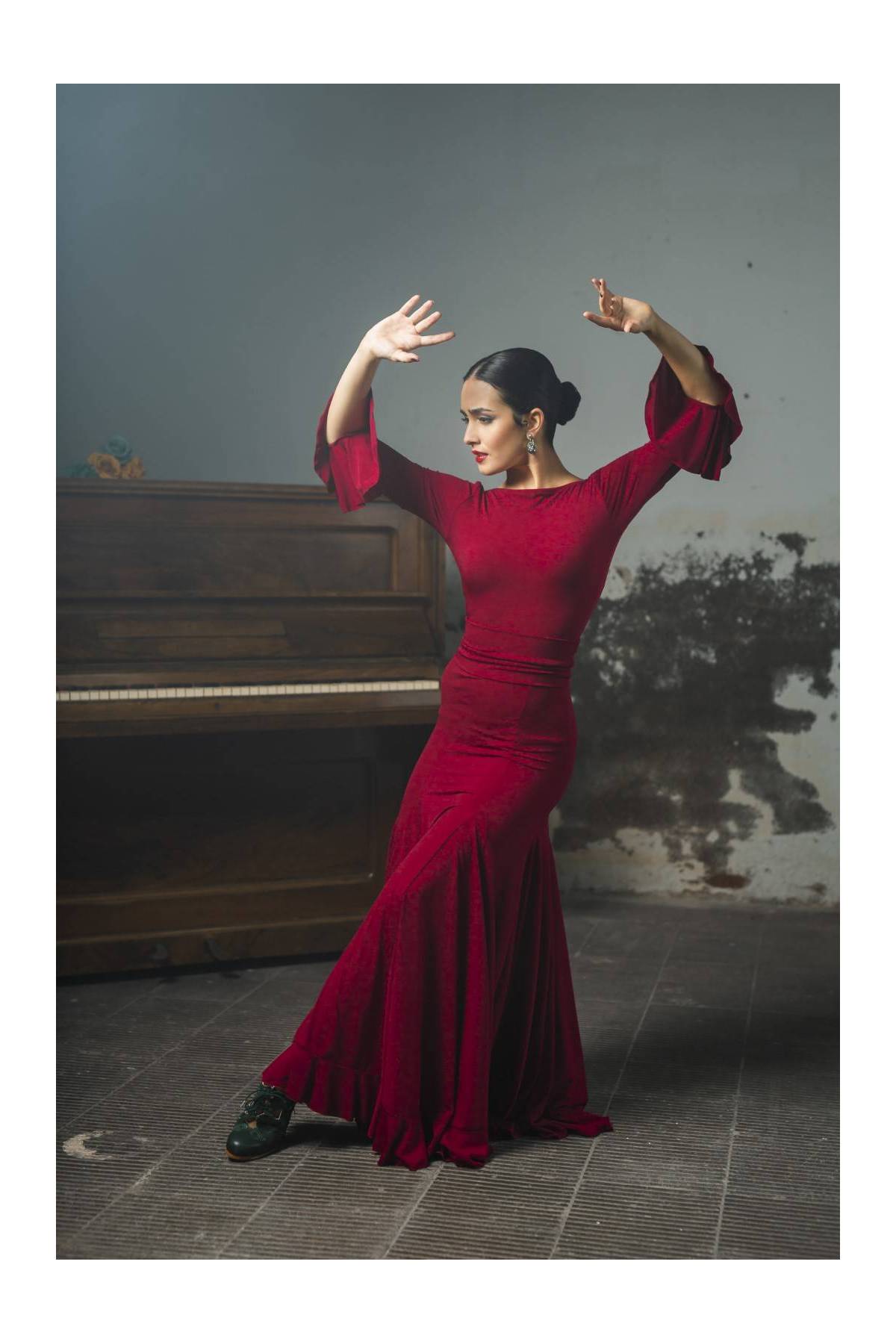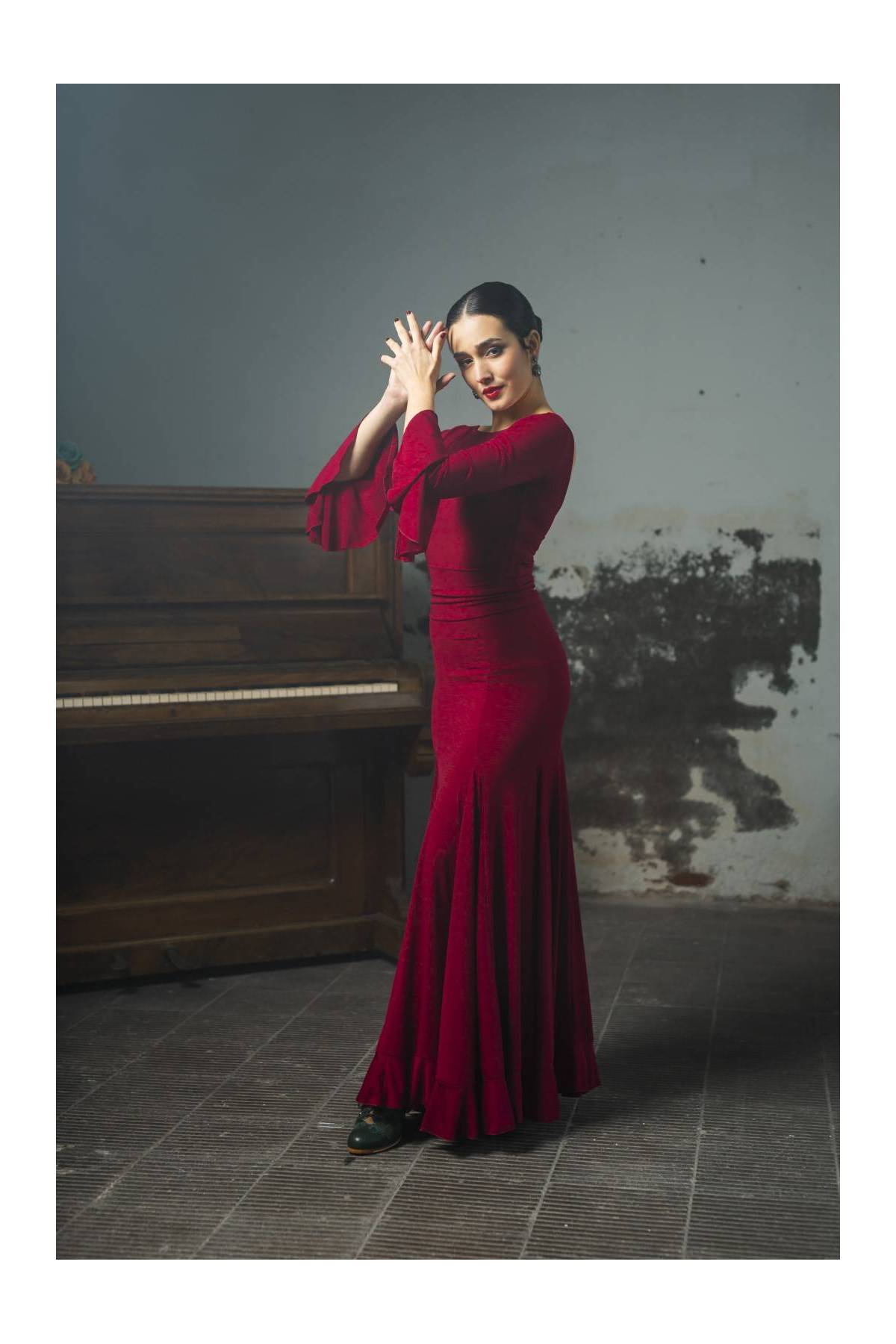 Falda larga con fajín. Costadillos con godets en las costuras, entallada en cadera. Aplicación de volantes en todo el contorno del bajo.
