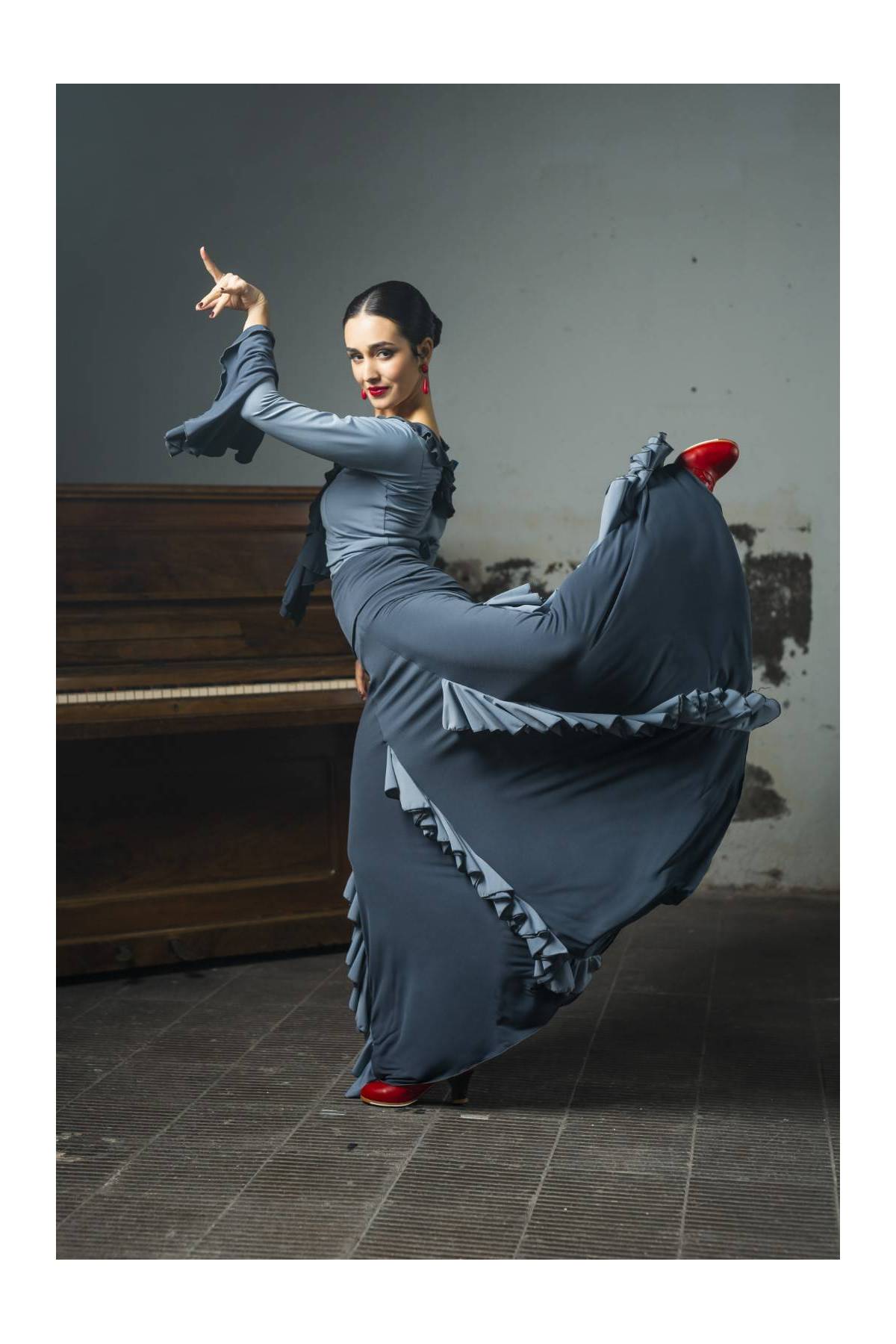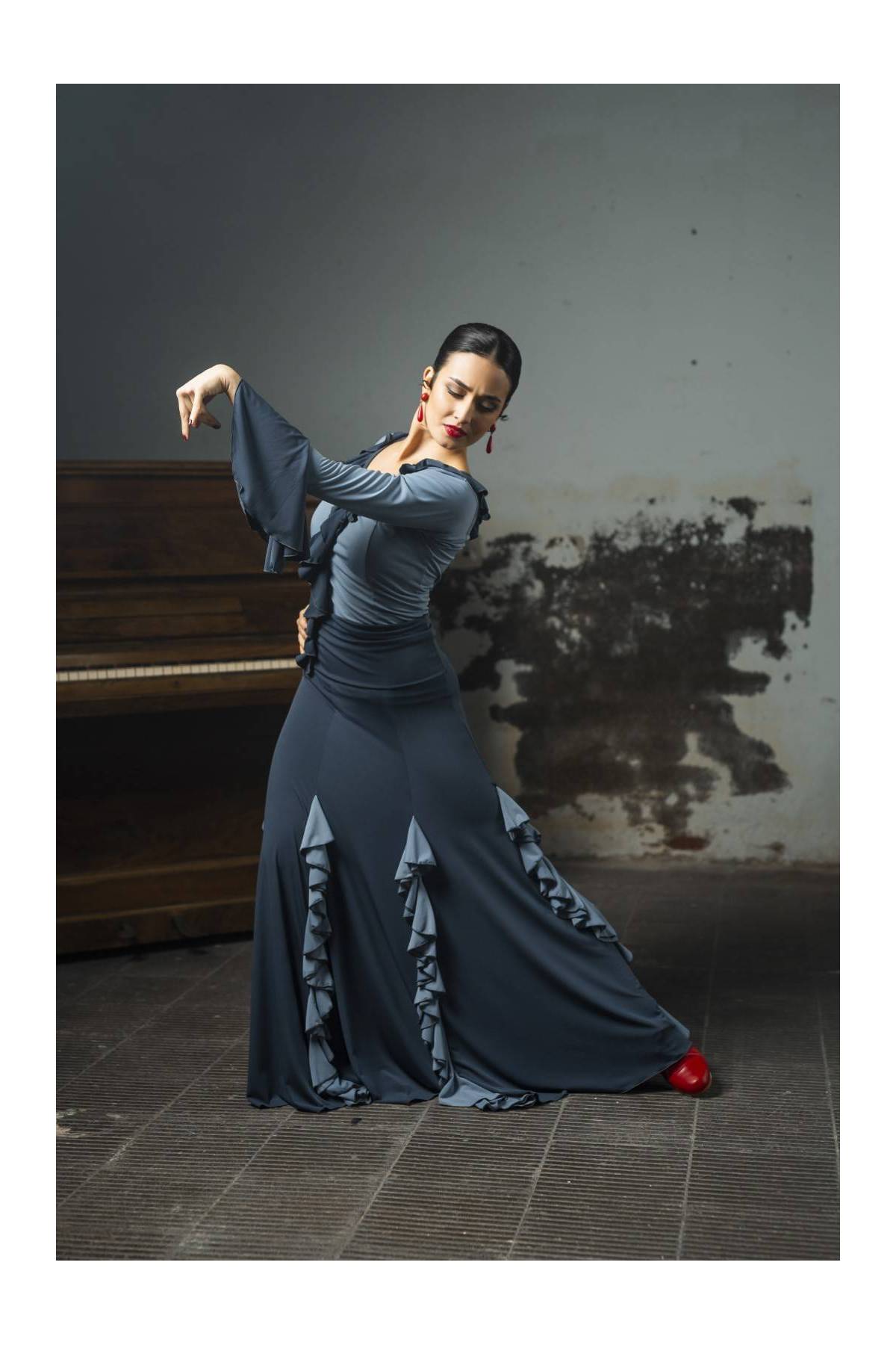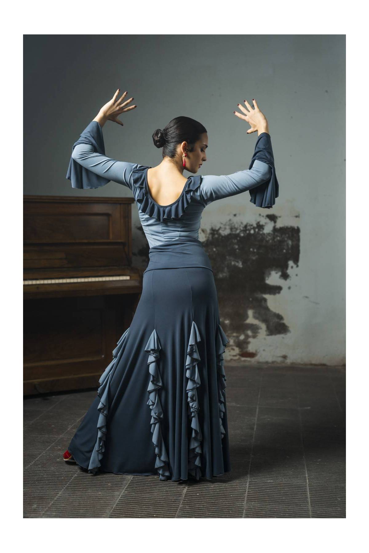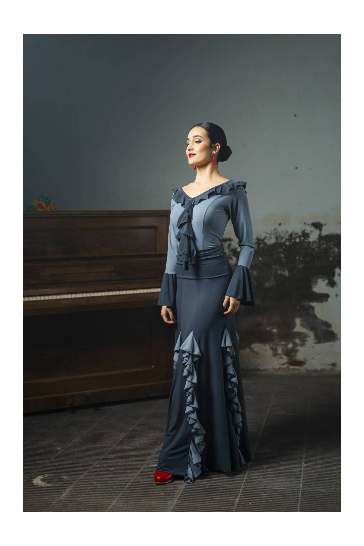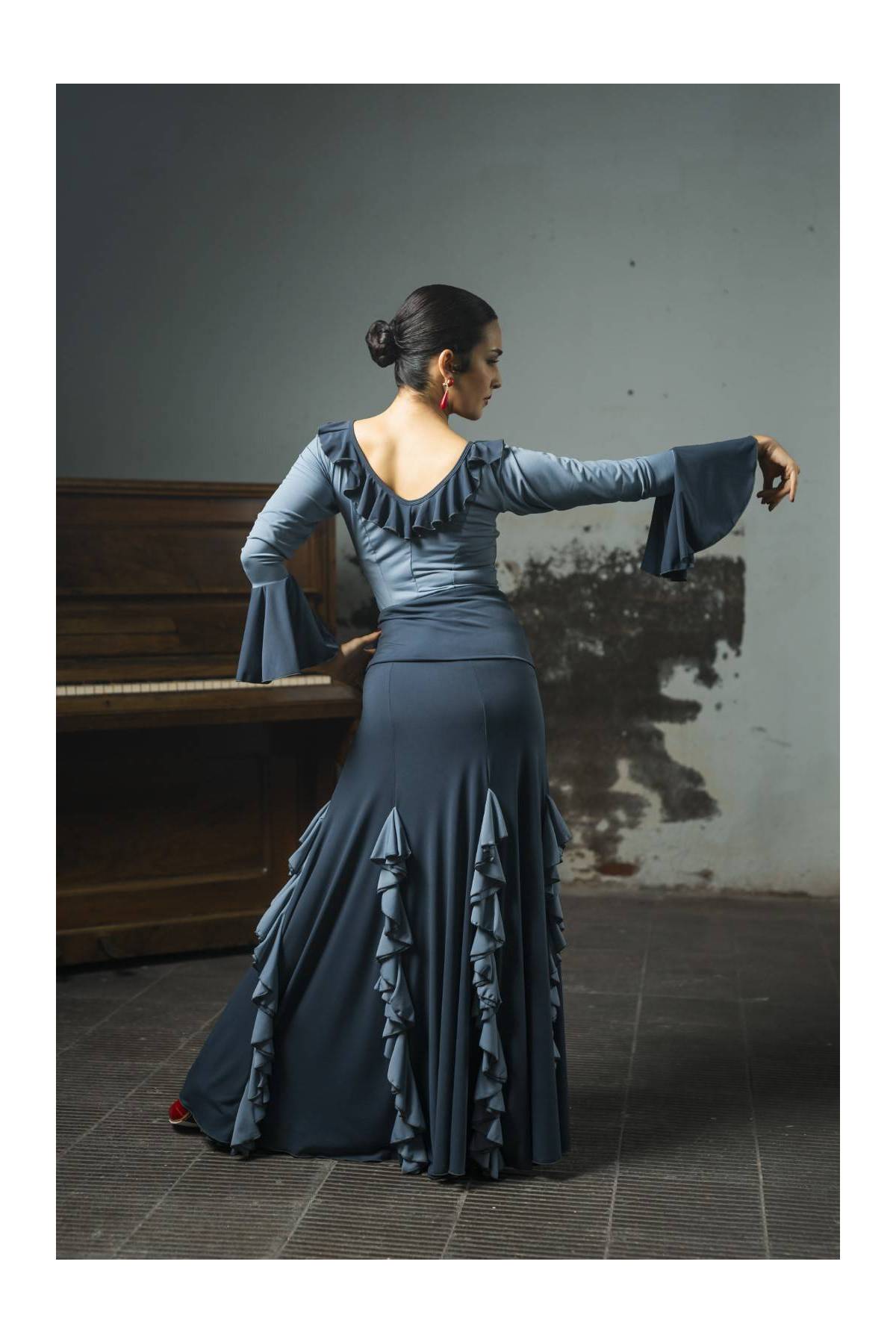 Top corto hasta cadera con escote en U con volantes más chorrera en el centro delantero. Costadillos laterales hasta sisa en delante. Escote pulido con vivo. Manga larga montada con un volante en el bajo