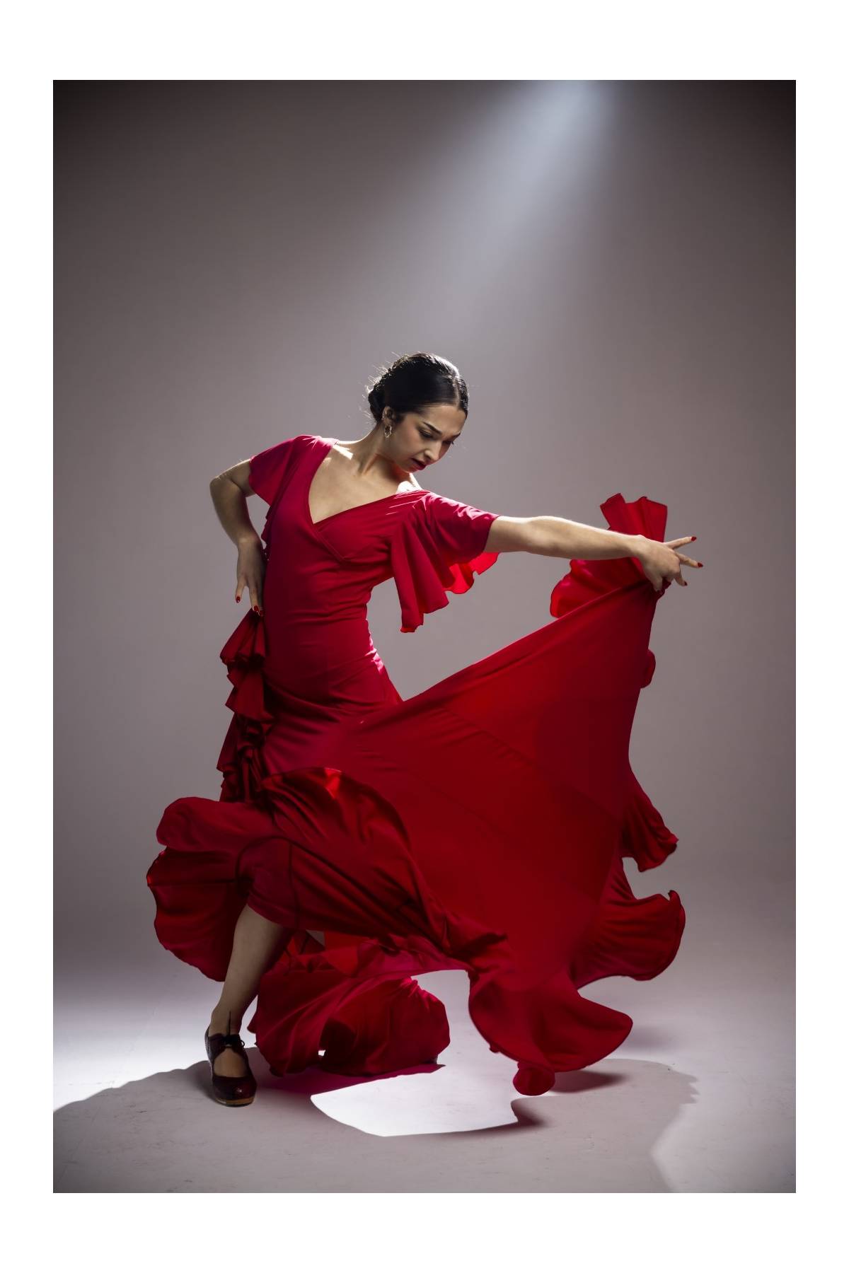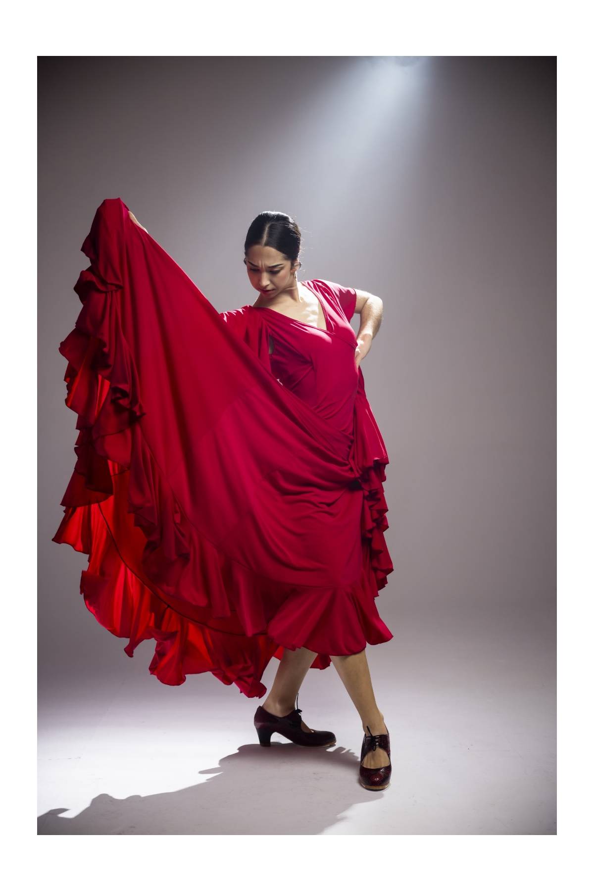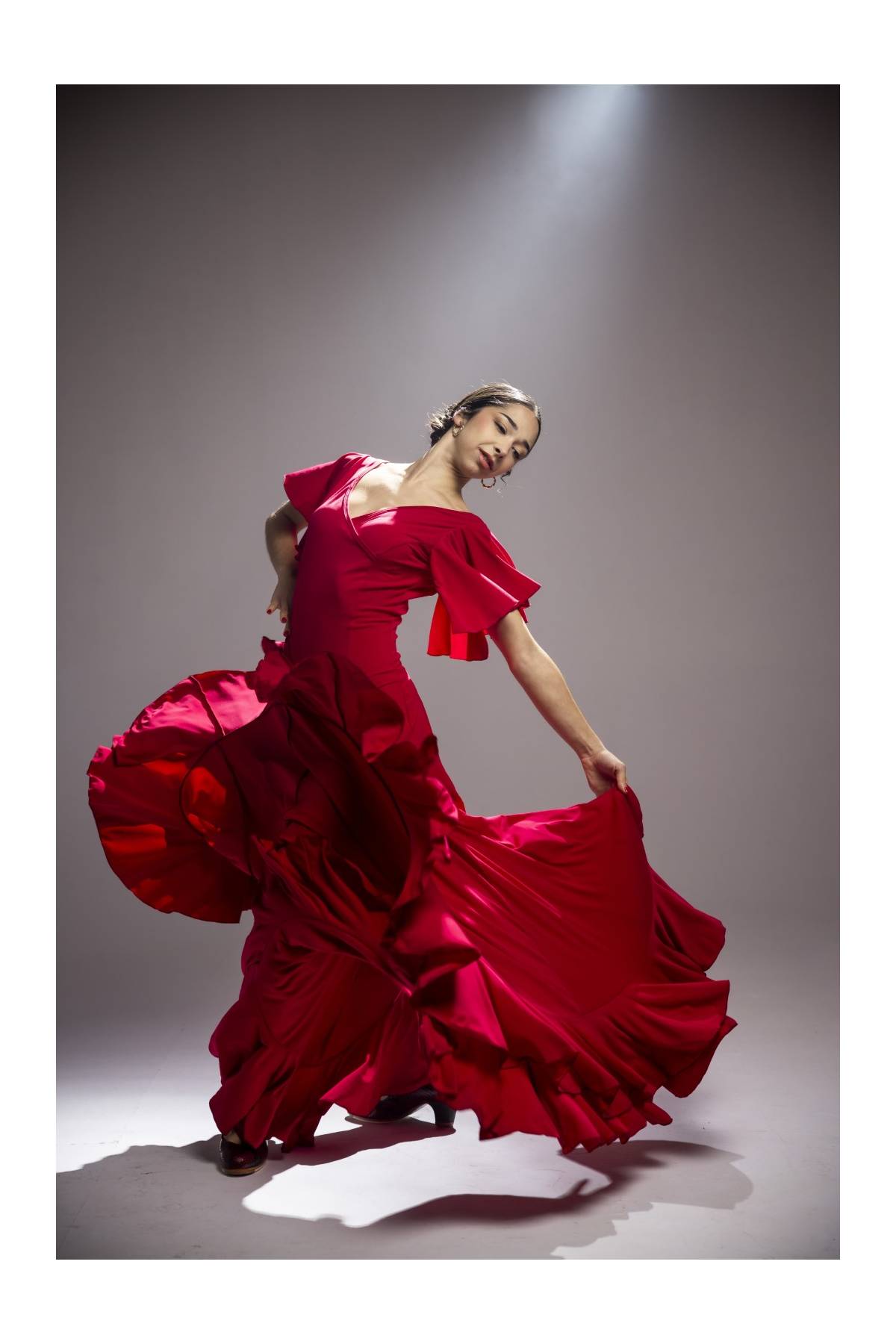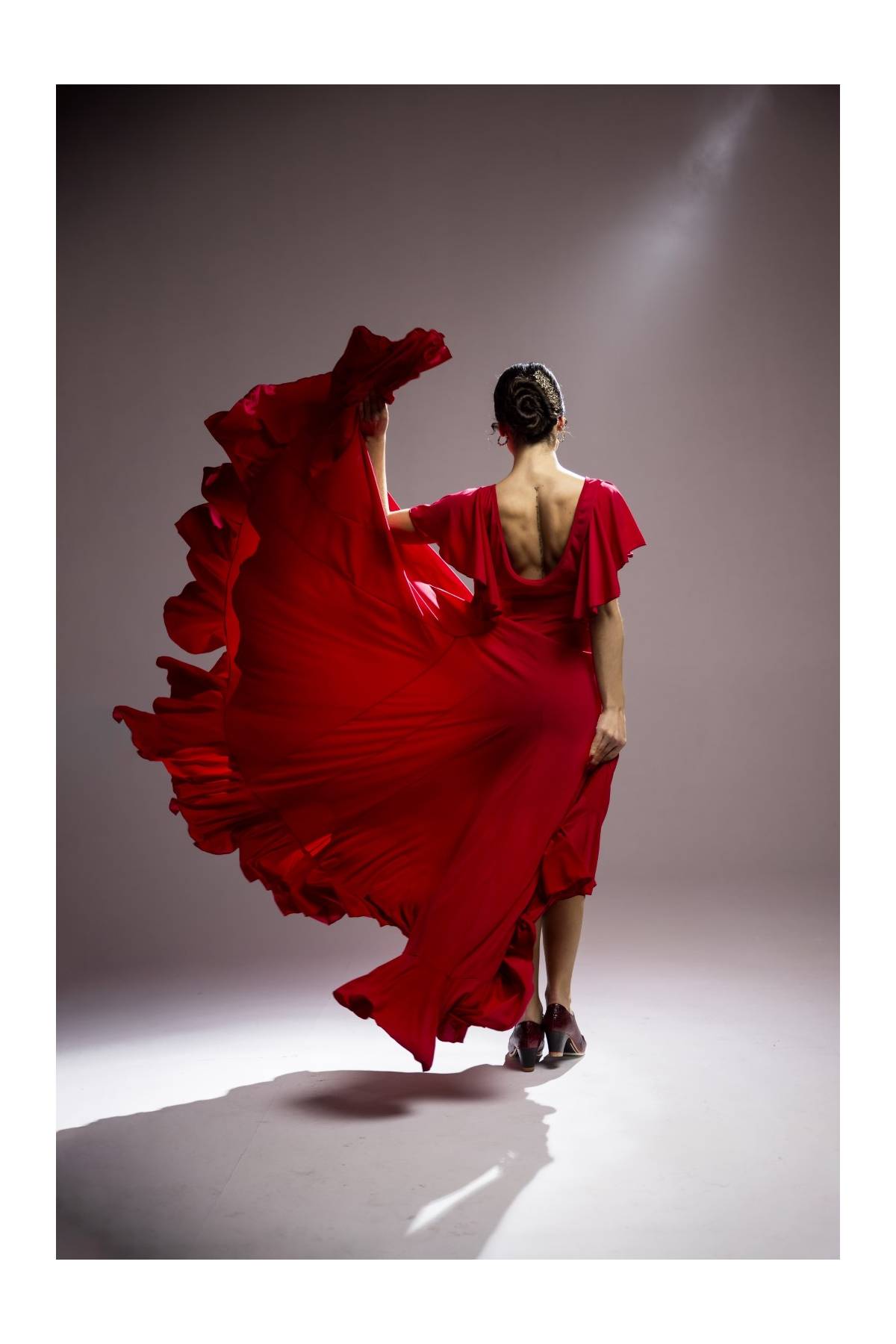 Vestido largo con escote delantero cruzado. Mangas montadas acampanadas. Godets en los laterales y costadillos. Volantes en todo el contorno del bajo.